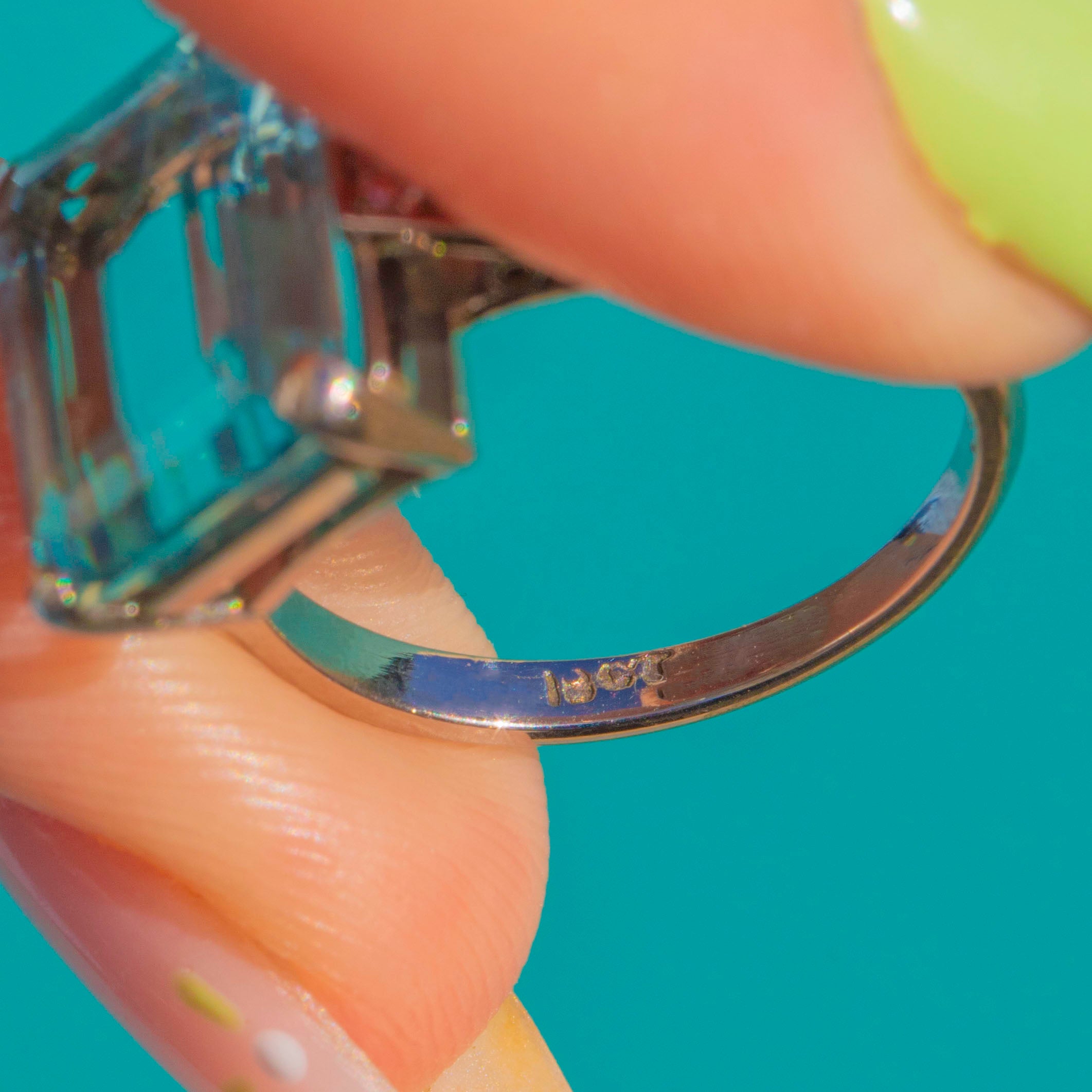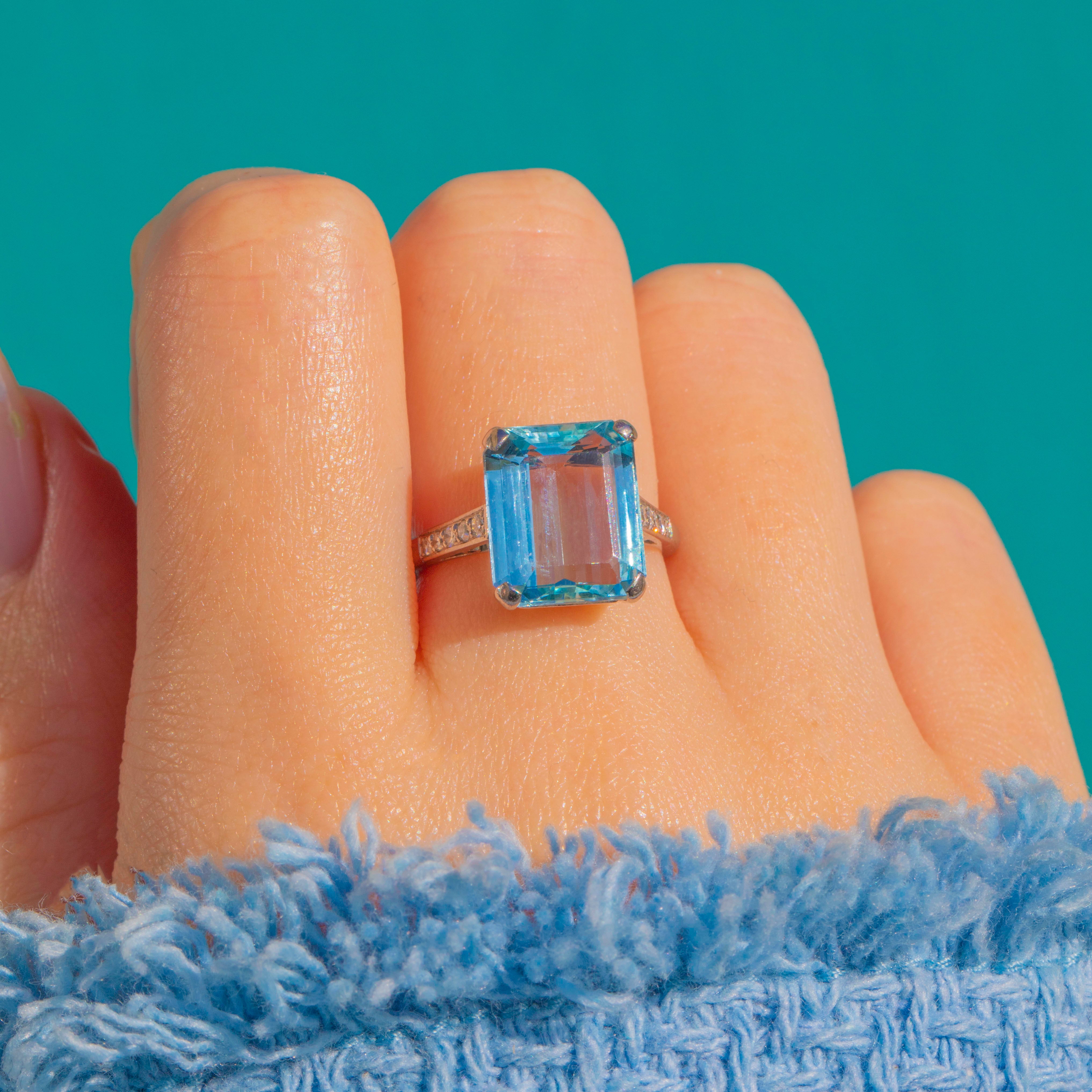 A breathtaking Vintage statement ring showcasing a luminous 8.00ct emerald-cut Aquamarine in sleek 18ct White Gold. The crisp four-corner setting and streamlined shoulders give this piece its elegant, architectural poise, while the Aquamarine’s cool sea-blue hue sits front and centre with captivating clarity.