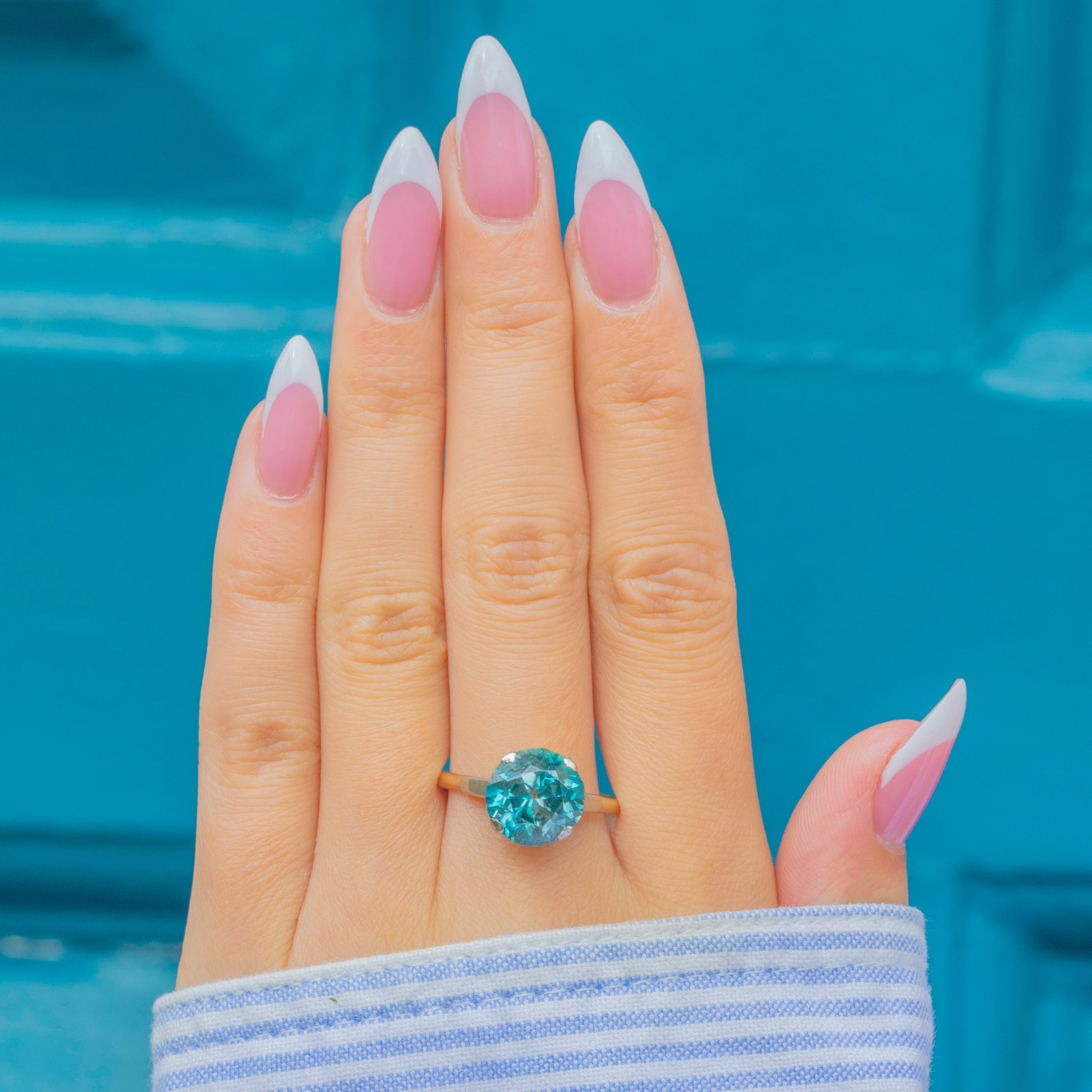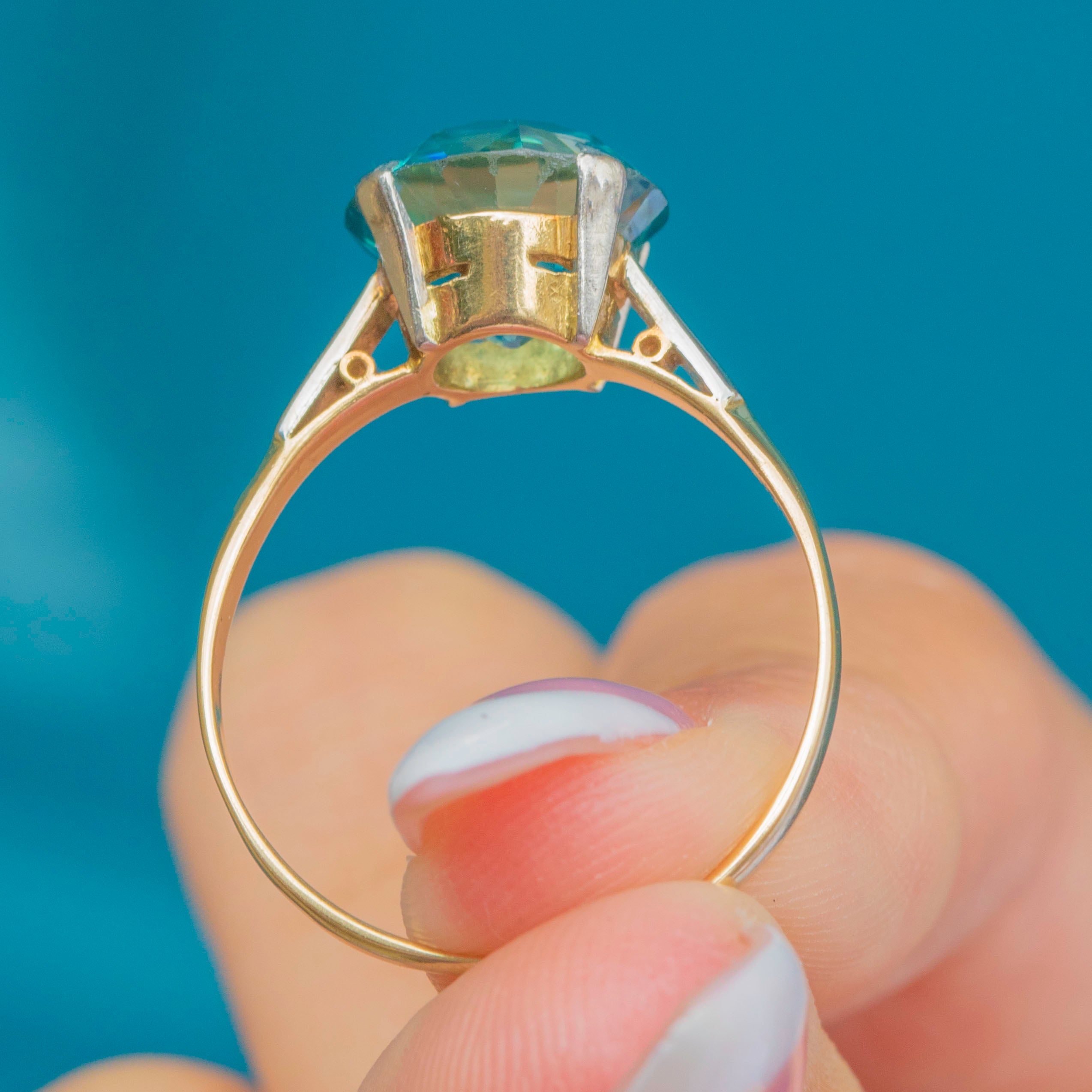 This bold Art Deco solitaire showcases a mesmerising Blue Zircon, prized for its vivid hue and exceptional brilliance. The round-cut stone is secured by sturdy Platinum claws, elevated above slim, tapering shoulders for maximum light play. The shoulders are crafted in Platinum for strength and contrast, flowing into a warm 18ct Gold band.