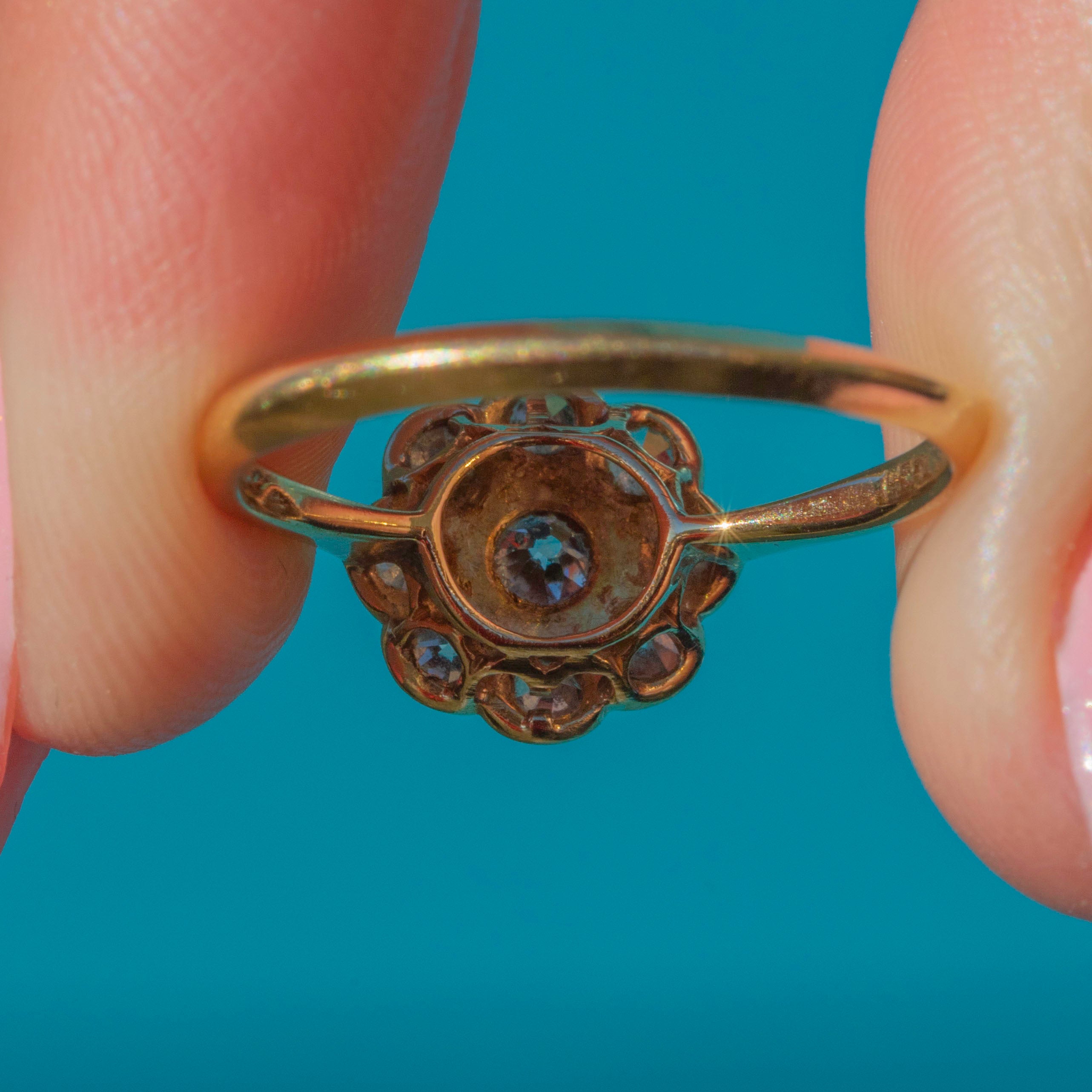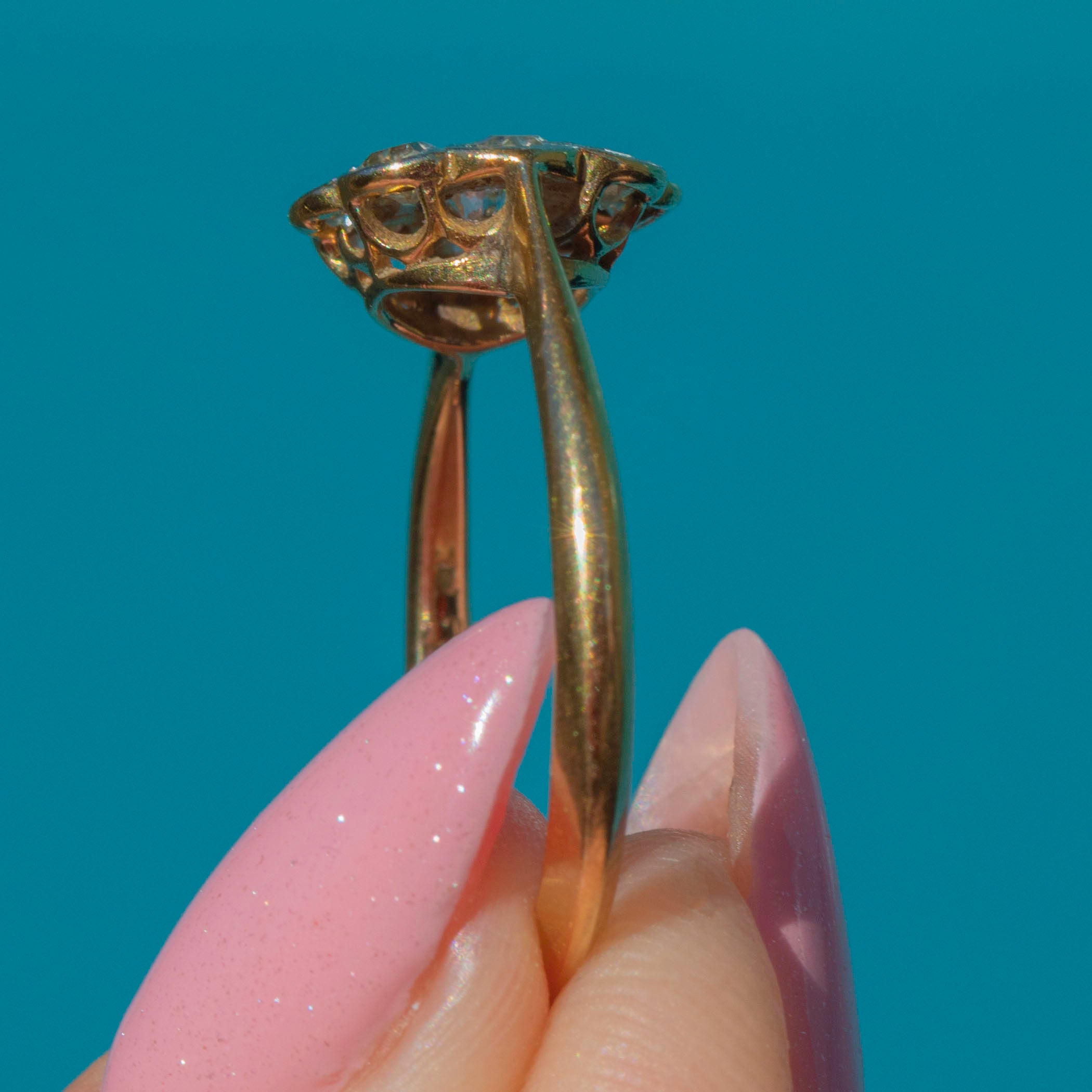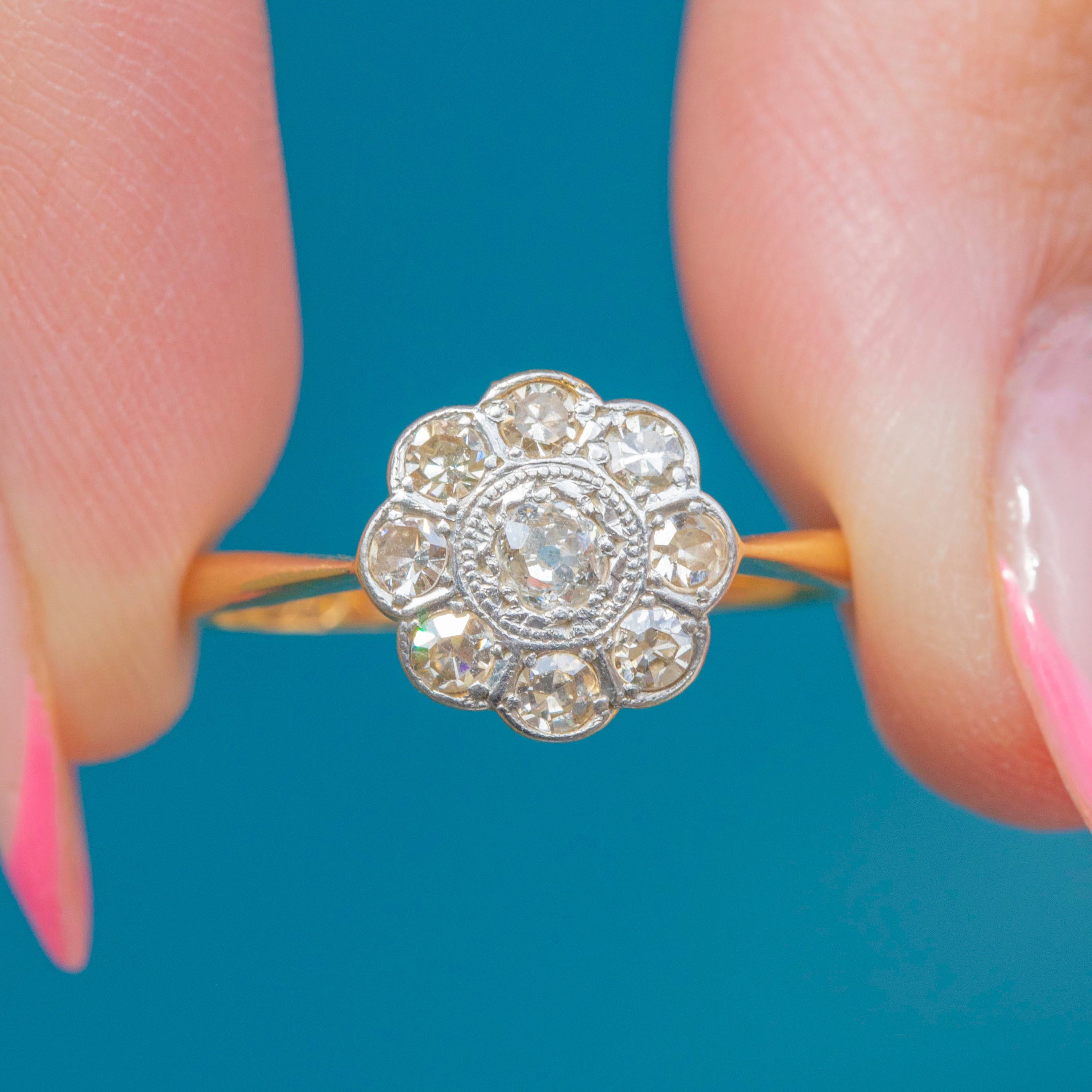 This is a gorgeous Art Deco 18ct Gold Diamond daisy cluster ring! This Art Deco delight has been crafted from solid 18ct yellow Gold and showcases a feminine daisy cluster of Diamonds set in Platinum.