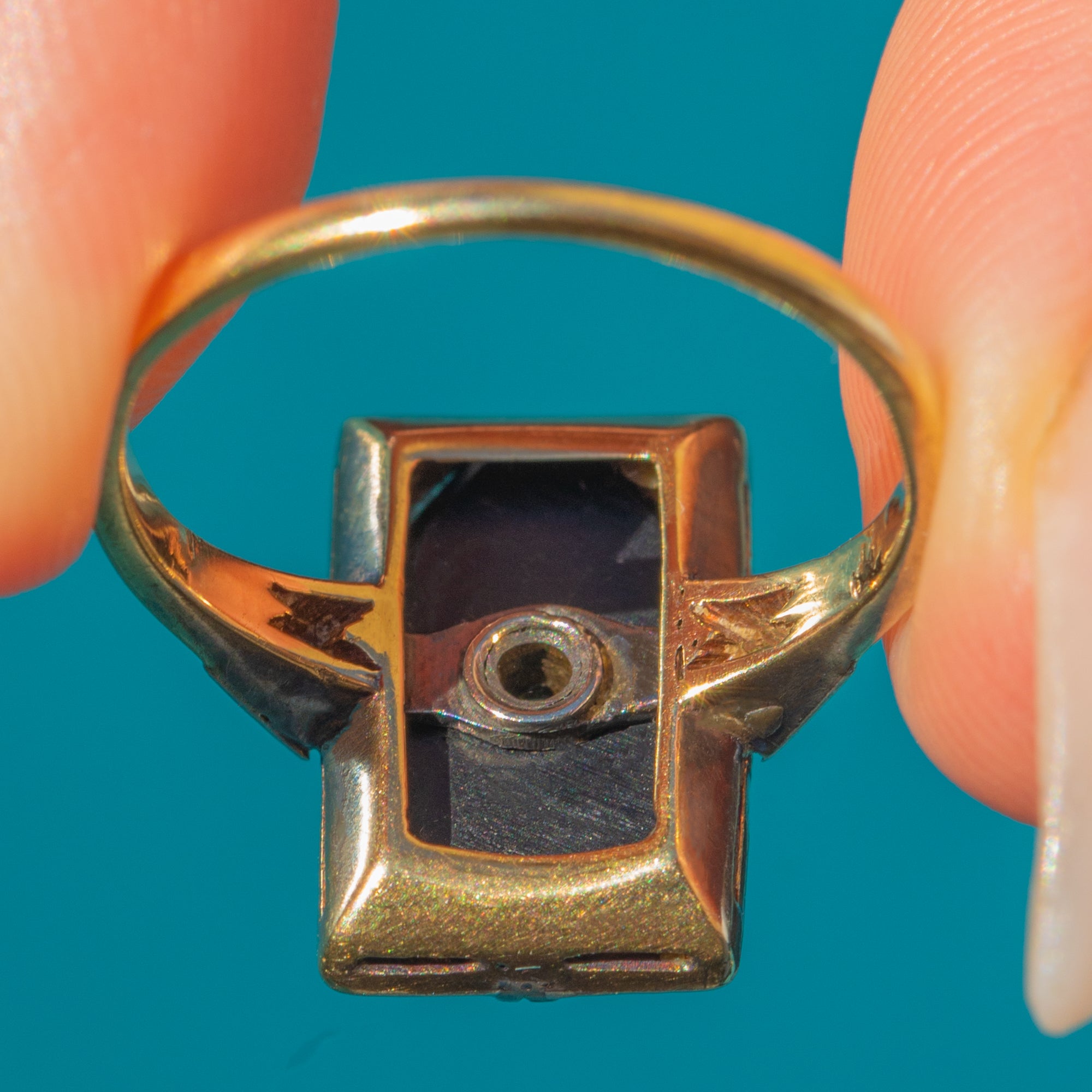 EXCELLENT: The ring is in excellent antique condition. The Diamonds are bright and secure, with no chips or abrasions. The Onyx panel is crisp with clean edges. The shoulders and band are smooth and free from wear, making this a particularly well-preserved example.