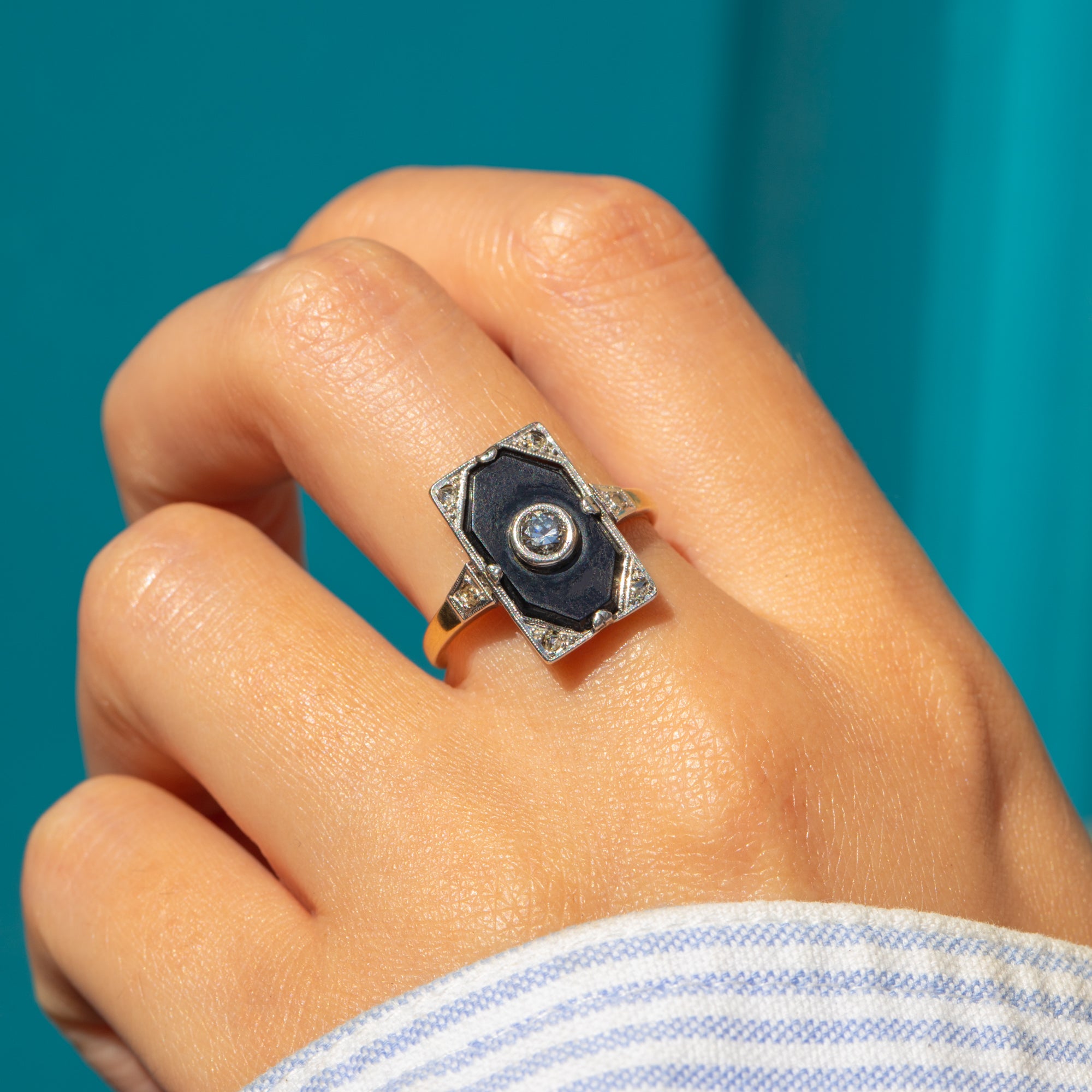 This bold Art Deco panel ring displays a sparkling Diamond set against a dramatic Onyx backdrop. The rectangular panel design is classic of the period, showcasing the geometric style and monochrome contrasts that defined the 1920s and 1930s.