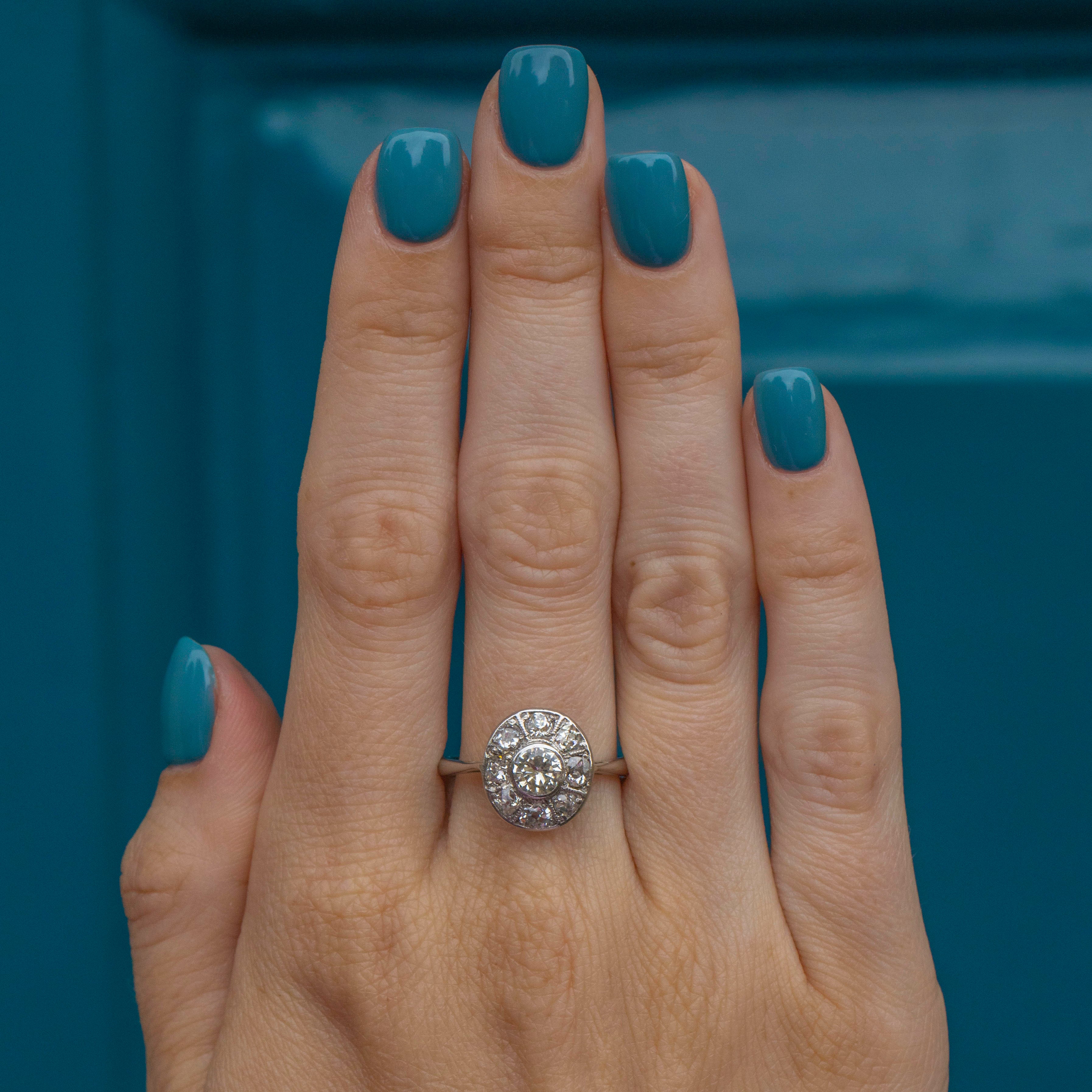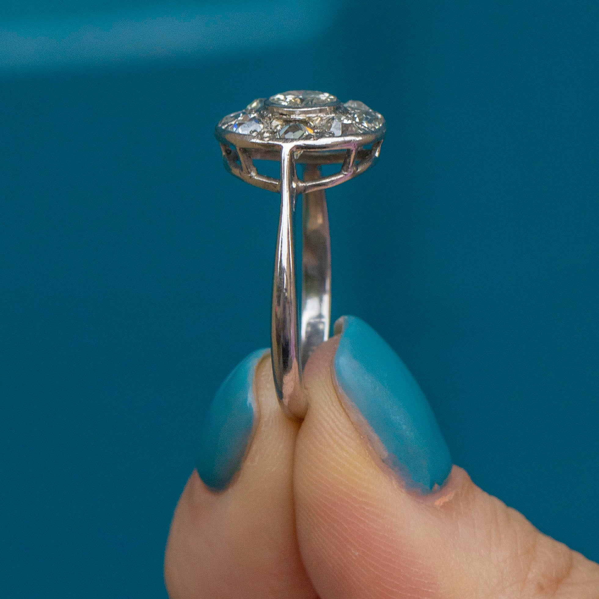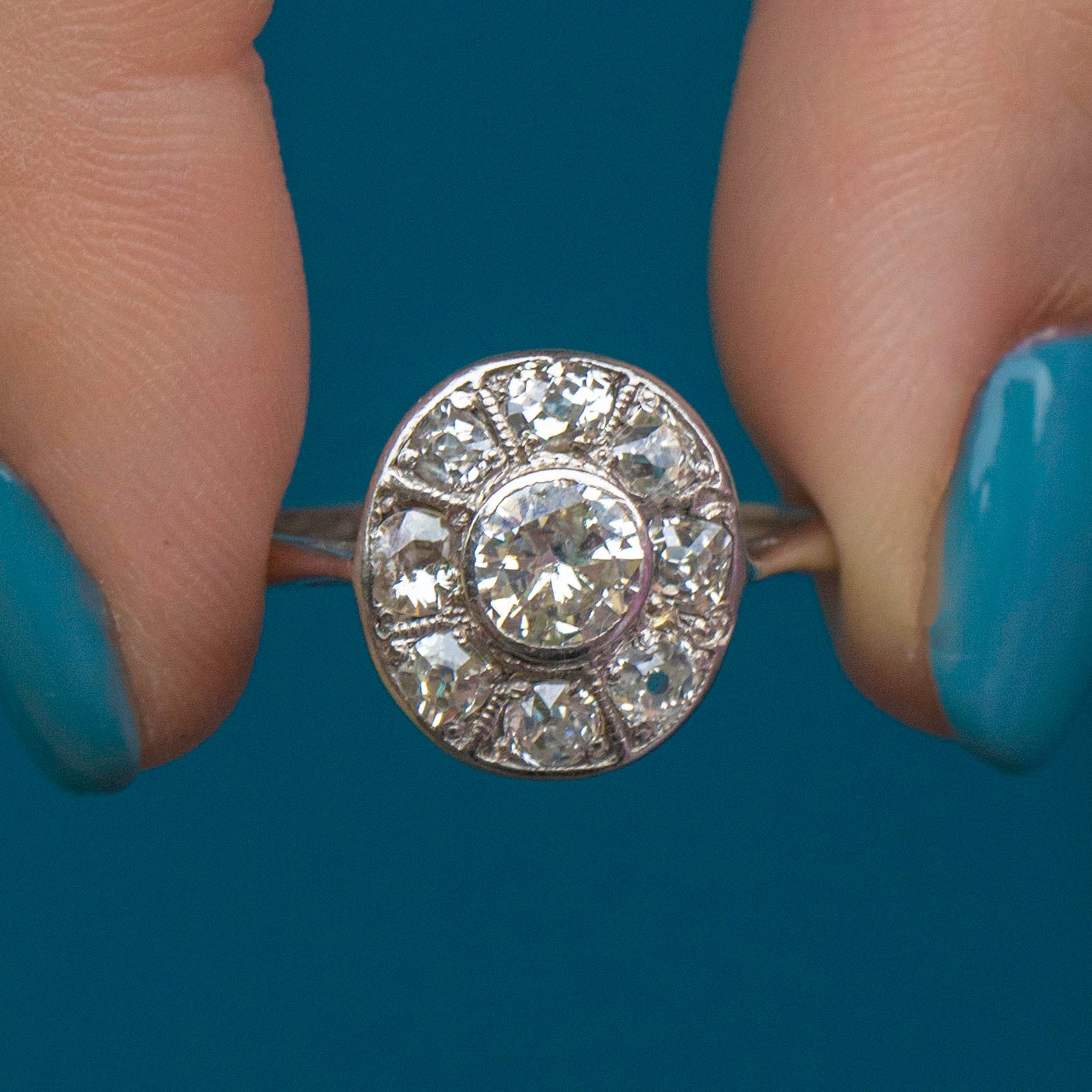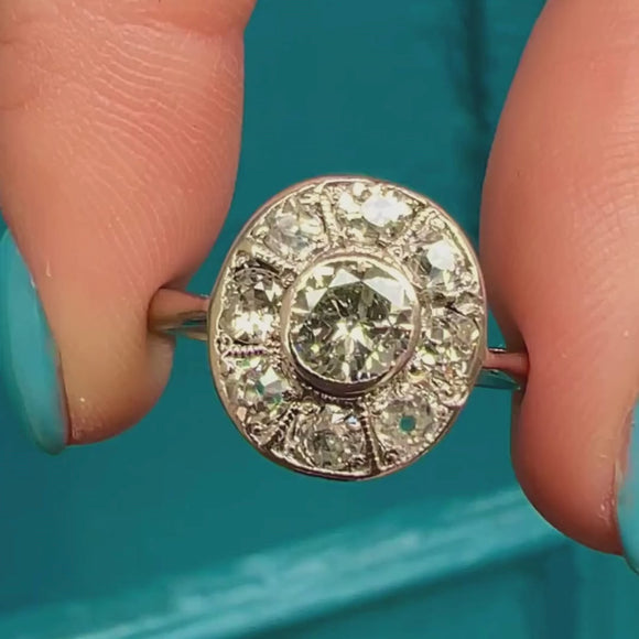 If you have a penchant for scintillating treasures, this exquisite Art Deco 18ct Gold Diamond oval cluster ring was made for you! The dazzling 0.40ct brilliant-cut central Diamond is haloed by eight old mine-cut Diamonds that glisten elegantly, enchanting all who view her.