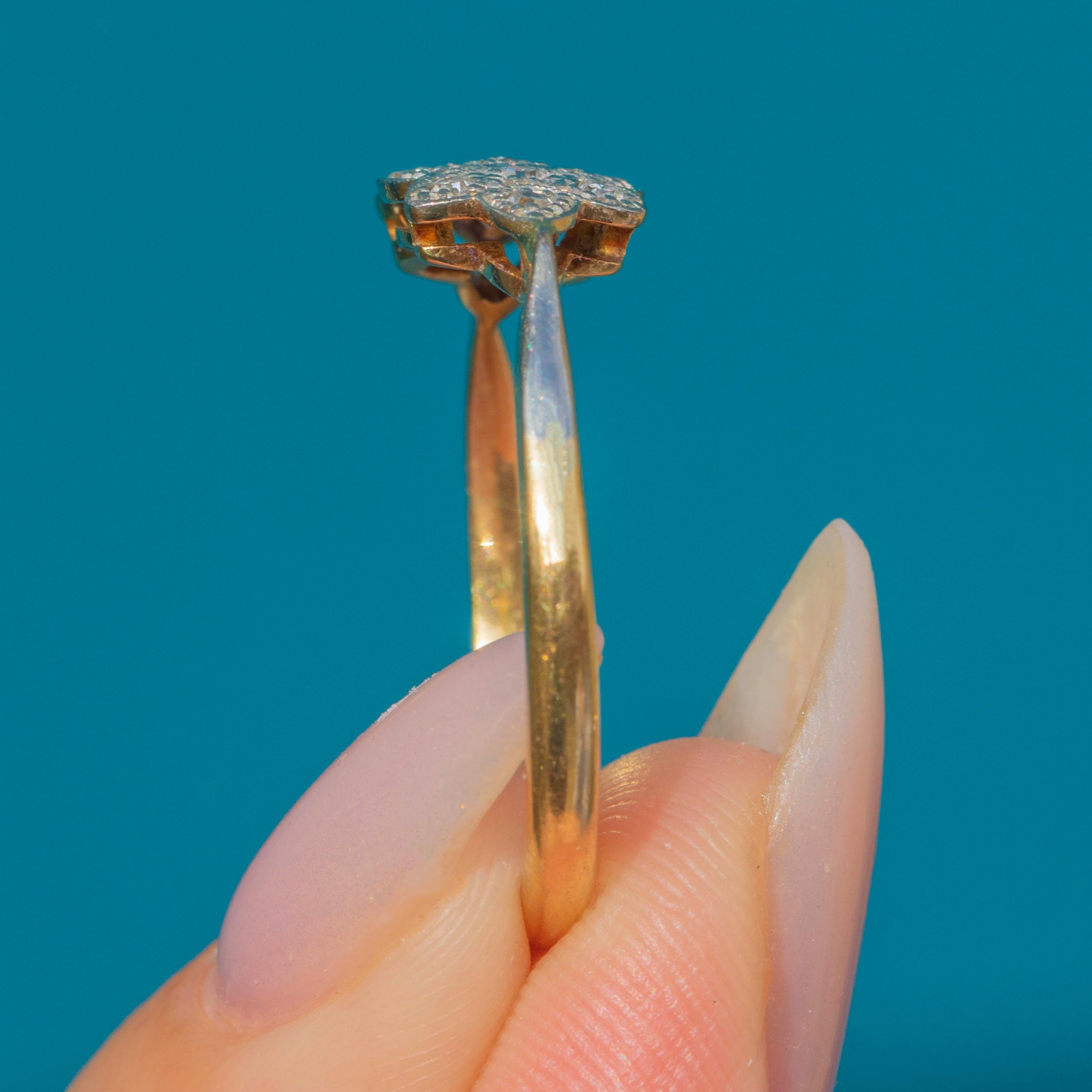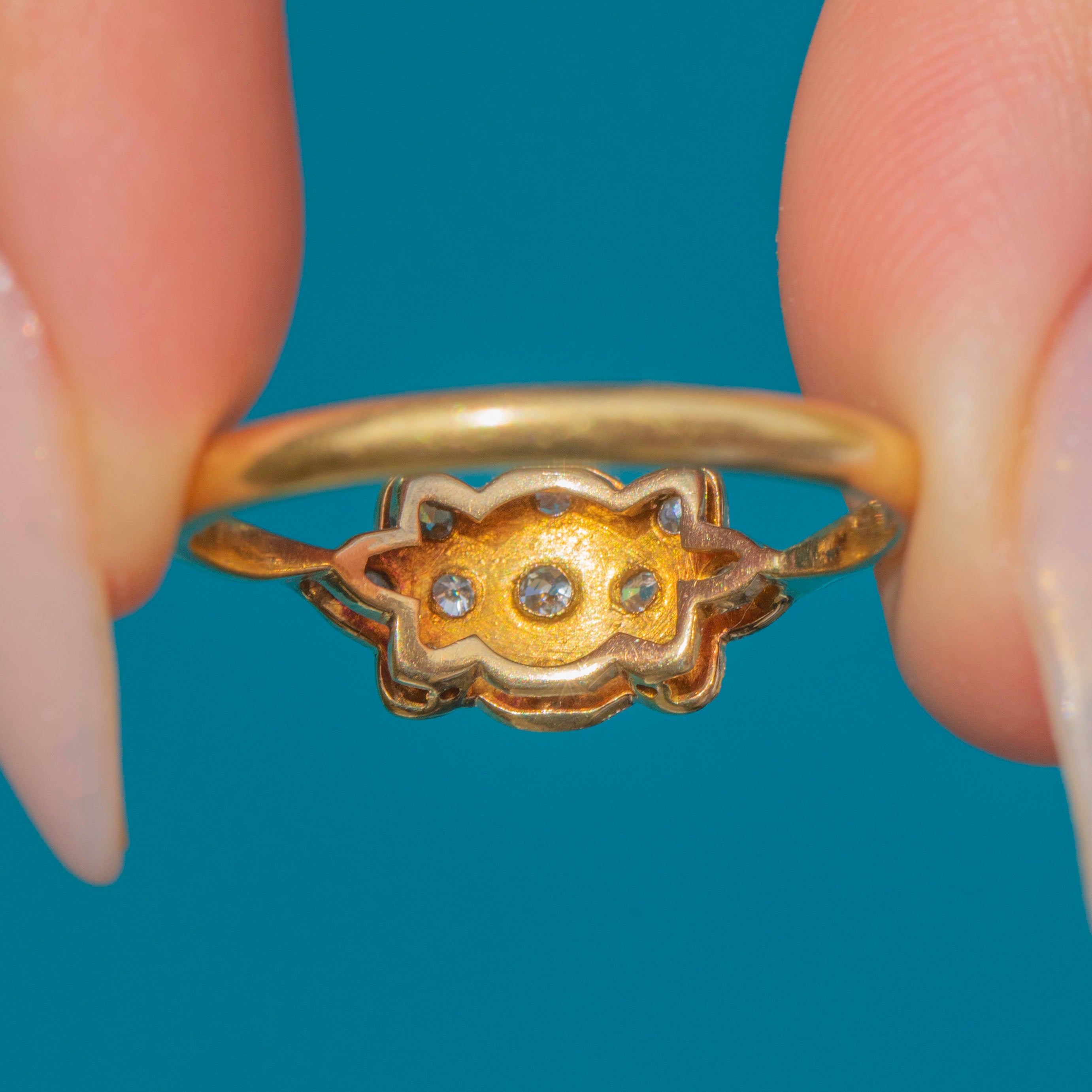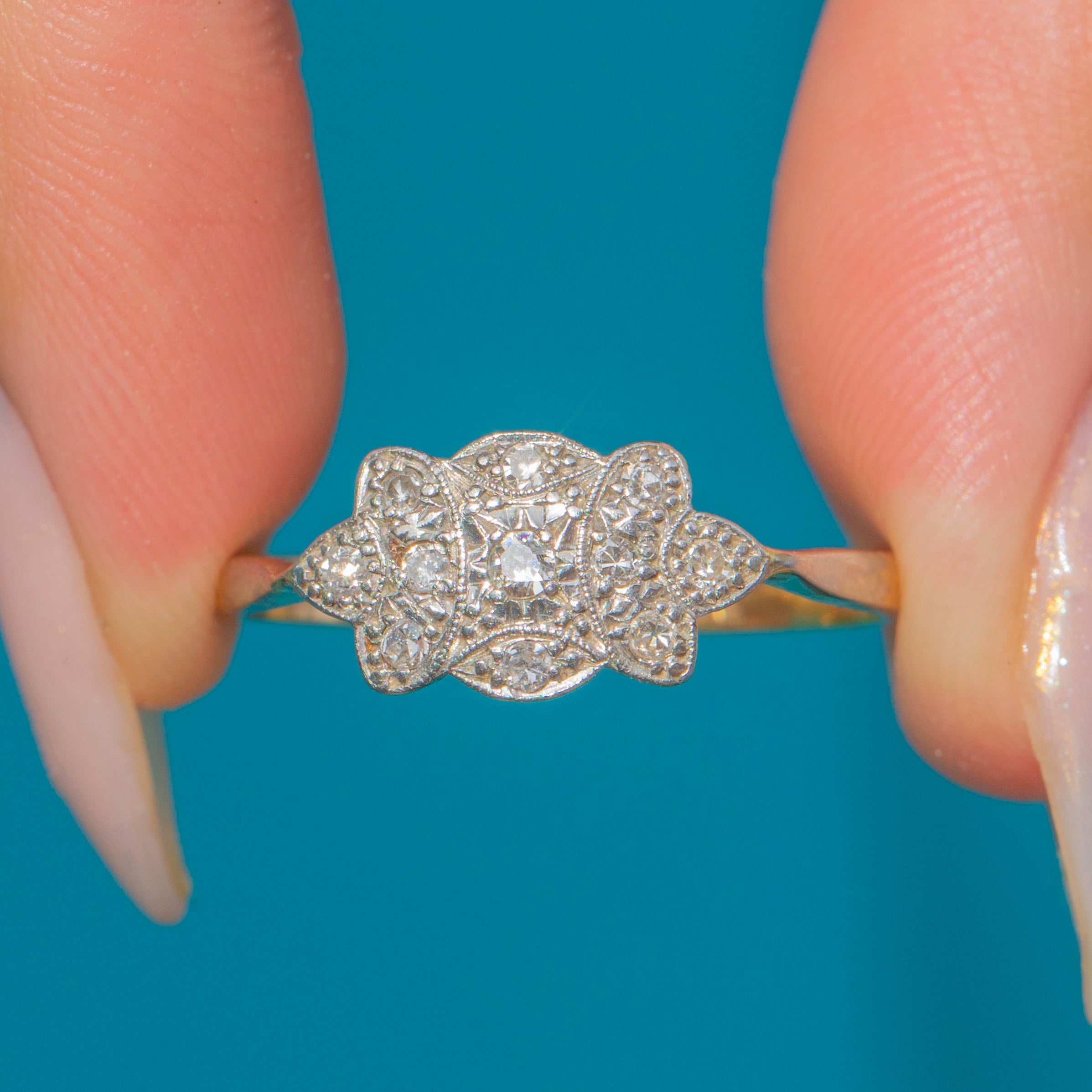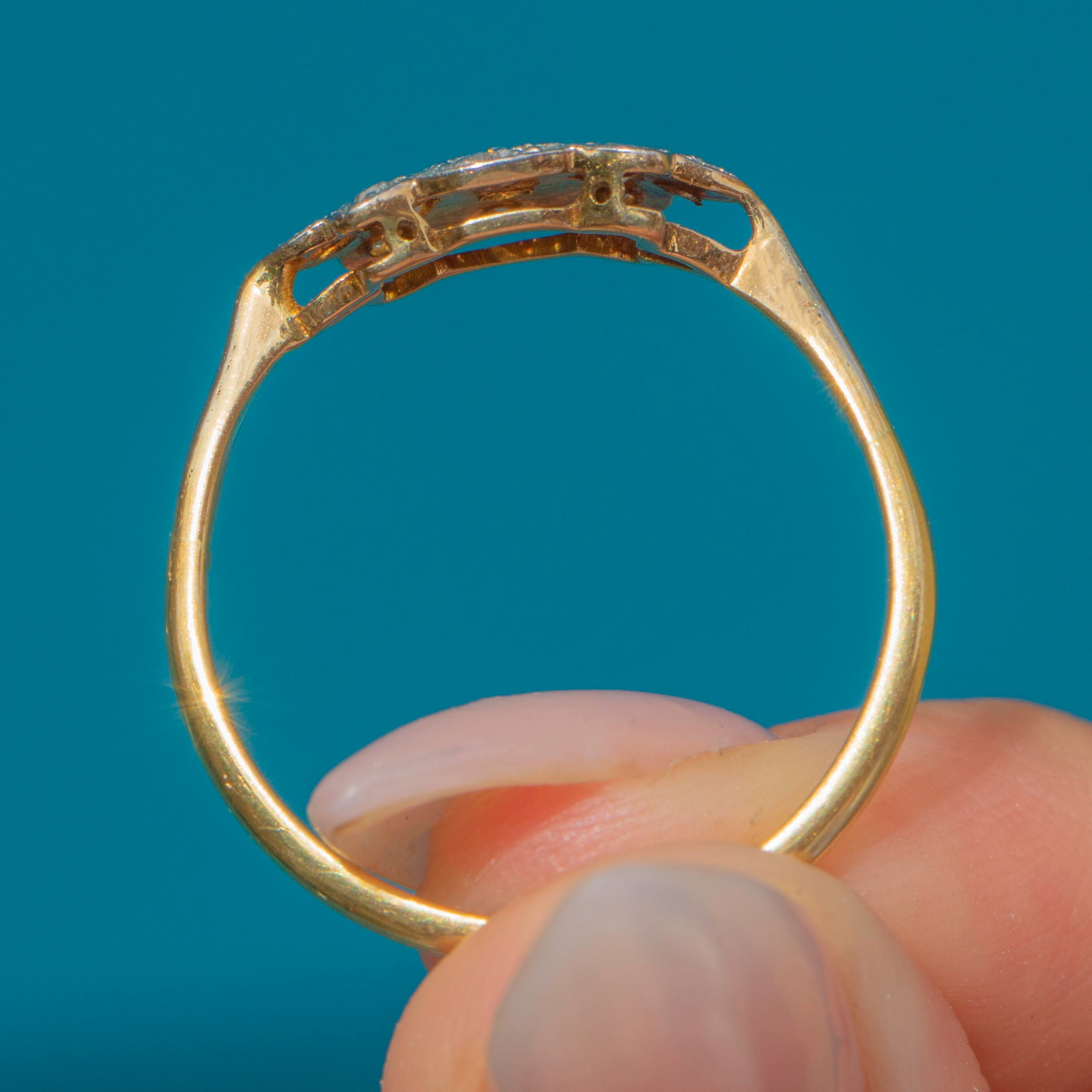 The decorative head of the ring measures 13mm across the finger, giving elegant finger coverage without being overpowering. The Platinum settings and shoulders contrast perfectly with the warm 18ct Yellow Gold shank, a sleek yet robust design that reflects the bold geometry and craftsmanship of the 1920s.