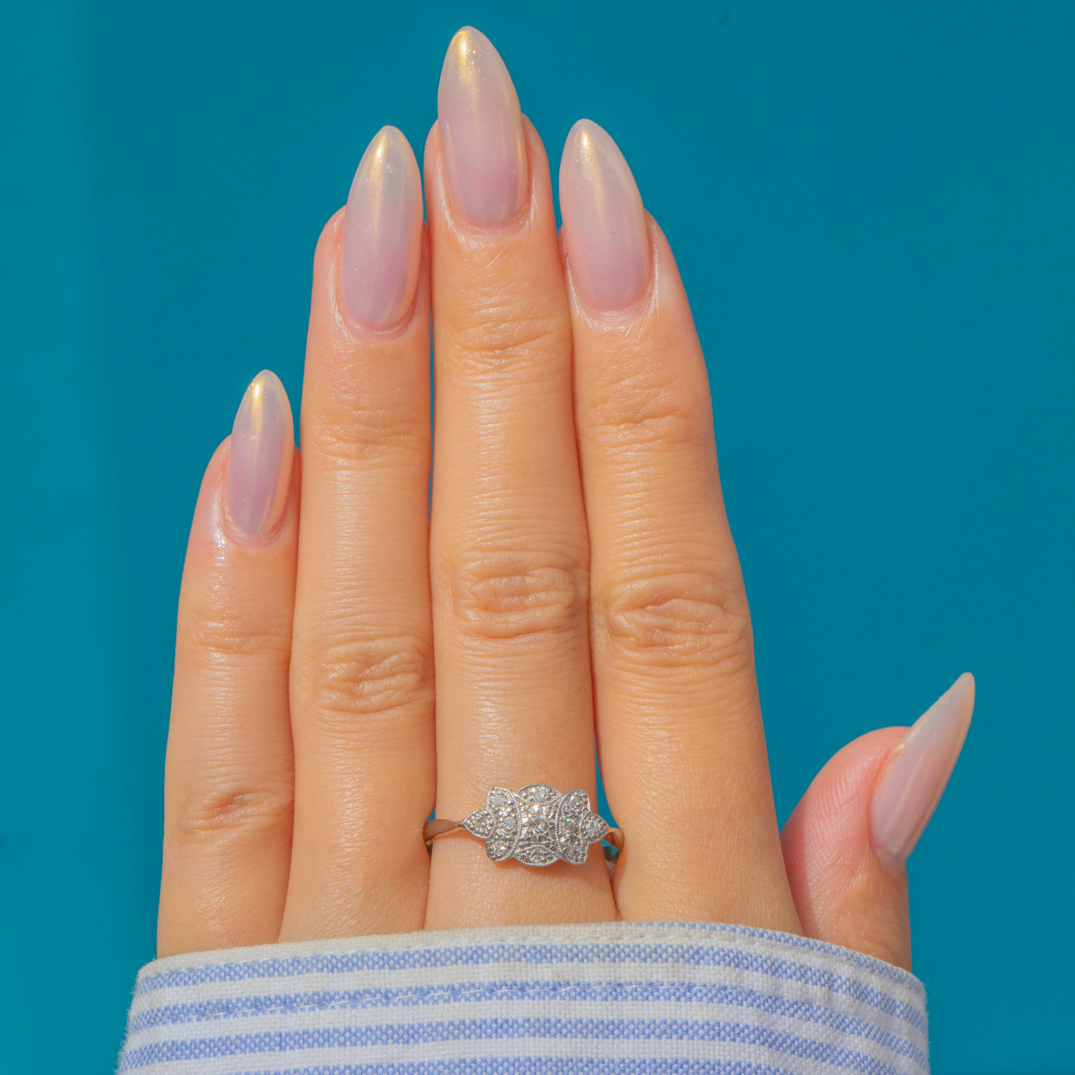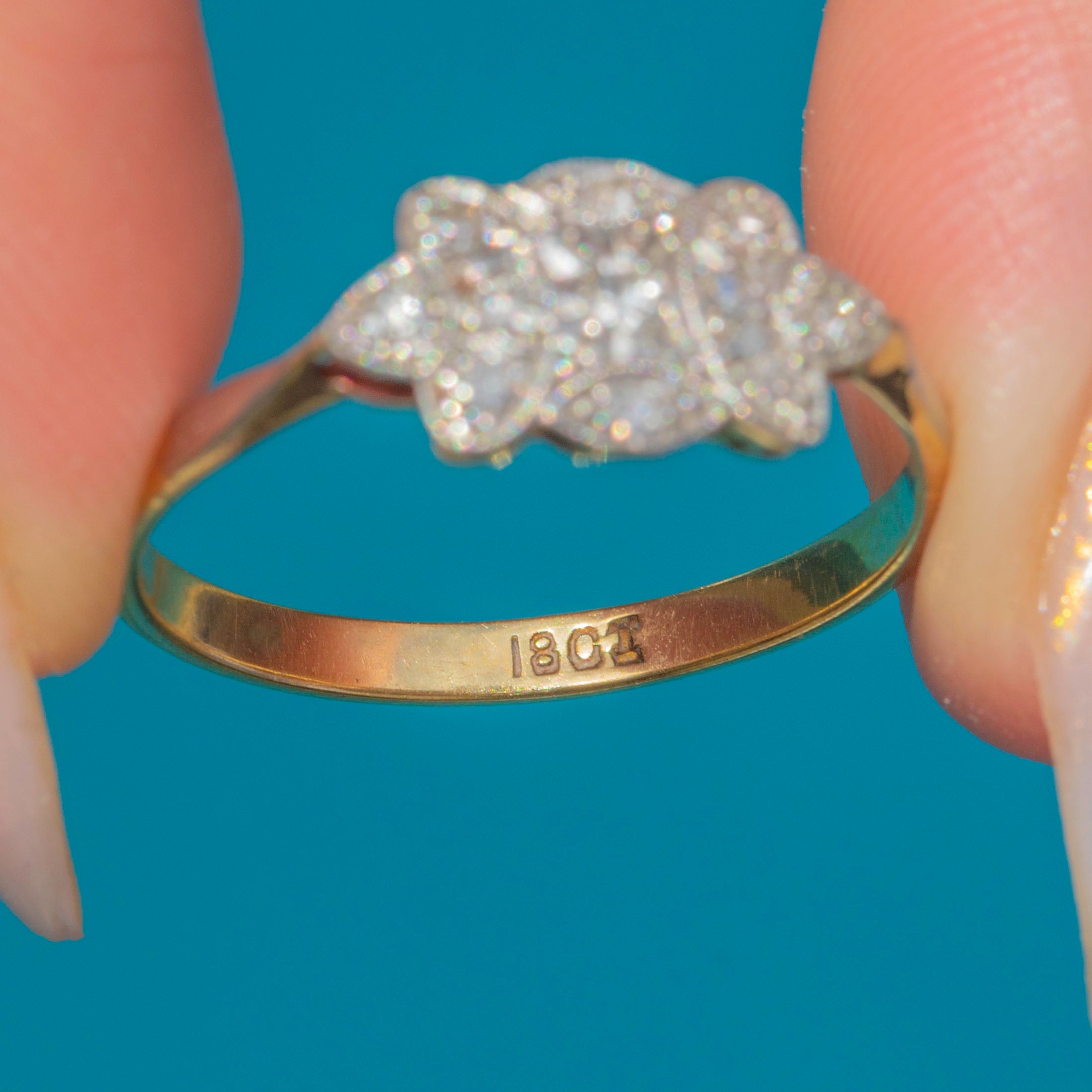A classic Art Deco Diamond cluster ring in 18ct Gold and Platinum, c.1920. The cluster is designed in an elongated floral or starburst form, set with bright, well-matched natural Diamonds that shimmer beautifully in the light.