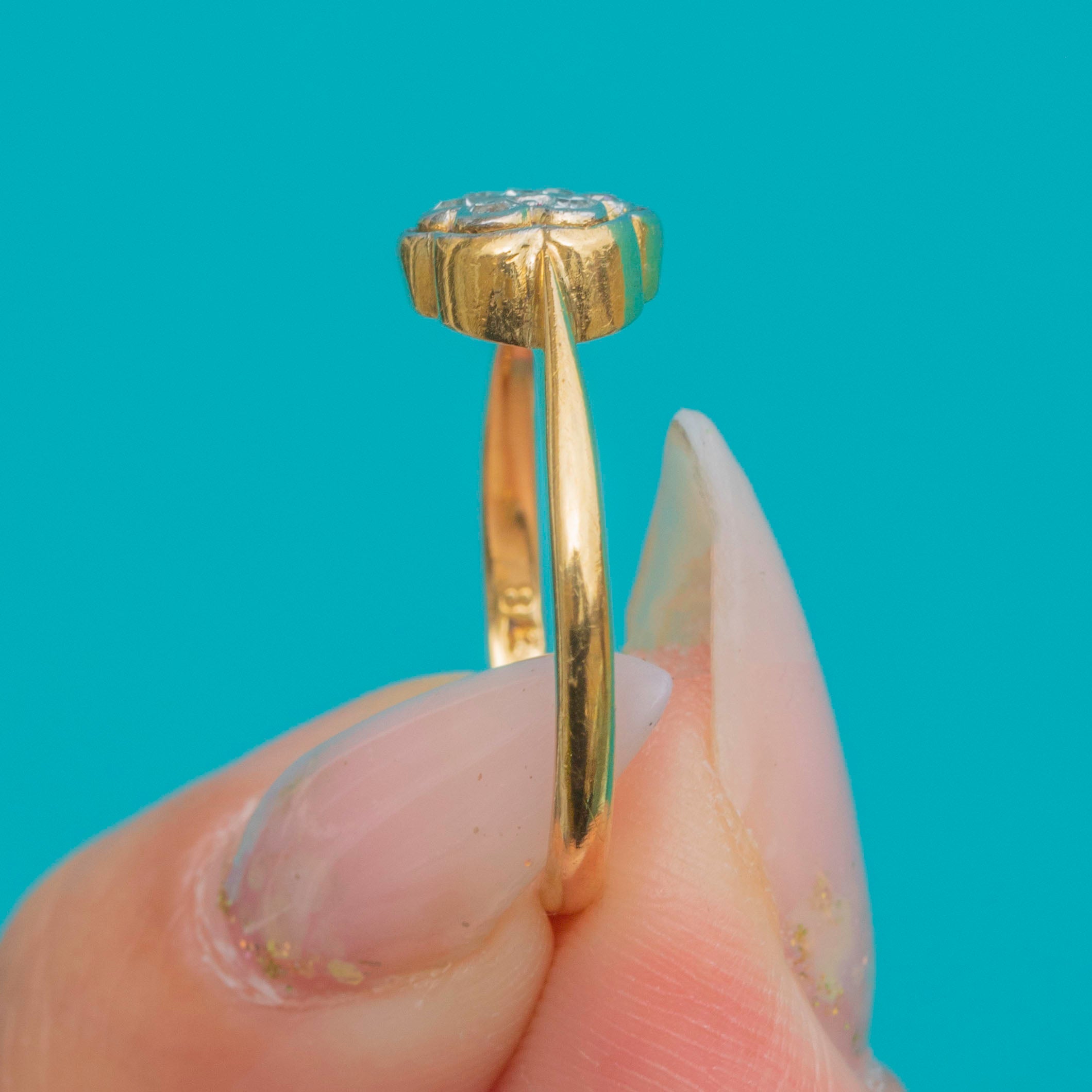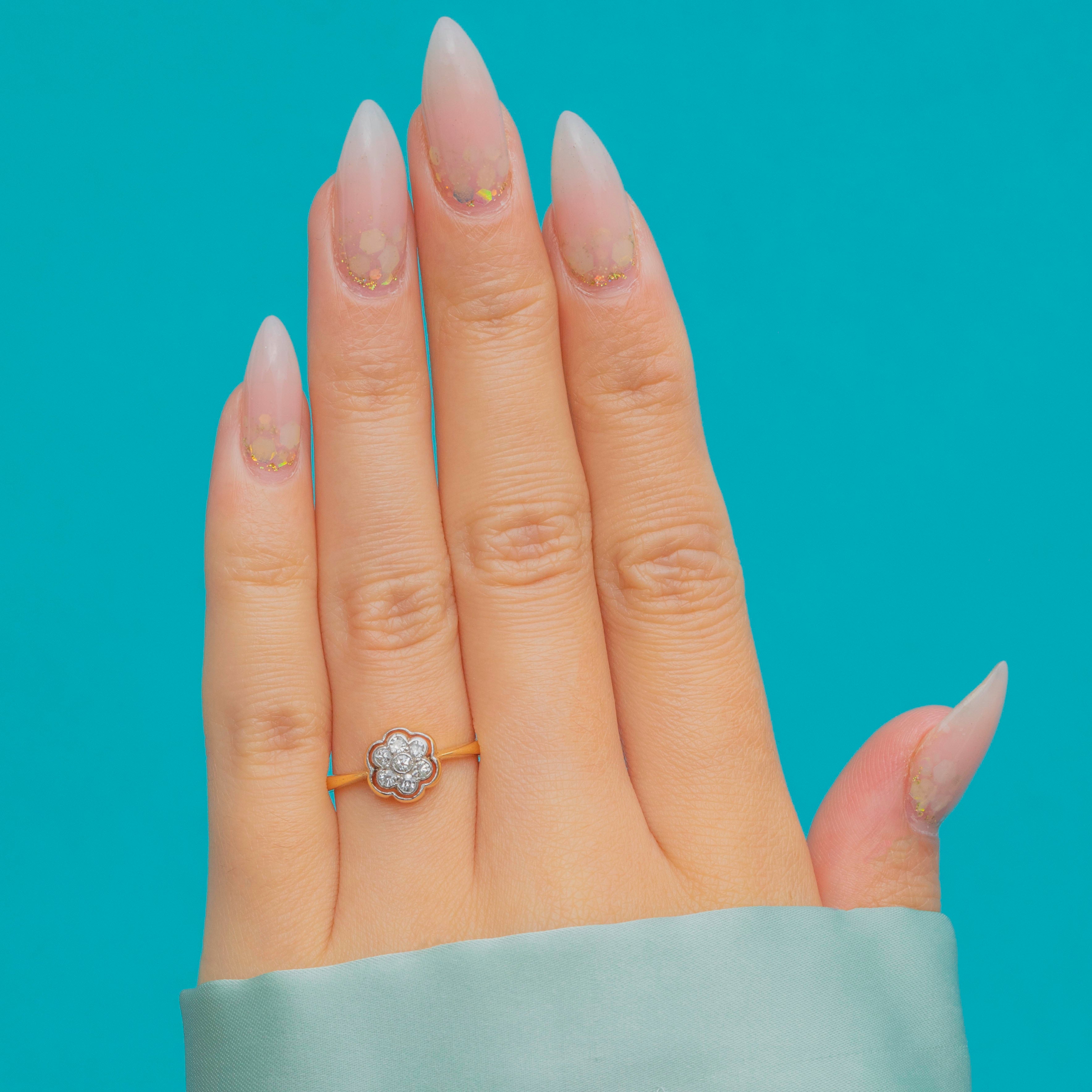 A charming Art Deco Diamond flower cluster ring, crafted in rich 18ct Gold. At the centre of the design lies a lively old mine cut Diamond, surrounded by a halo of smaller old mine cuts arranged in a floral motif. The warm yellow Gold band and millegrain details capture the elegance and fine craftsmanship of the 1920s.