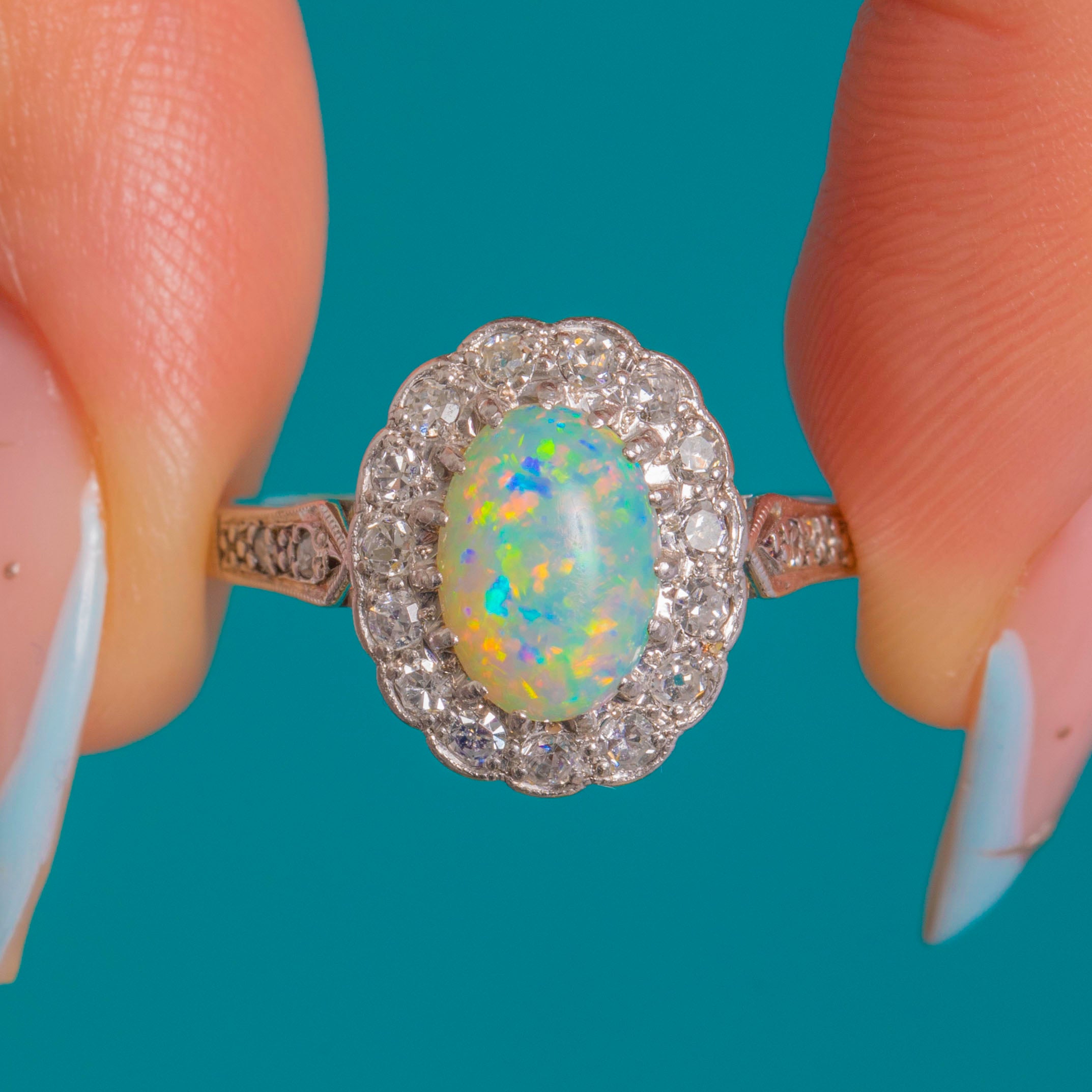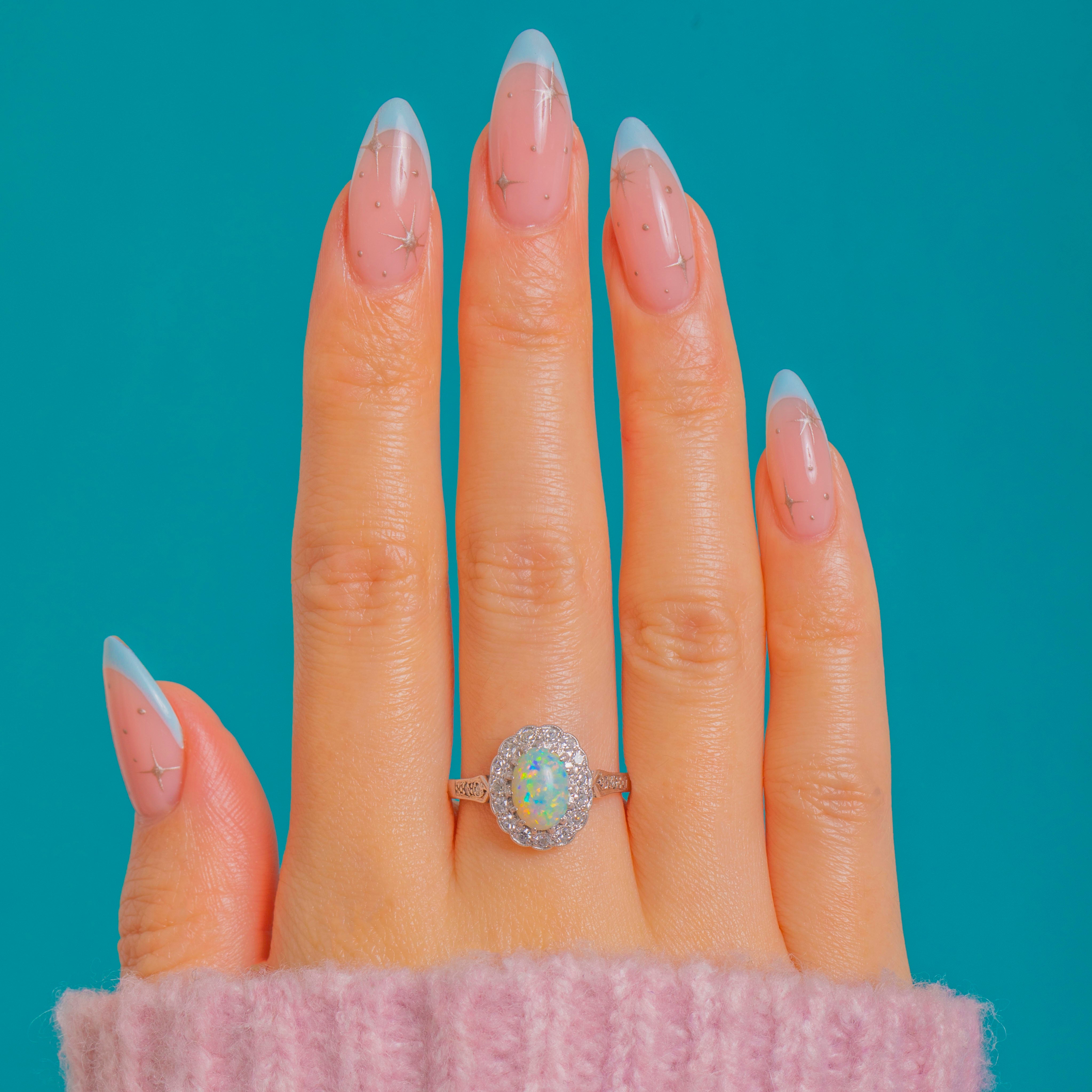 Prepare to have your breath taken away by the sheer beauty of this Art Deco 18ct White Gold Opal Diamond cluster ring! Her oval 0.70ct Opal cabochon is akin to a burst of confetti as it catches the light, flaunting a spectrum of iridescent flashes which will never fail to amaze.