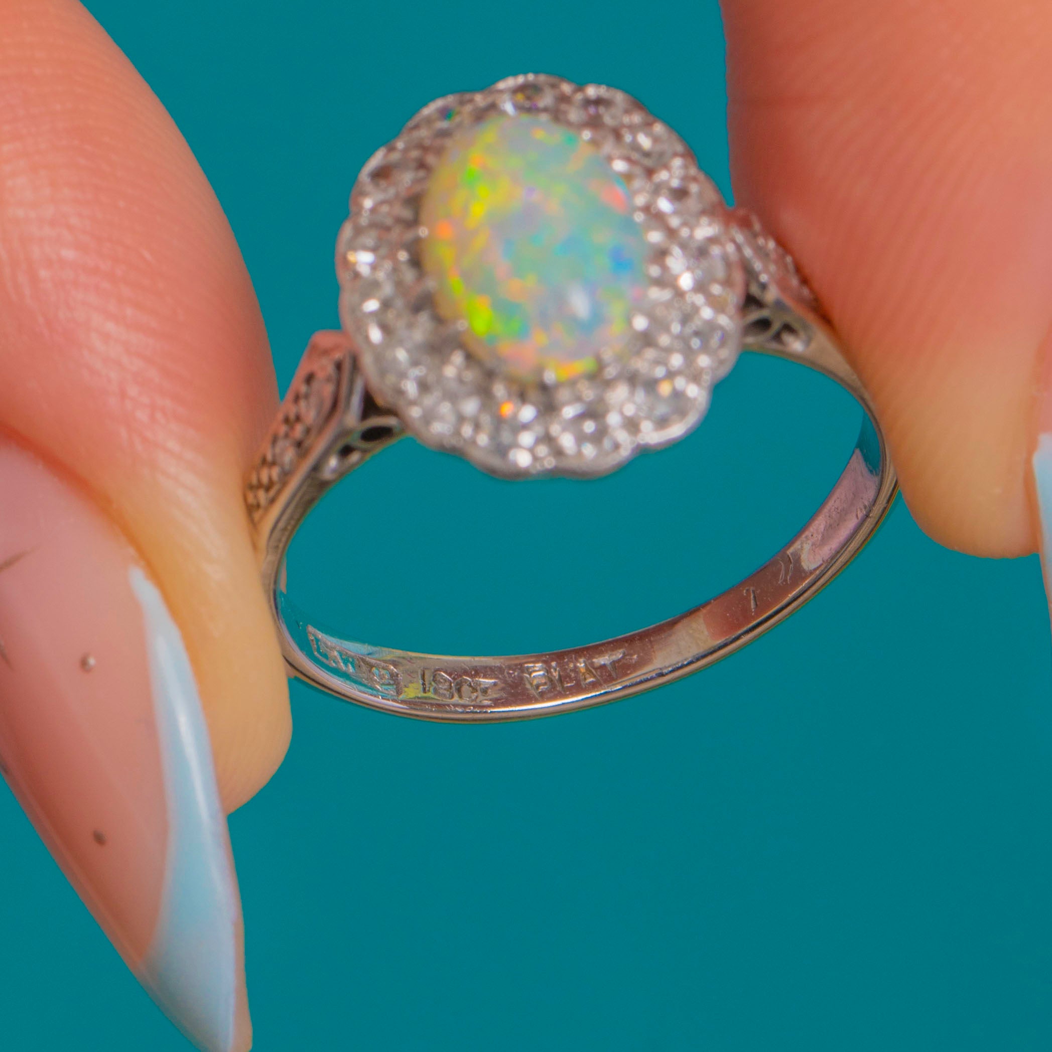 EXCELLENT: This Art Deco 18ct White Gold Opal Diamond cluster ring has been well preserved and is in excellent condition! The Opal is smooth to the touch, with an absorbing firework display of colour and is secure within her claw settings. Each Diamond is secure and present! The ring band has a well-rounded form, with the 18ct White Gold remaining highly saturated. There's no doubt this Art Deco ring will always be the talking point!