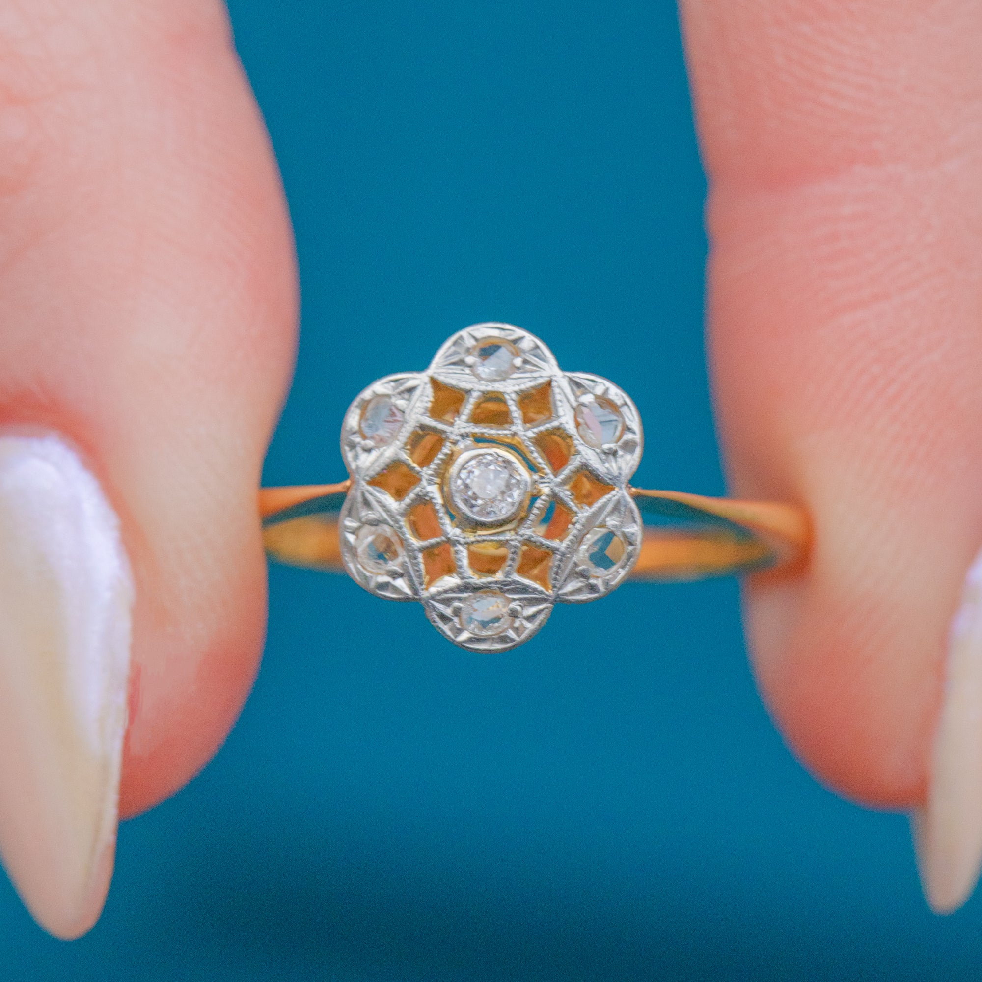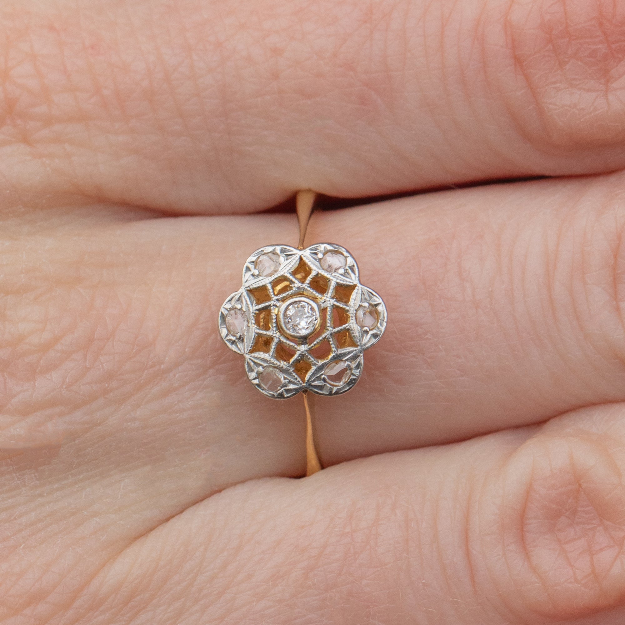 EXCELLENT. This Art Deco 18ct Gold & Platinum Diamond openwork ring is in excellent condition. All of the Diamonds are securely set and each is free from damage of any kind. Her openwork Platinum settings are stunning too, with her dainty flower keeping in pristine condition for nearly 100 years!