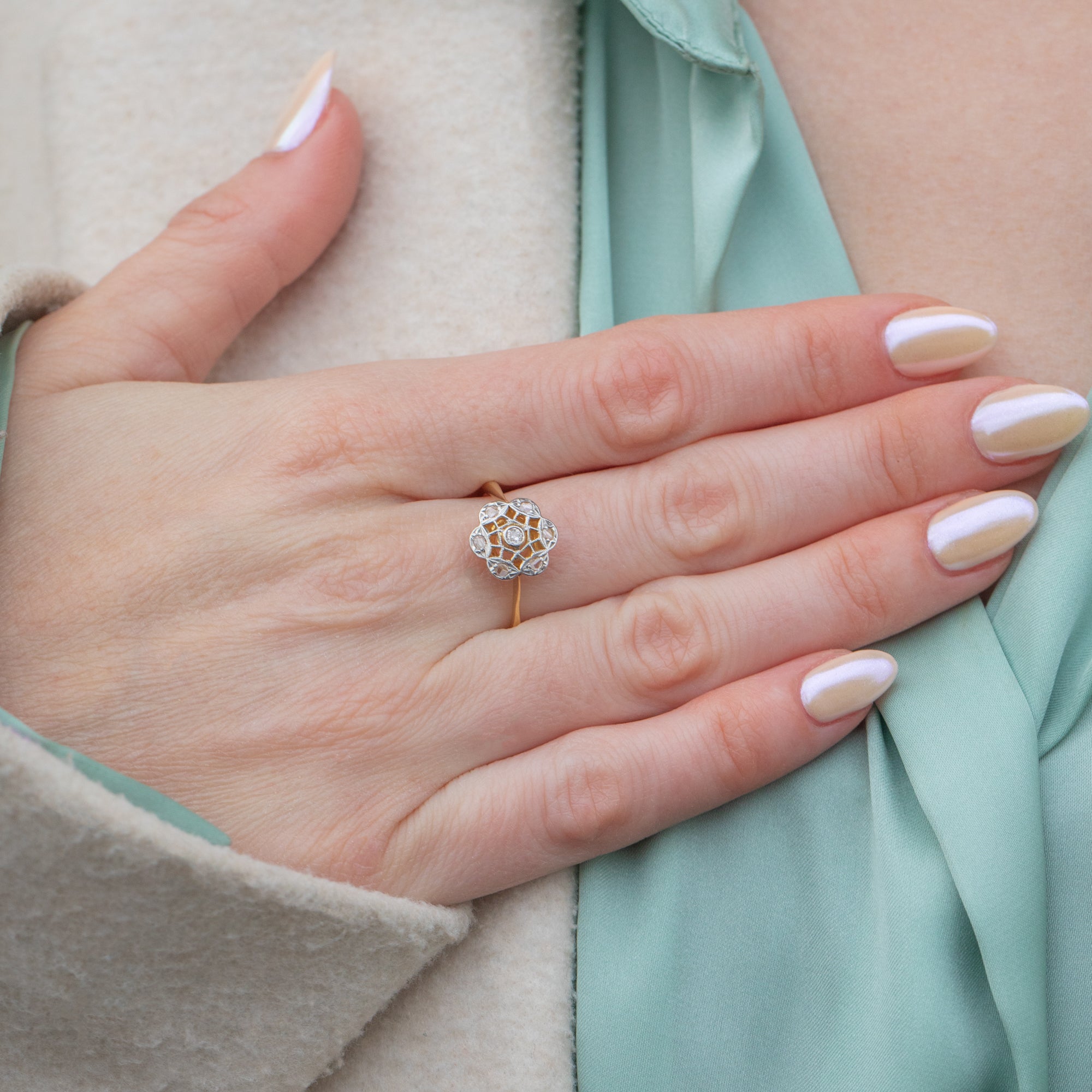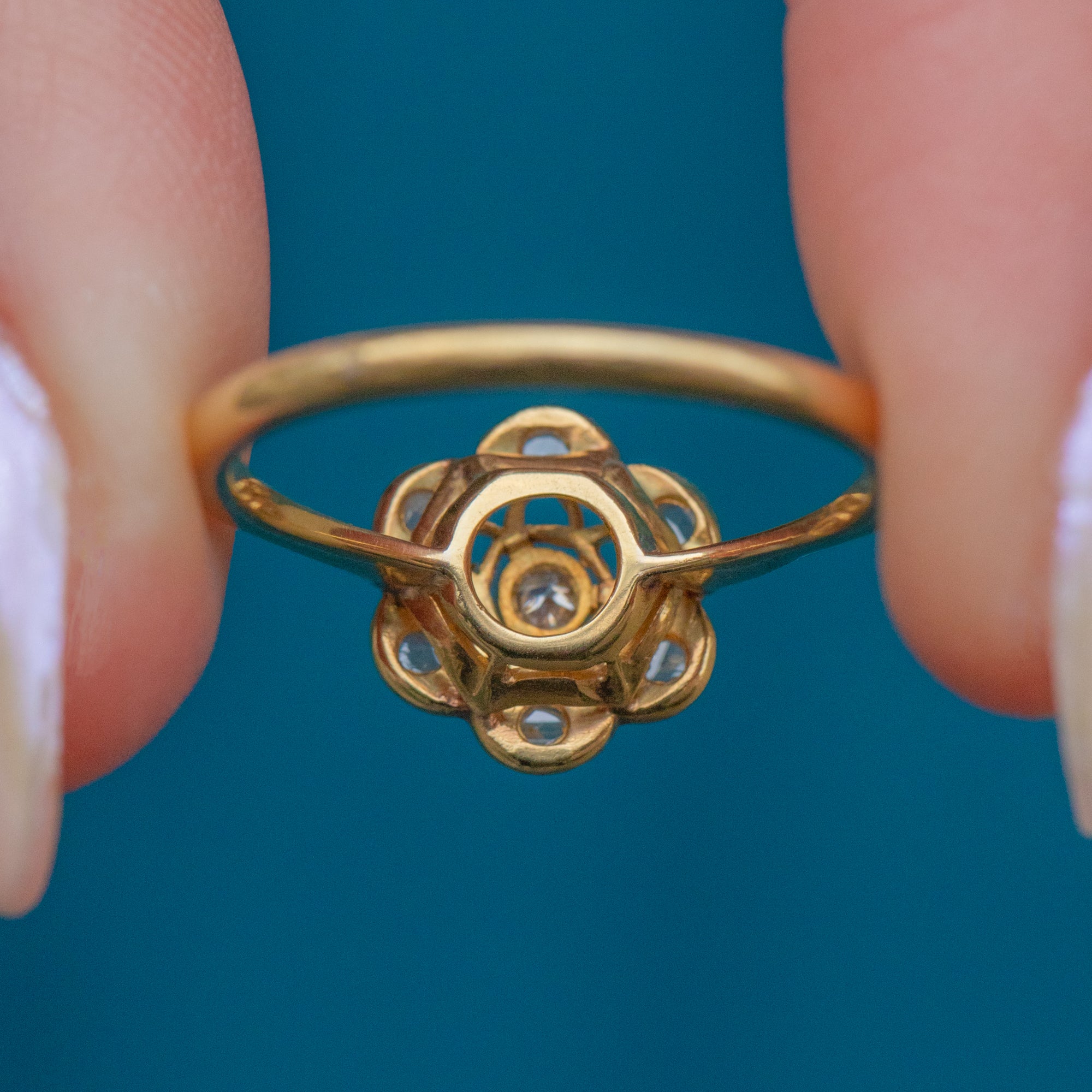 Boasting a buttery 18ct Gold band and cool solid Platinum settings, her Diamond is securely set into gorgeous openwork settings reminiscent of a delicate flower! Slender and sophisticated, this elegant ring is bound to become your new favourite treasure!