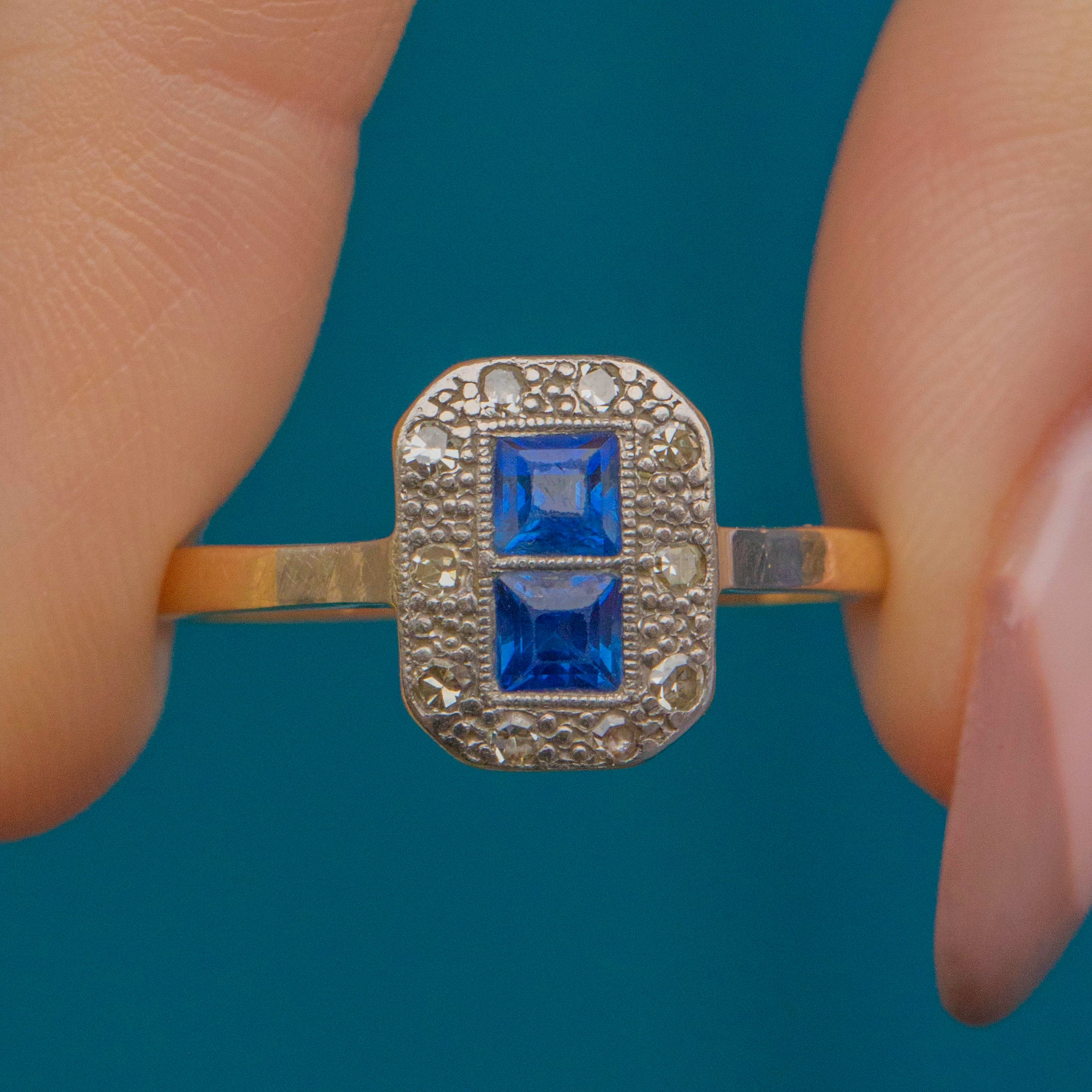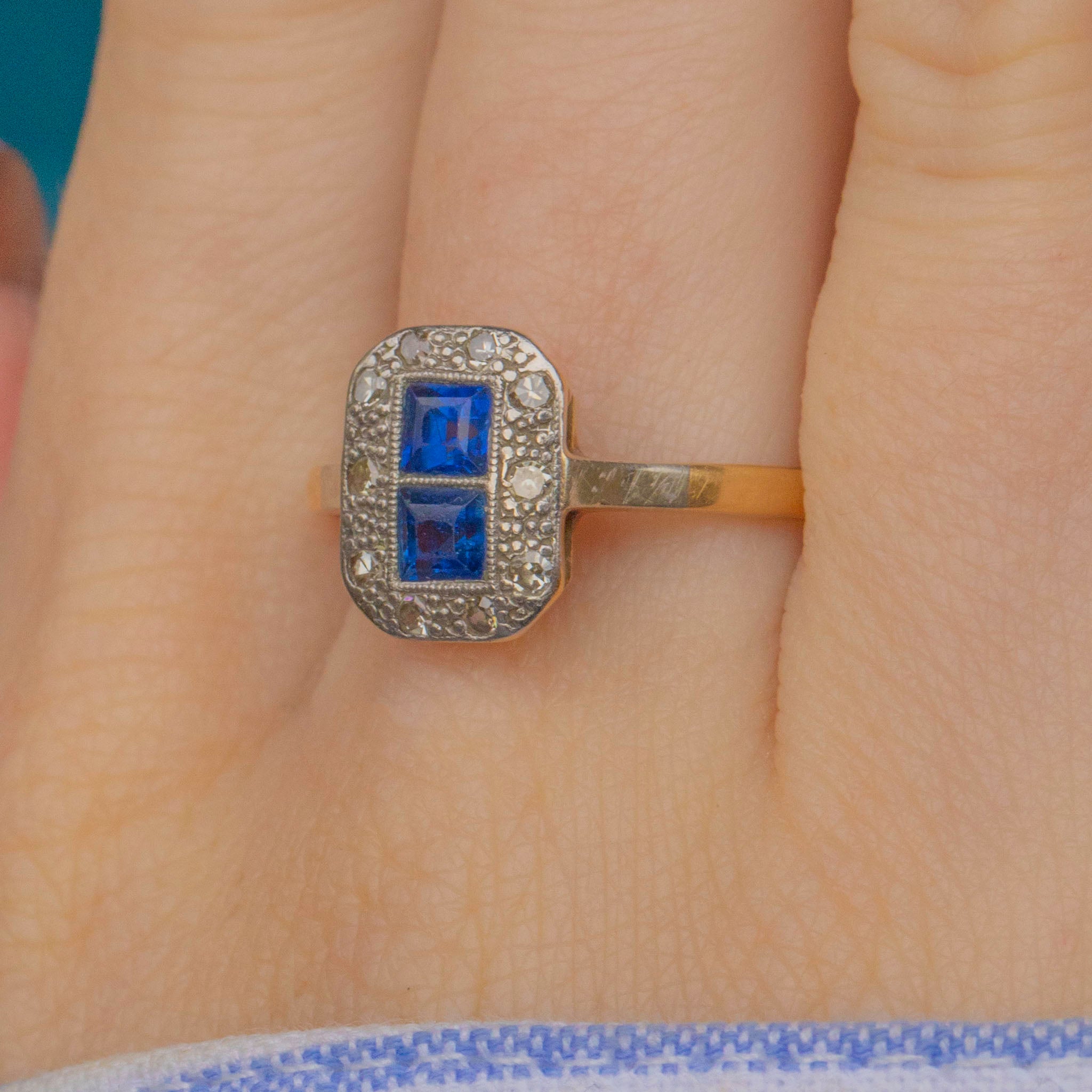 Art Deco 18ct Gold & Platinum Sapphire Diamond Panel Ring