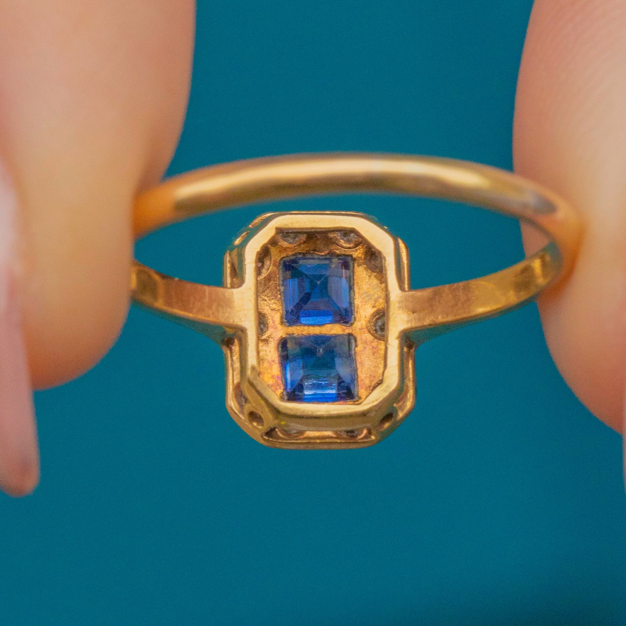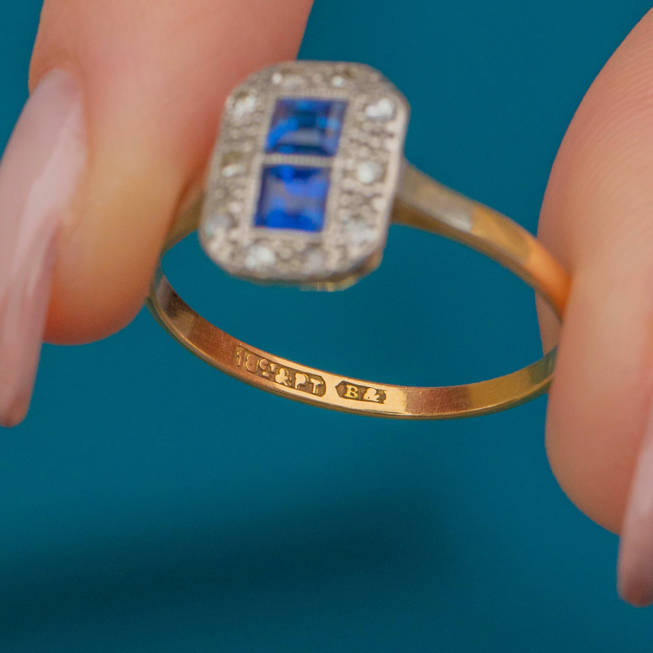 EXCELLENT. We are pleased to present this Art Deco 18ct Gold and Platinum Sapphire Diamond panel ring in excellent condition. Her Diamonds and Sapphires are radiant, catching the light beautifully and free from scuffs or scratches. Her 18ct Gold and Platinum band is also in wonderful condition, making this ring a must-have!