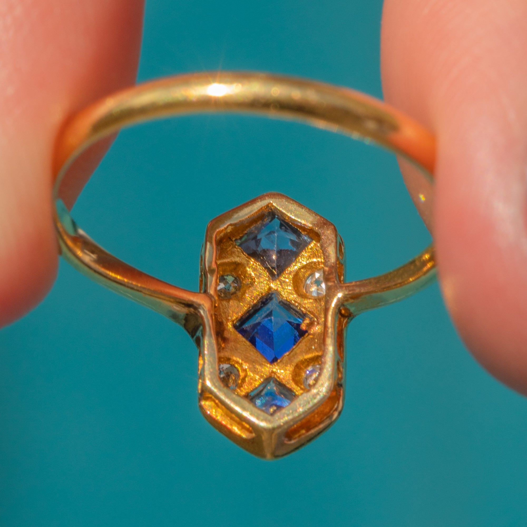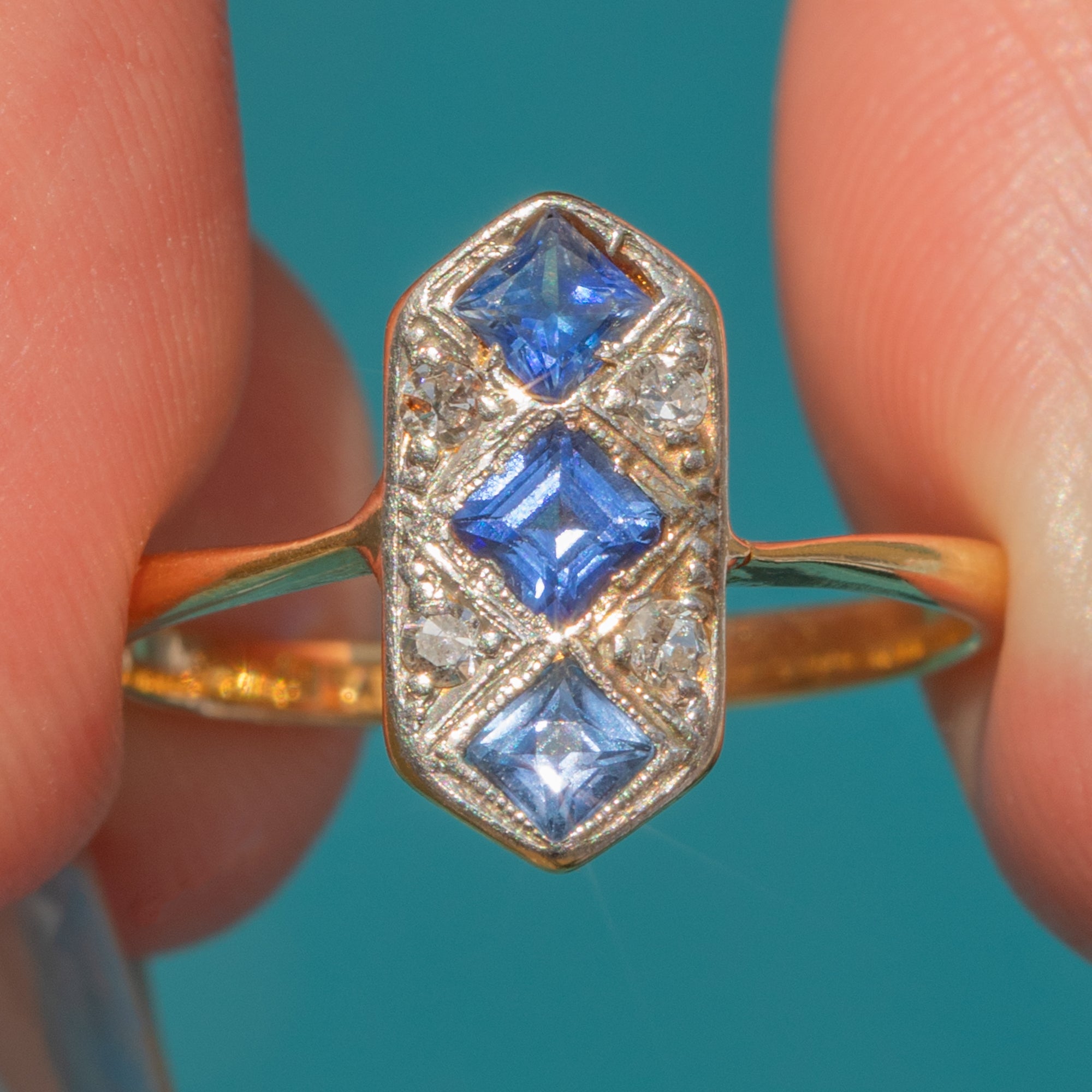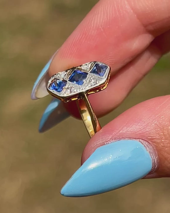 EXCELLENT: Each vibrant Sapphire is uniquely cut: Top French Cut, Middle Asscher Cut, and Bottom Radiant Cut. The French cut Sapphire is original, while the others are likely replacements; however, each fits the colour and style of the ring. With the glossy 18ct Gold band providing comfortable wear, this Art Deco ring will make a striking addition to your collection!