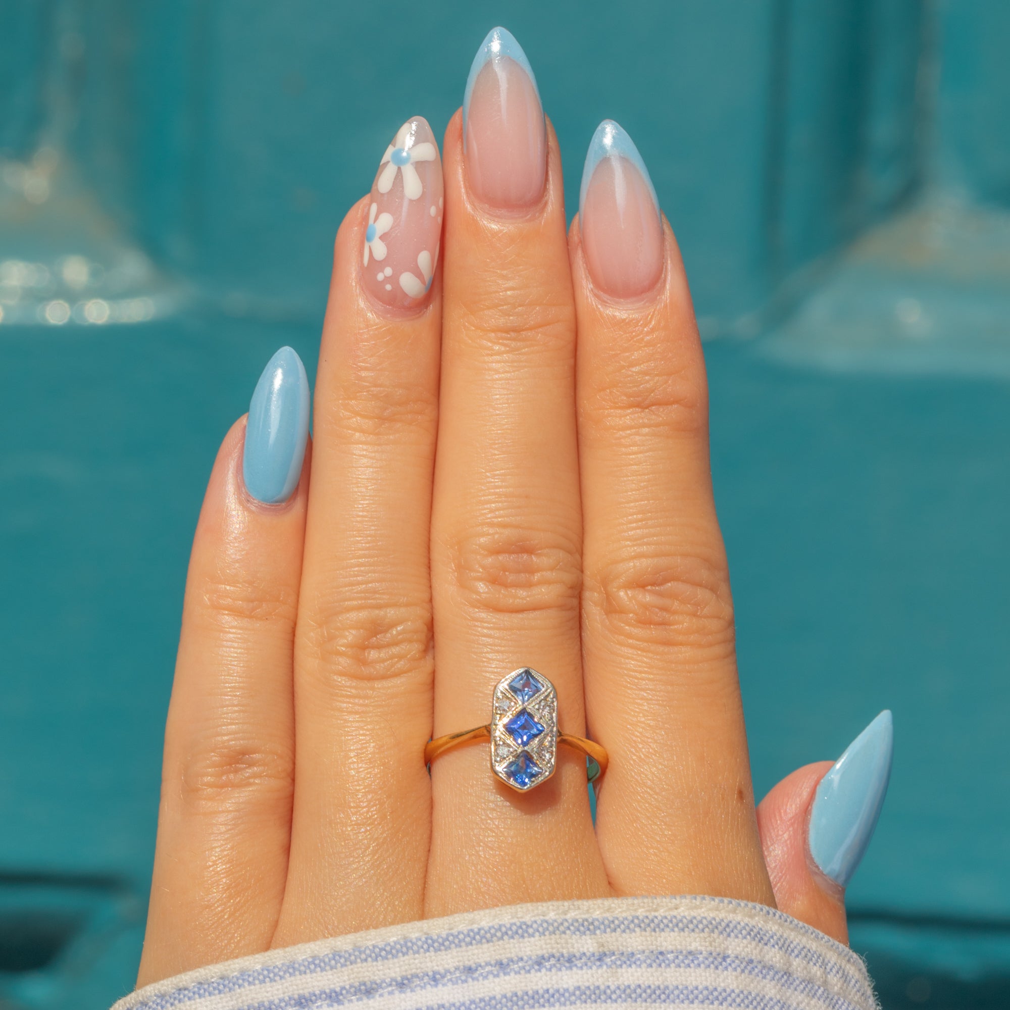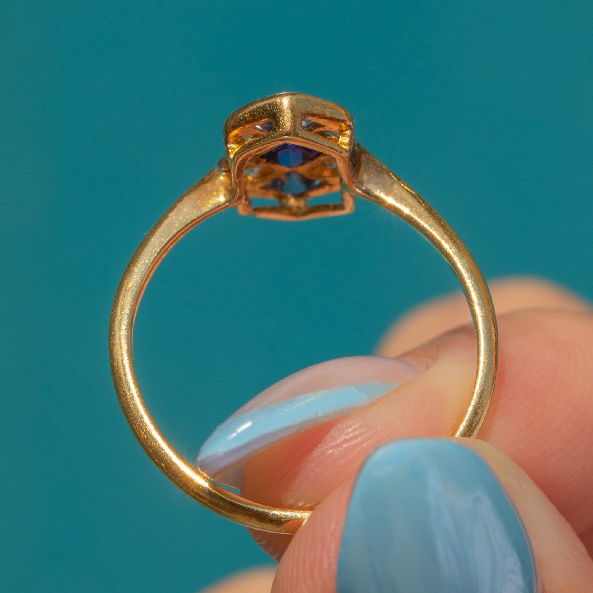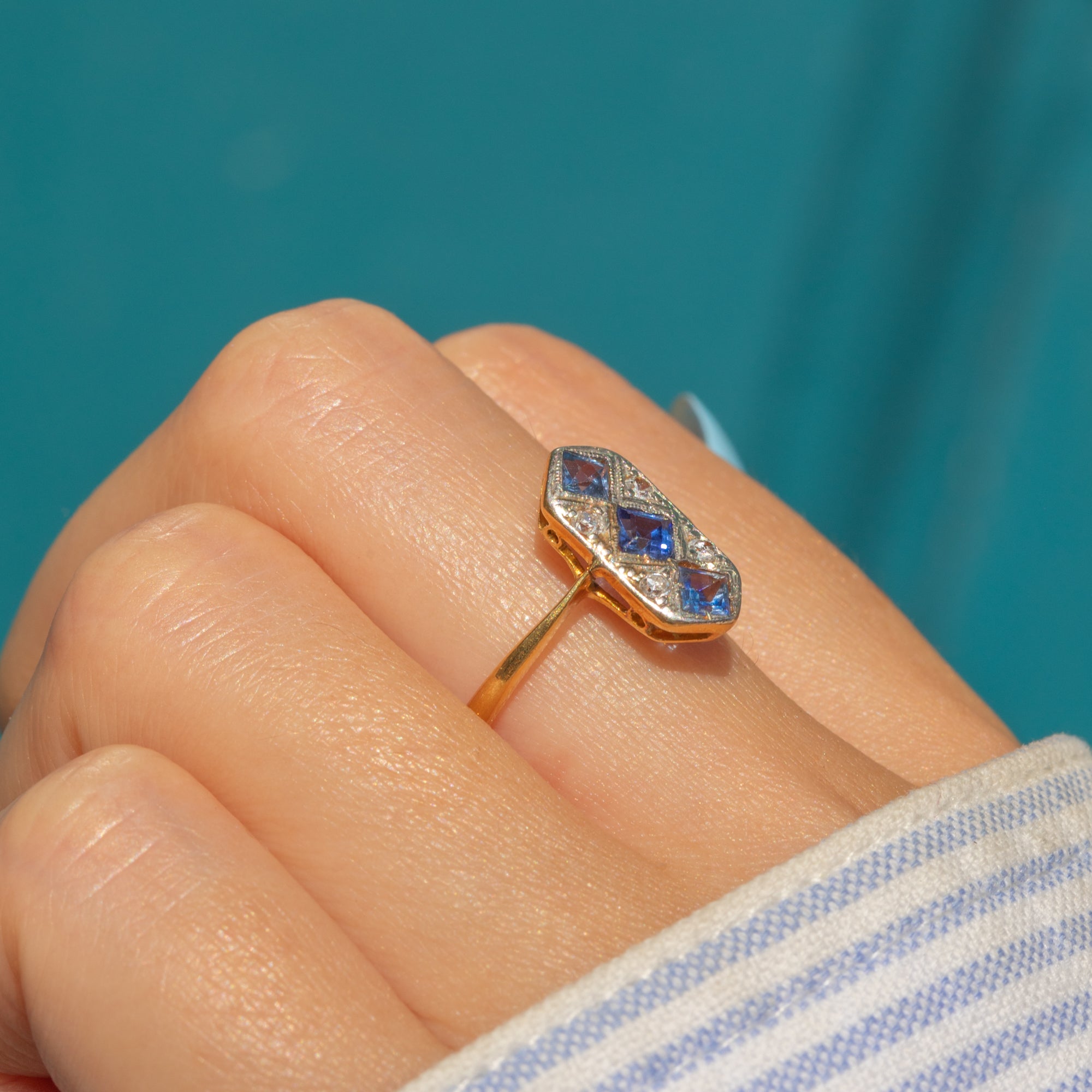 EXCELLENT: Each vibrant Sapphire is uniquely cut: Top French Cut, Middle Asscher Cut, and Bottom Radiant Cut. The French cut Sapphire is original, while the others are likely replacements; however, each fits the colour and style of the ring. With the glossy 18ct Gold band providing comfortable wear, this Art Deco ring will make a striking addition to your collection!