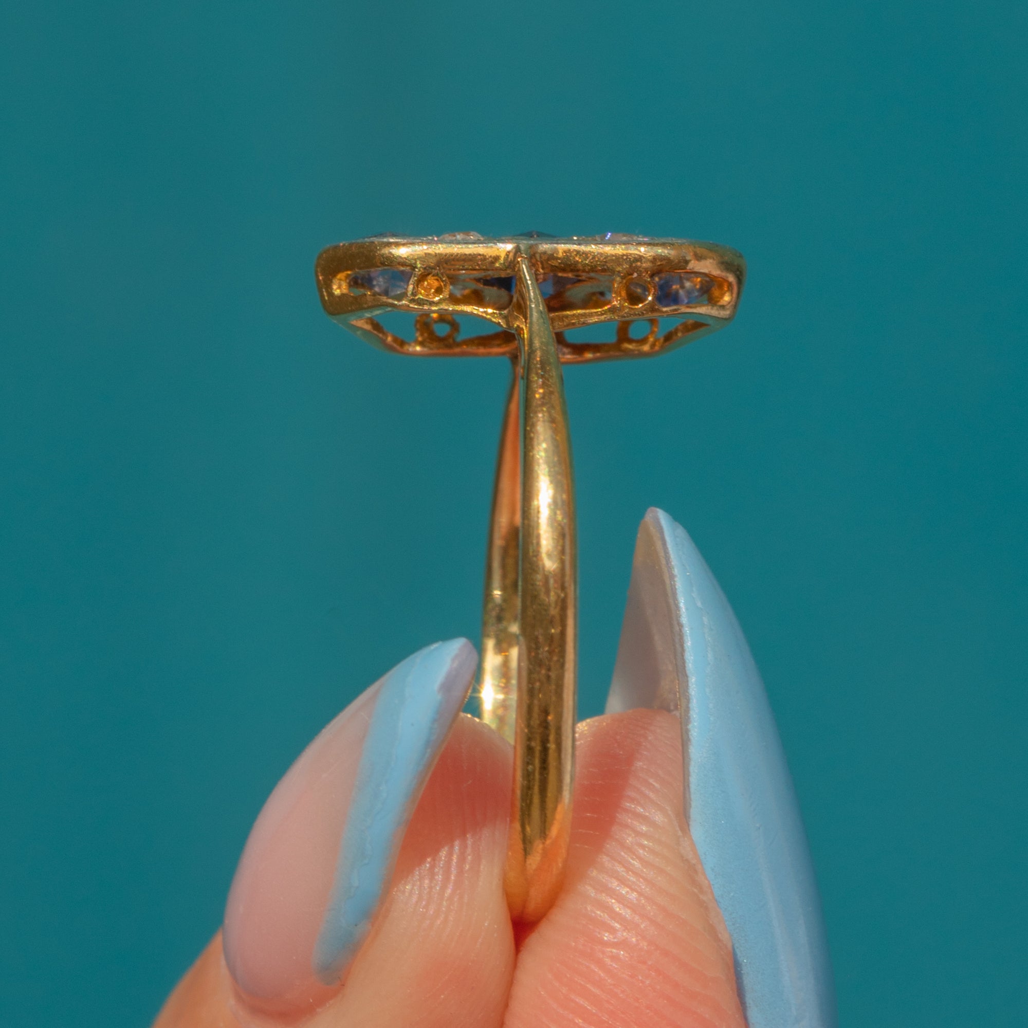 This antique ring flaunts three natural Sapphires, each radiating a bright true blue hue from their crisp facets. The Sapphires are flanked by four scintillating Diamonds, with each gemstone set in geometric Platinum settings for a refined and elegant finish.