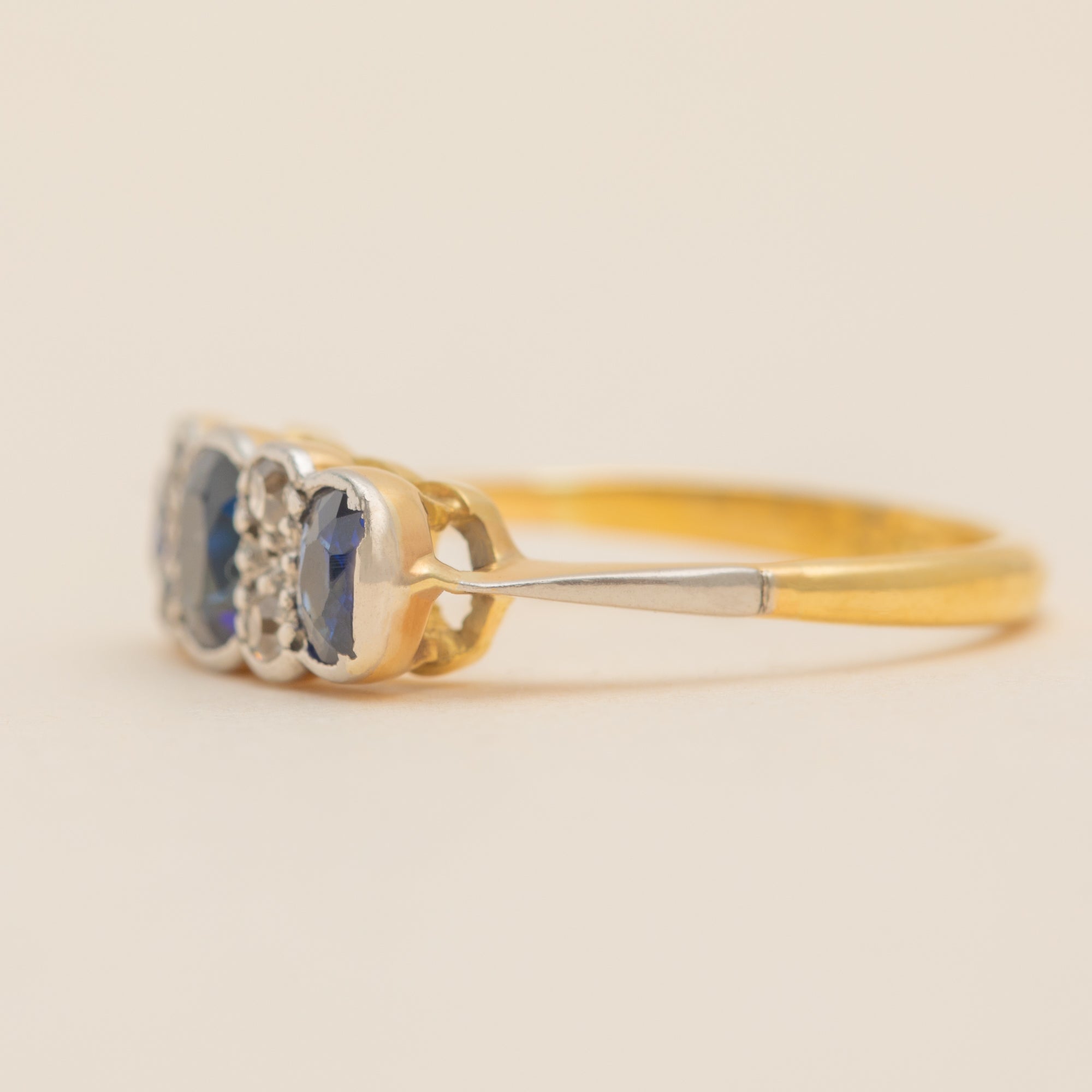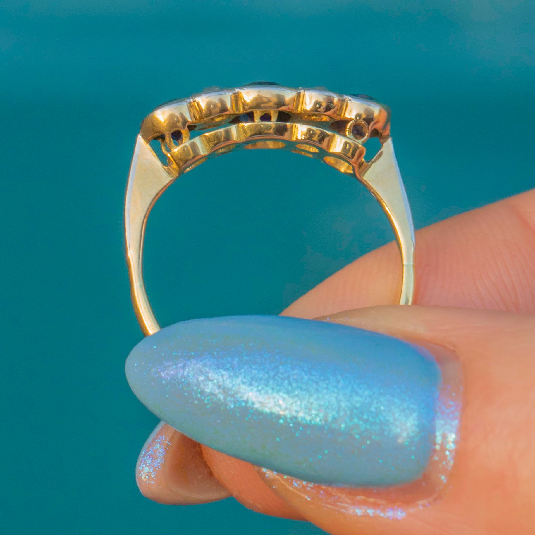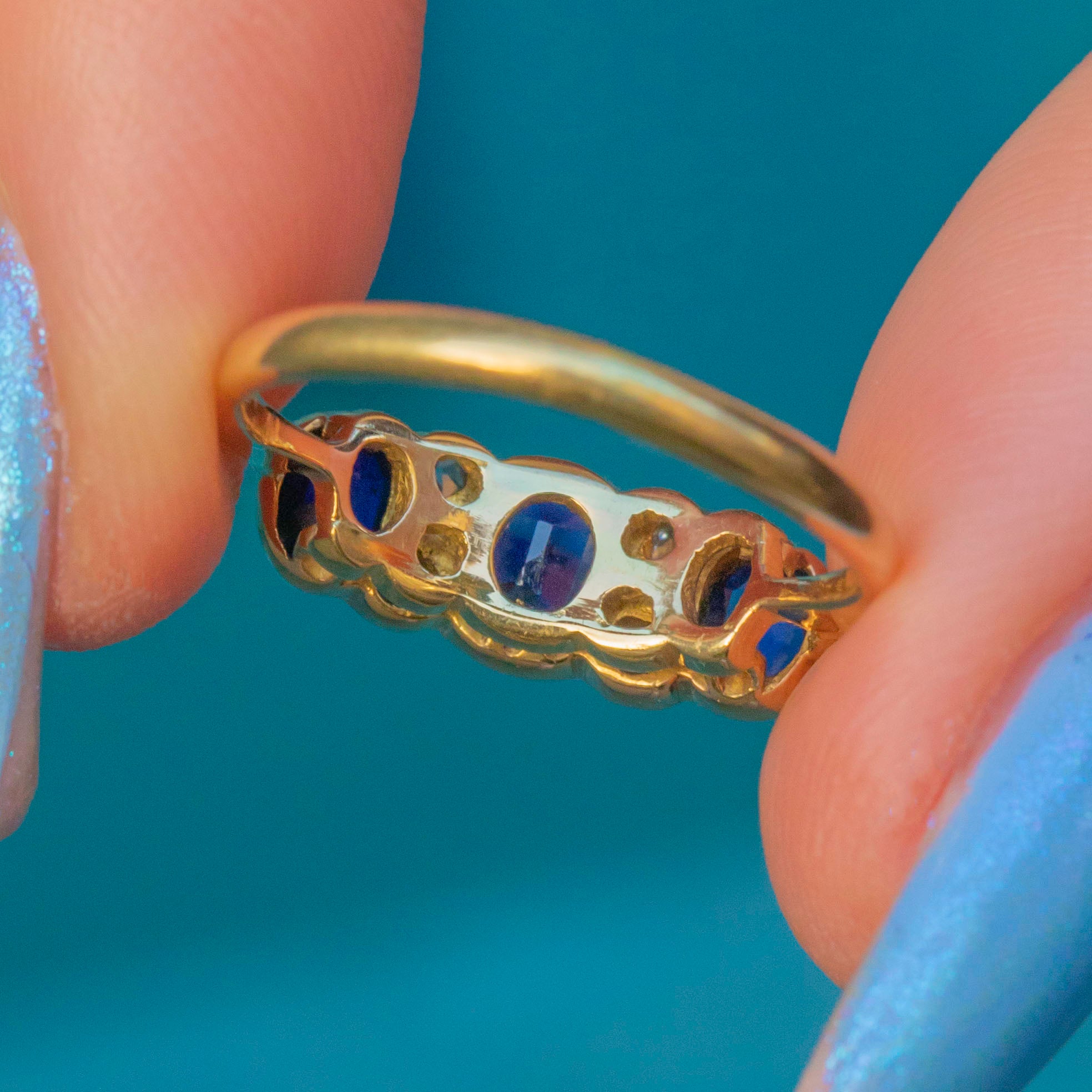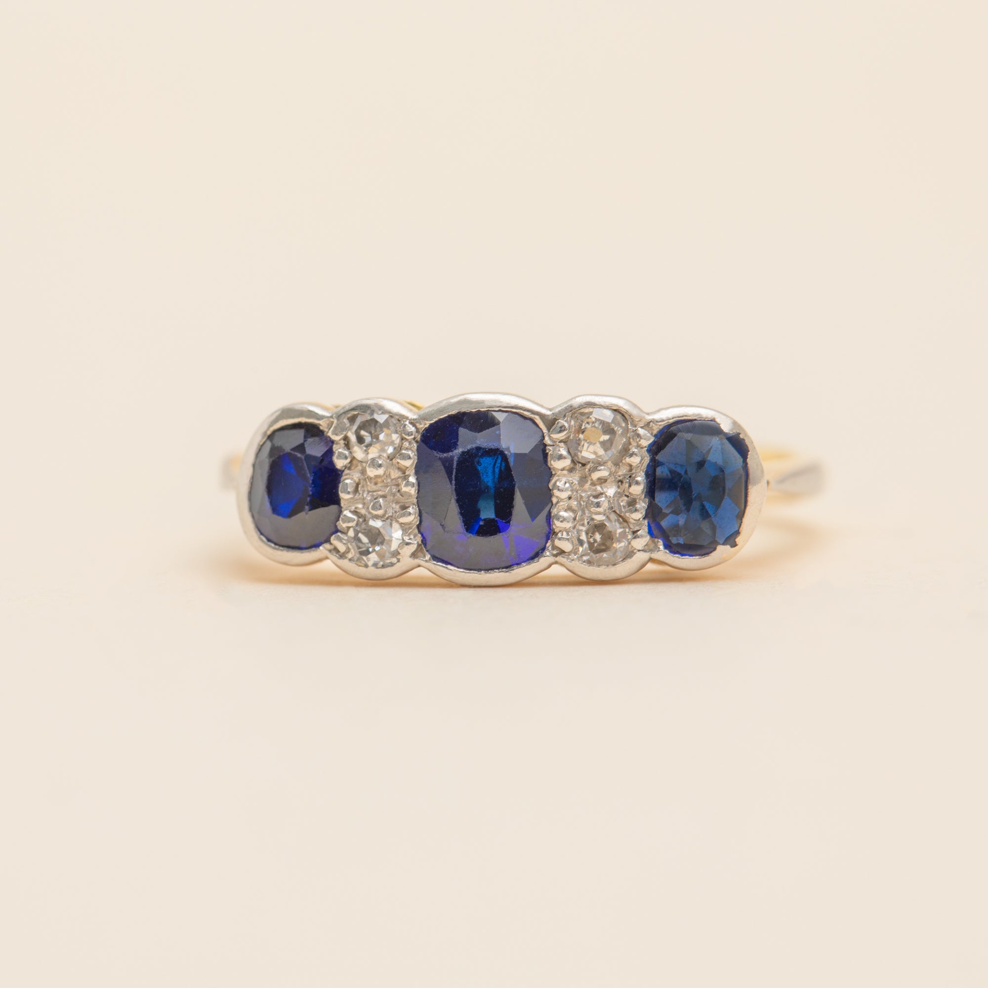 This antique ring features three radiant Sapphires, each a rich navy blue which gleam fantastically as they catch the light. They are interspersed by four scintillating Diamonds, with each gemstone effortlessly complimenting the next.