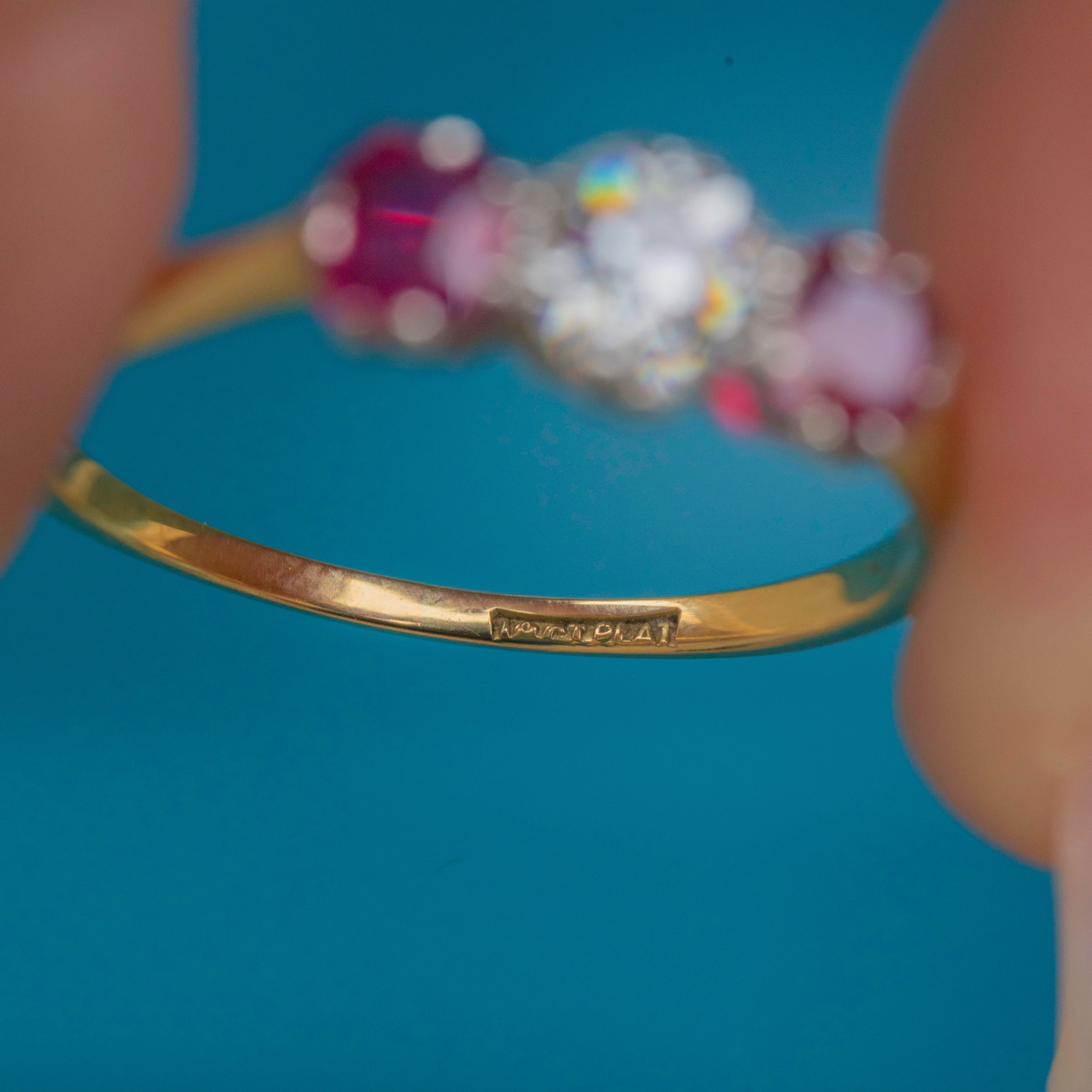 MATERIALS: Tests as 18ct Gold, Platinum, Natural Old-European cut Diamond (0.65ct), Rubies (0.90ct).