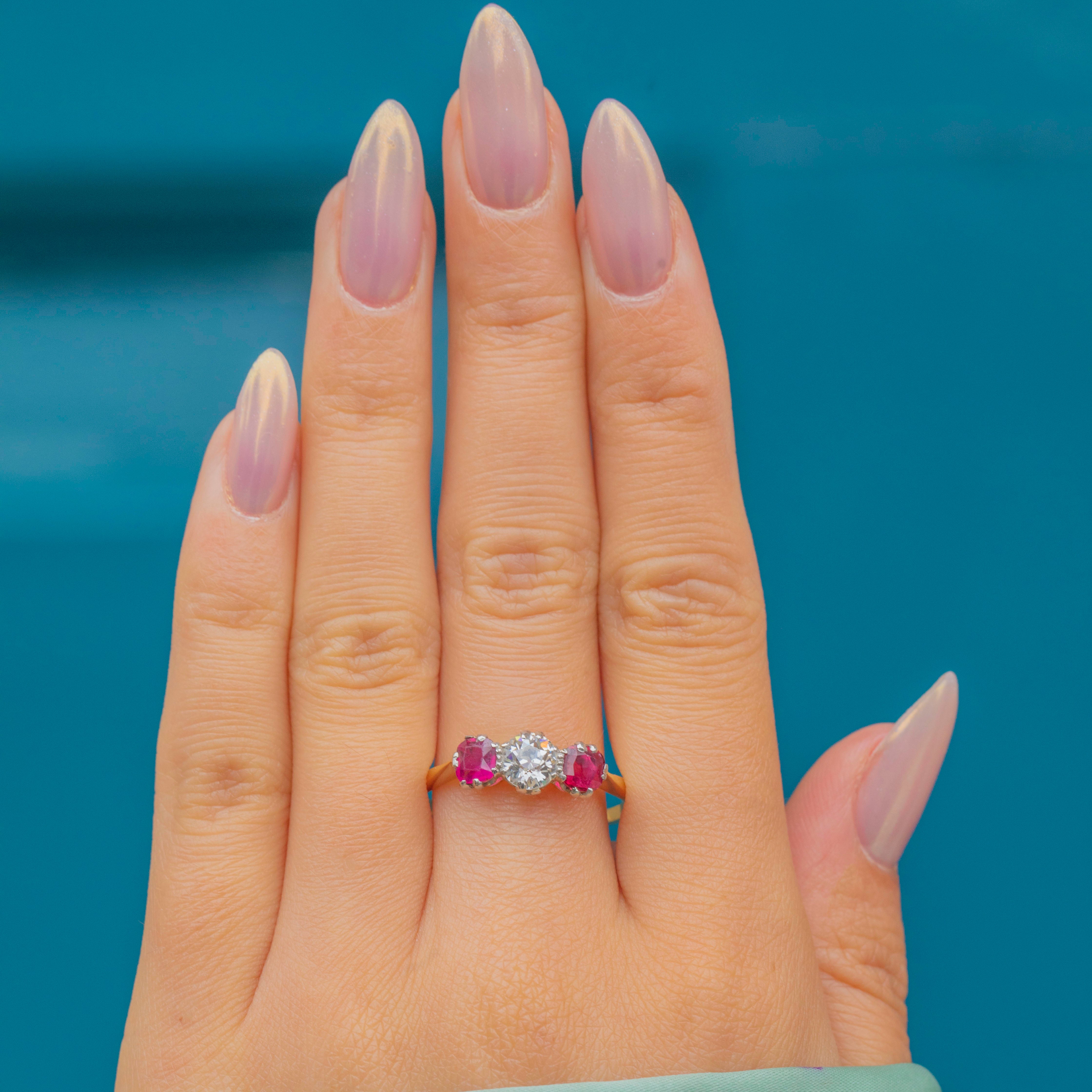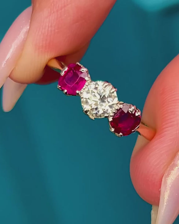 This exquisite Art Deco trilogy ring showcases a central sparkling Diamond flanked by two vibrant Rubies, set elegantly in Platinum with an 18ct Gold band.