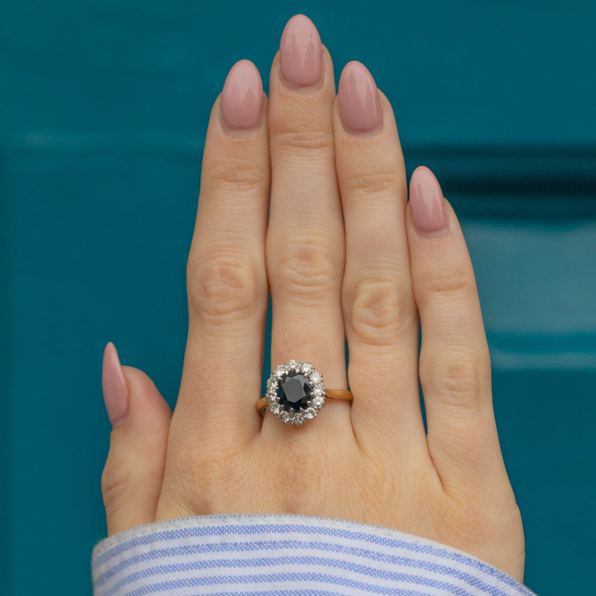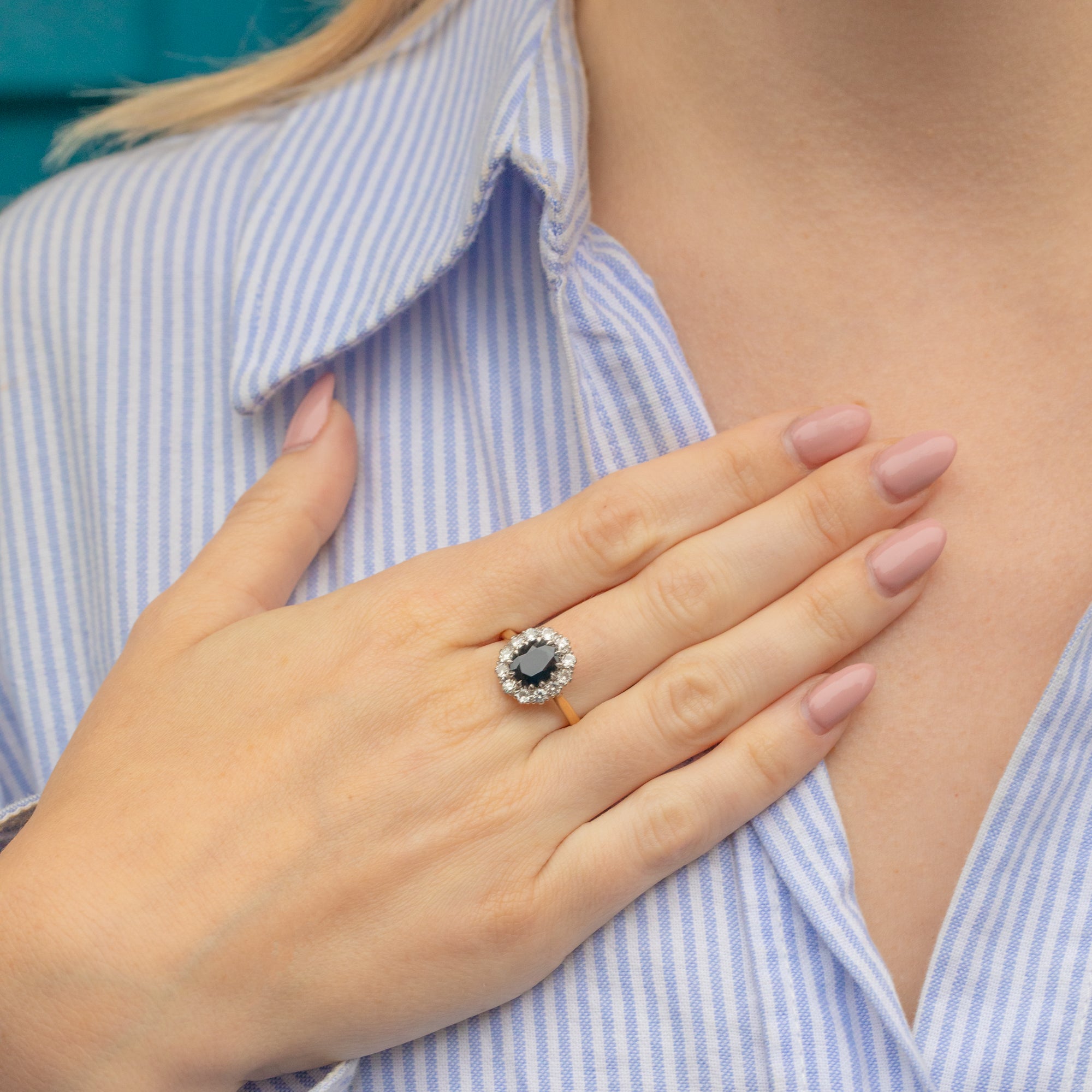This Art Deco 18ct Gold Sapphire and Diamond cluster ring will bring elegance and sophistication to the hand. The timeless cluster design is formed of a deep blue 1.25ct Sapphire at her centre, with a halo of scintillating Diamonds to compliment.