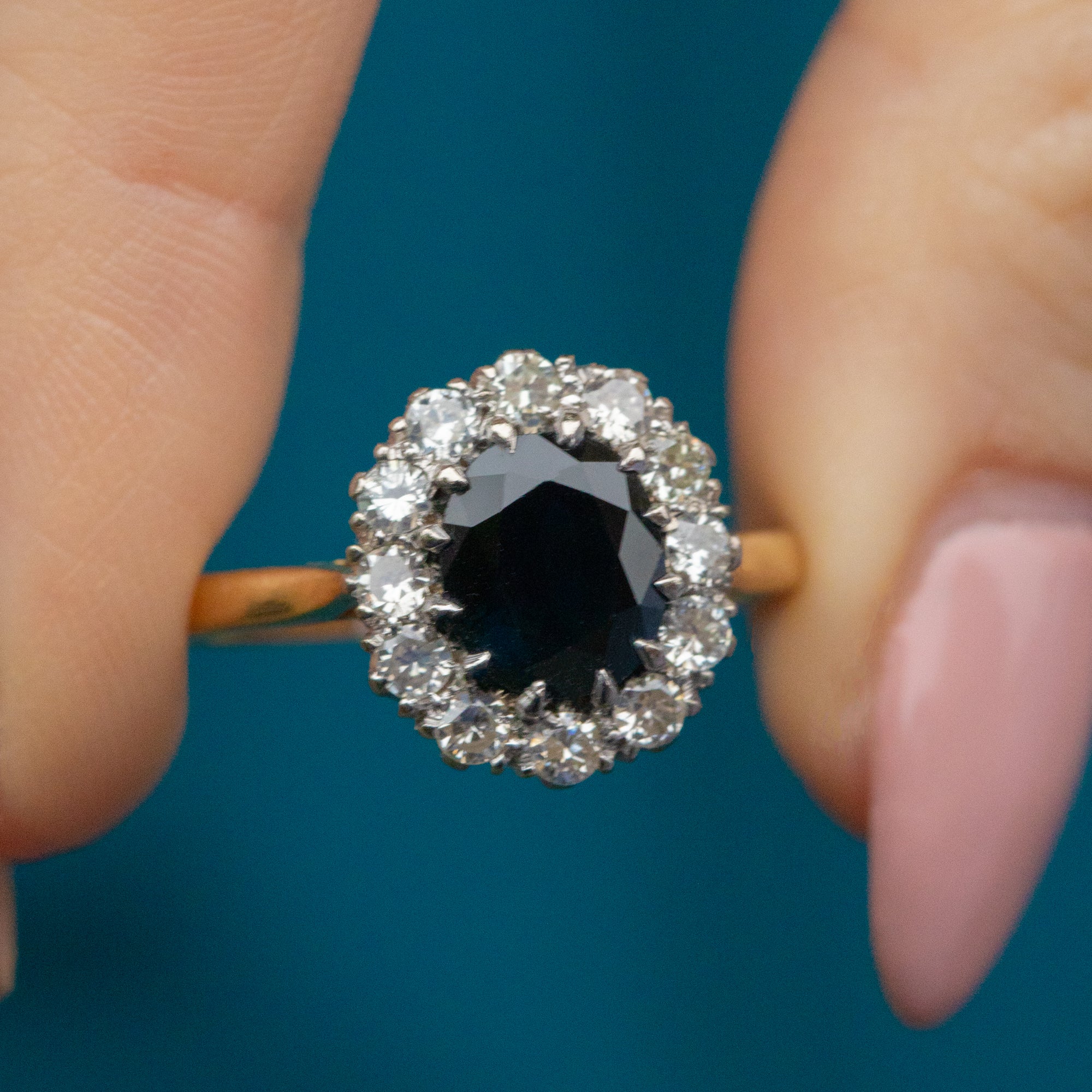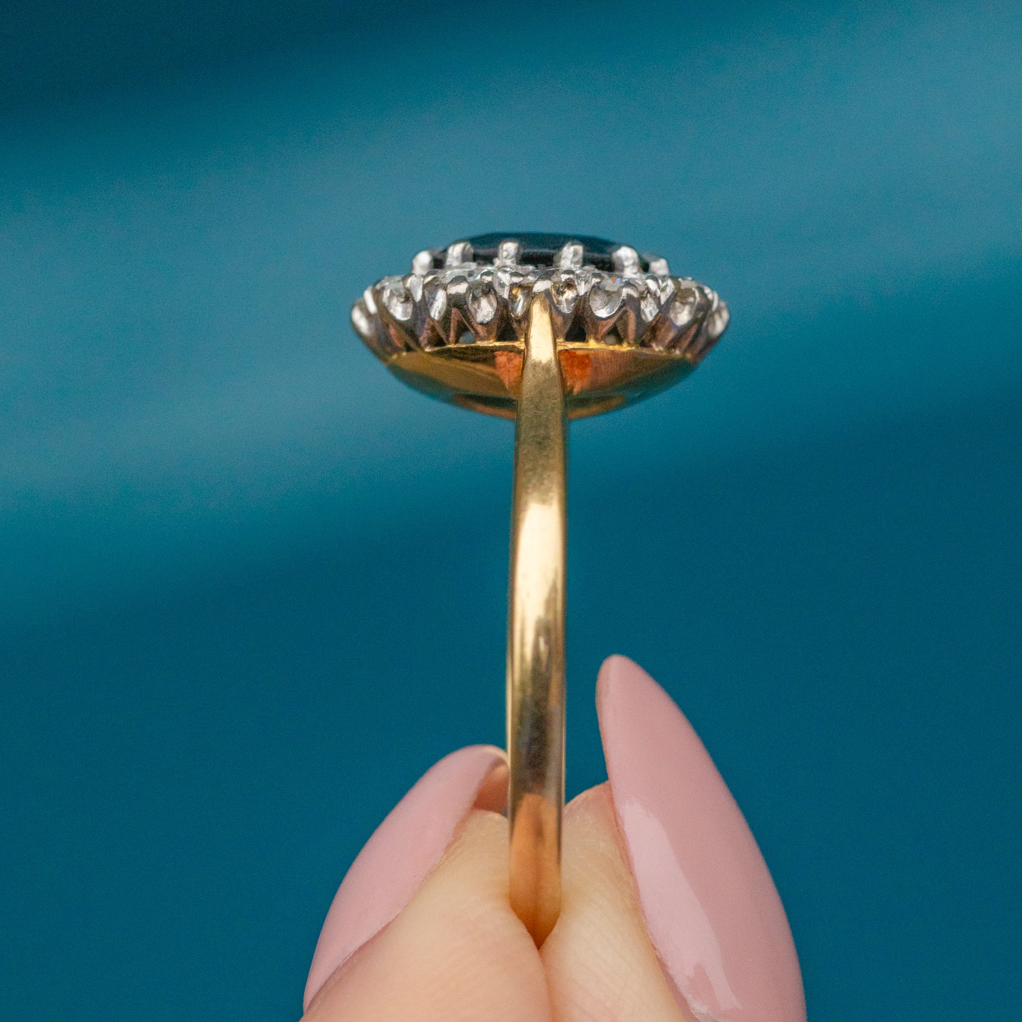 EXCELLENT. This Art Deco 18ct Gold Sapphire and Diamond cluster ring is in excellent condition. The Sapphire and surrounding Diamonds are secure in their settings, fabulously faceted and are free from chips or abrasions. Each of her claws are present and the white 18ct Gold gallery provides lovely detail around her circumference. The 18ct yellow Gold shank is well rounded and glides onto the hand a dream. She truly is is an Art Deco delight!