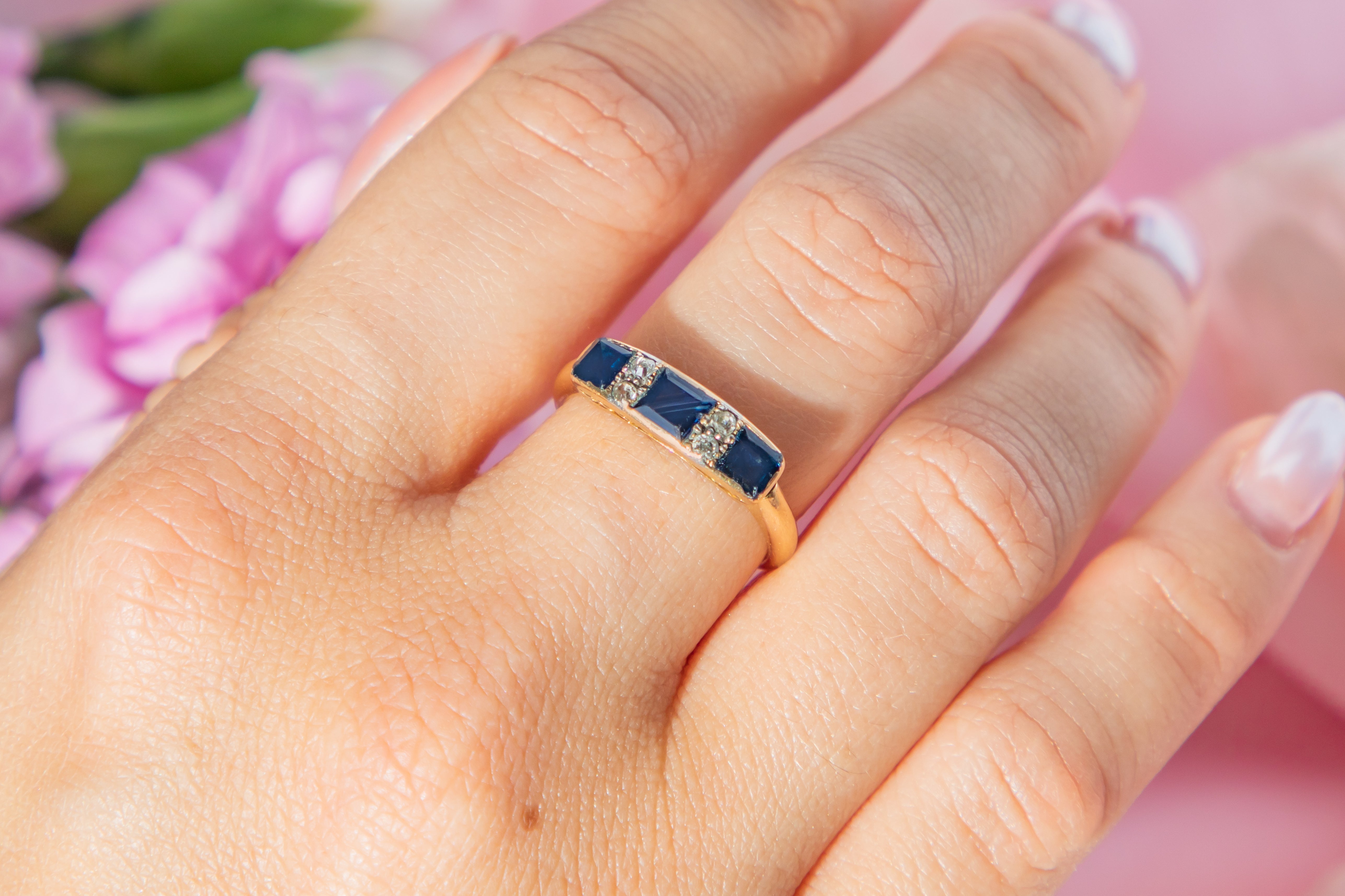 This Art Deco 18ct Gold Sapphire Diamond ring is a fine example of craftsmanship during the early 1900s! Boasting three square Sapphires, flaunting moody deep blue hues, with four mesmerising Diamonds nestled between - she looks as though she has been plucked from the night sky!