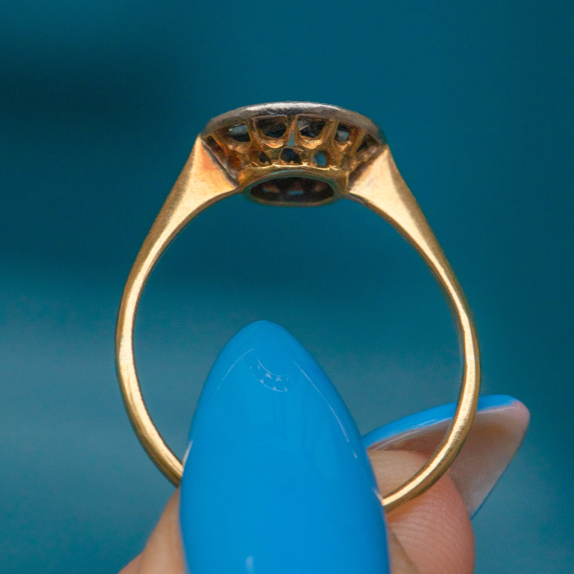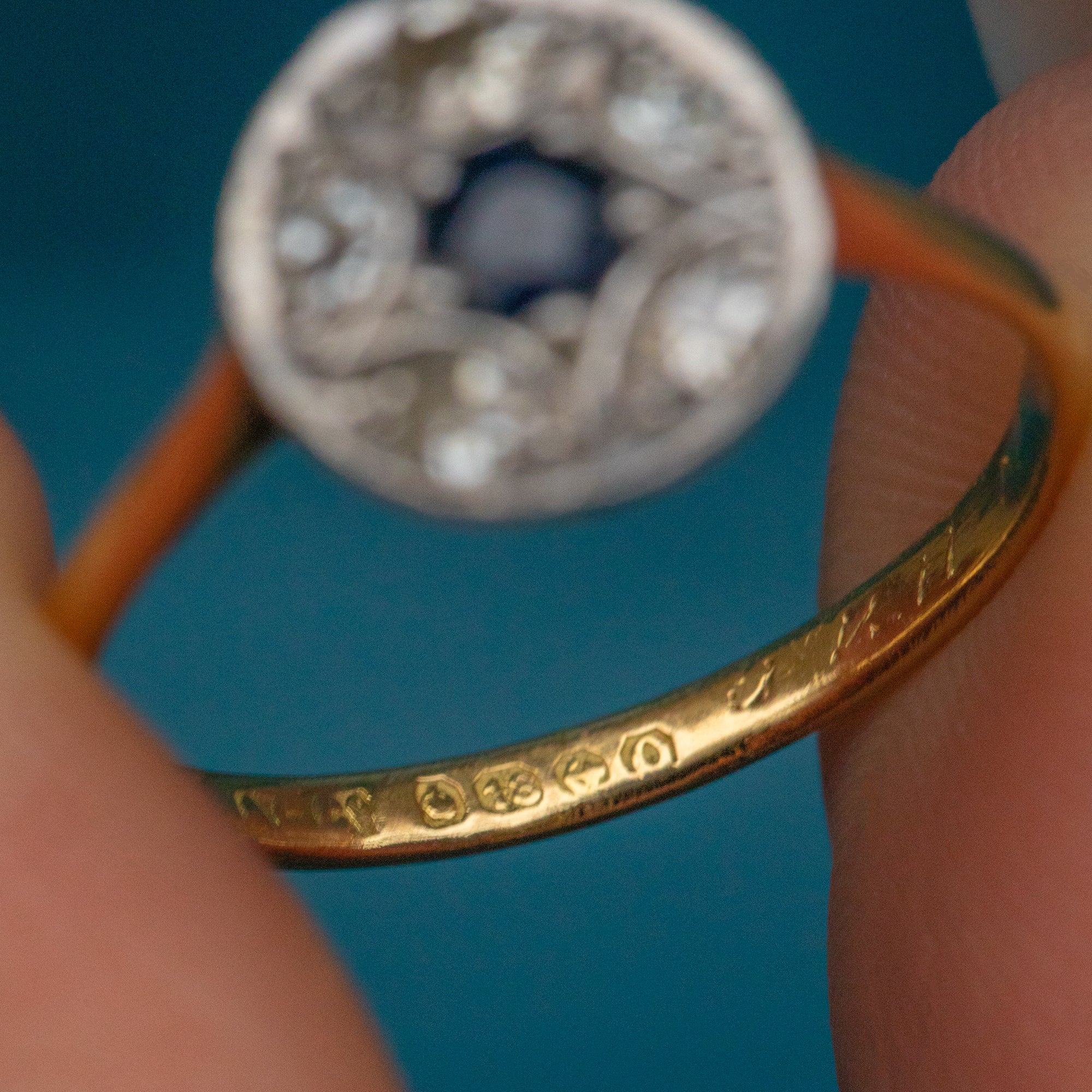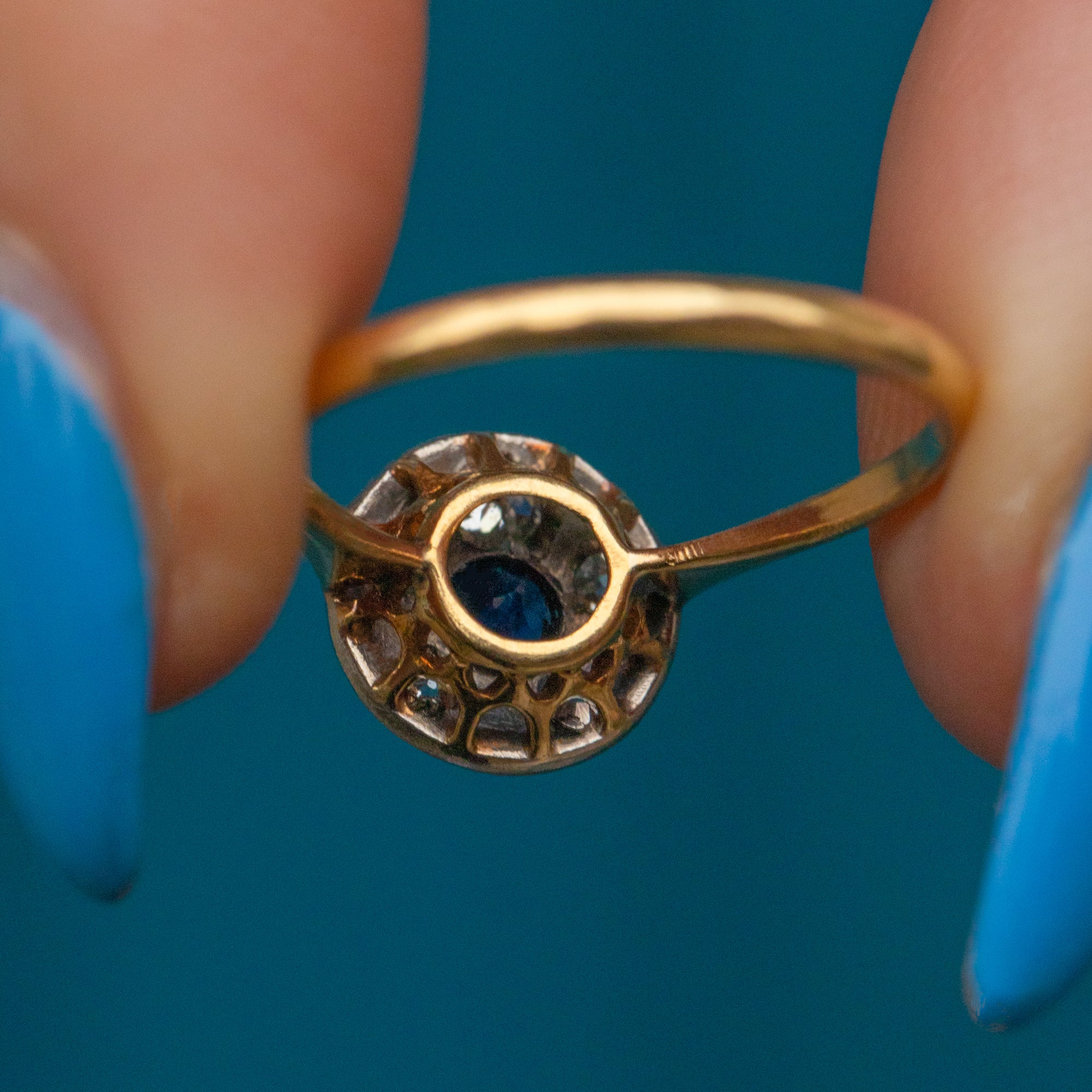 EXCELLENT. This Art Deco 18ct Gold Sapphire Diamond star cluster ring is in excellent condition. Her gemstones are radiant, free from surface wear, sitting securely within their settings. With little wear to note, she provides a confident and comfortable wear.