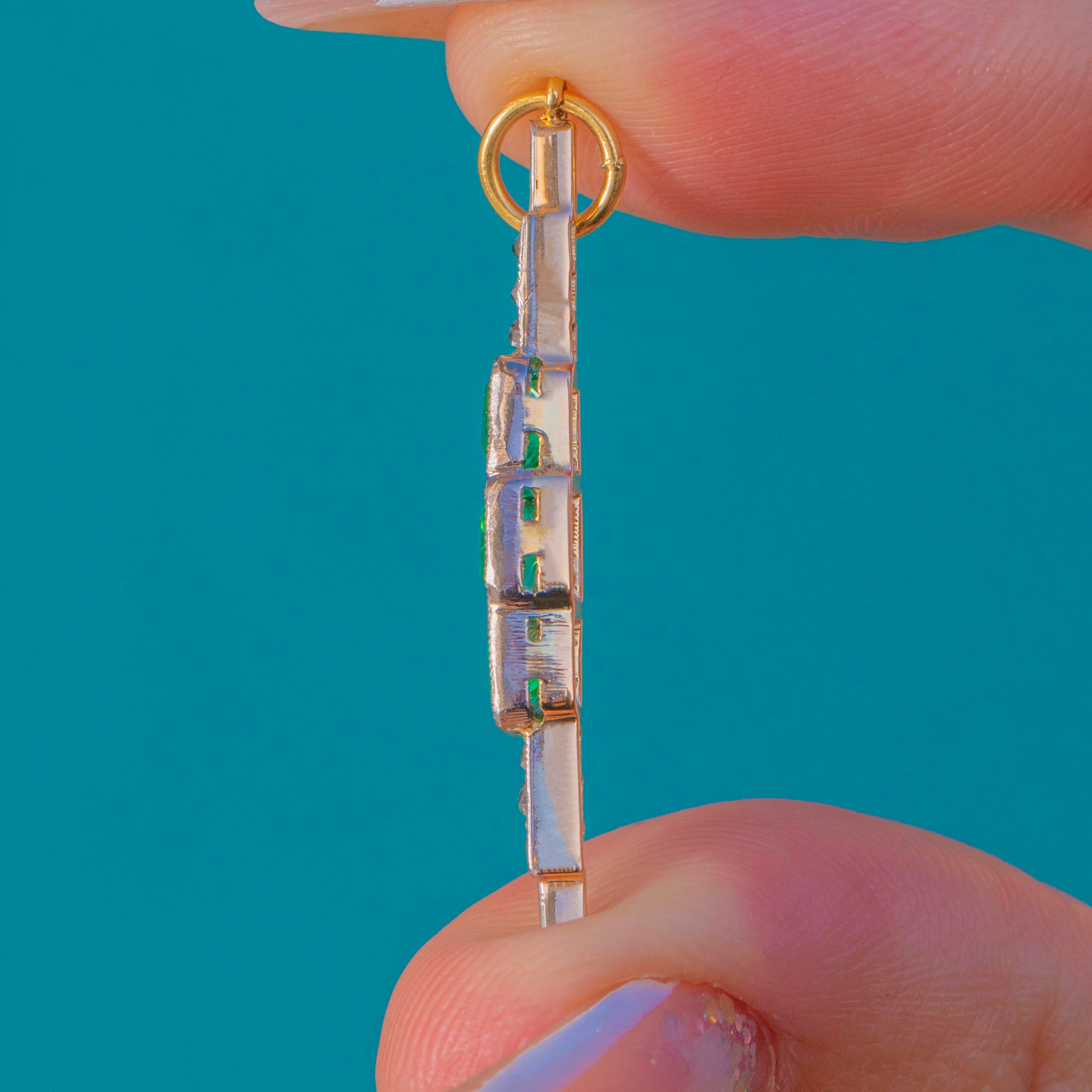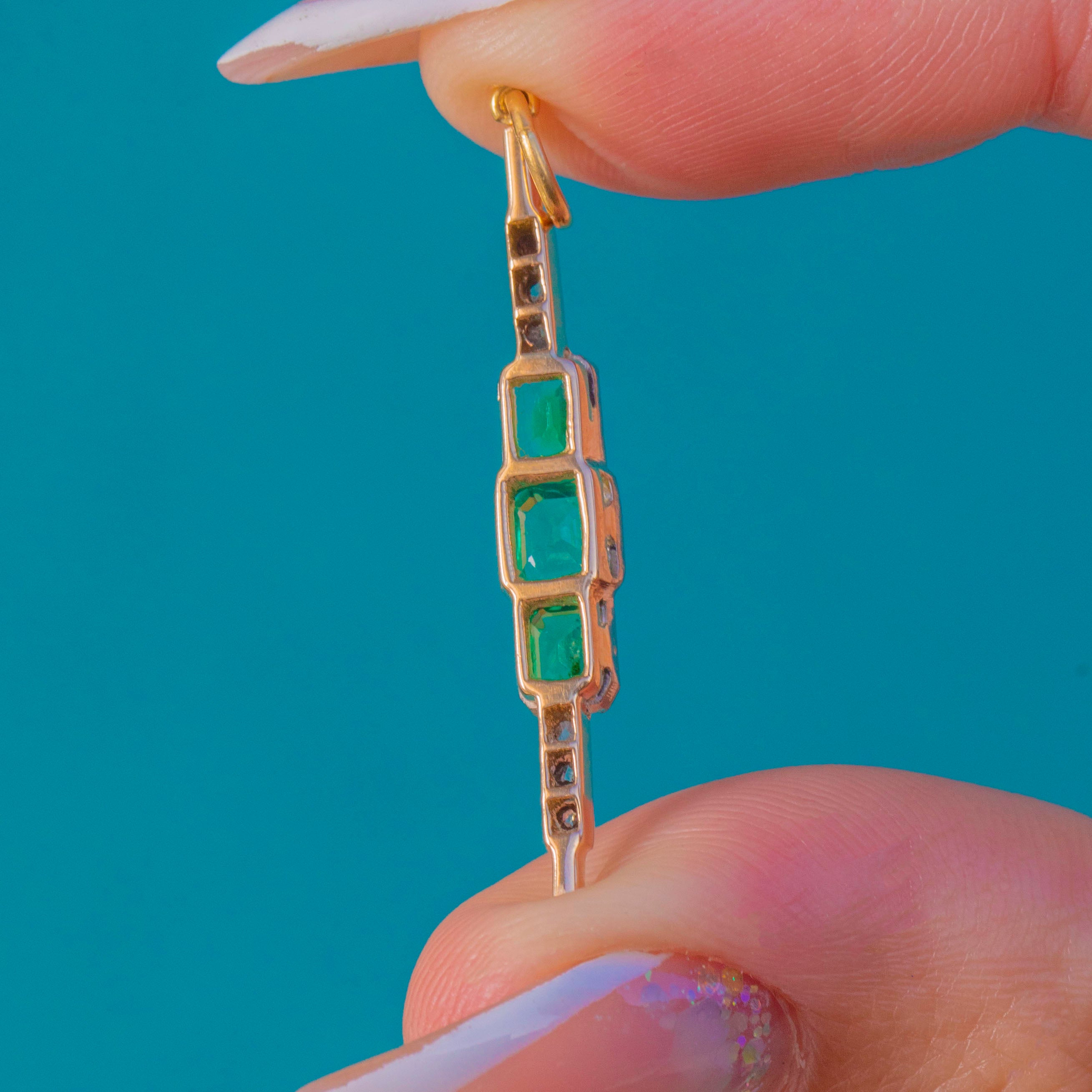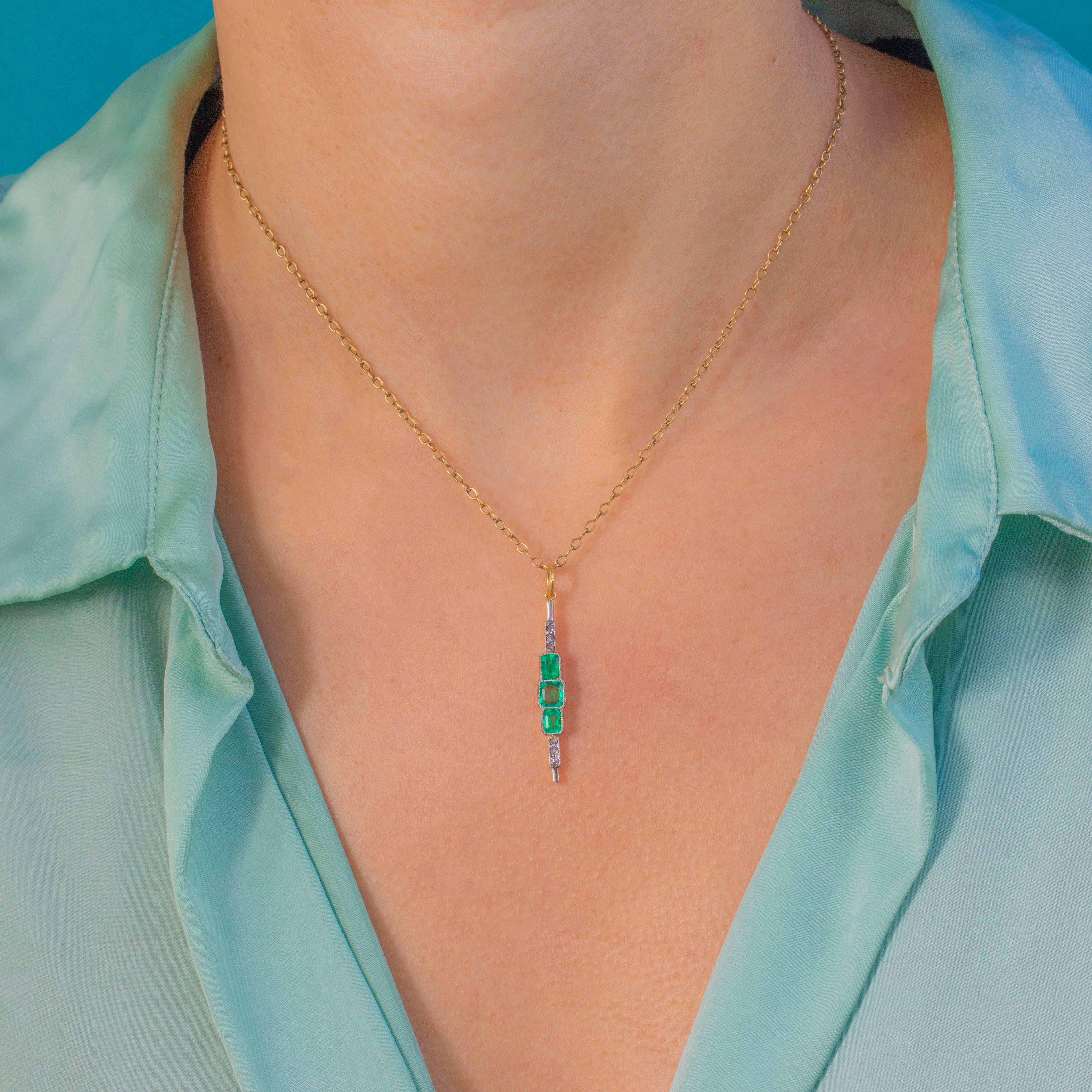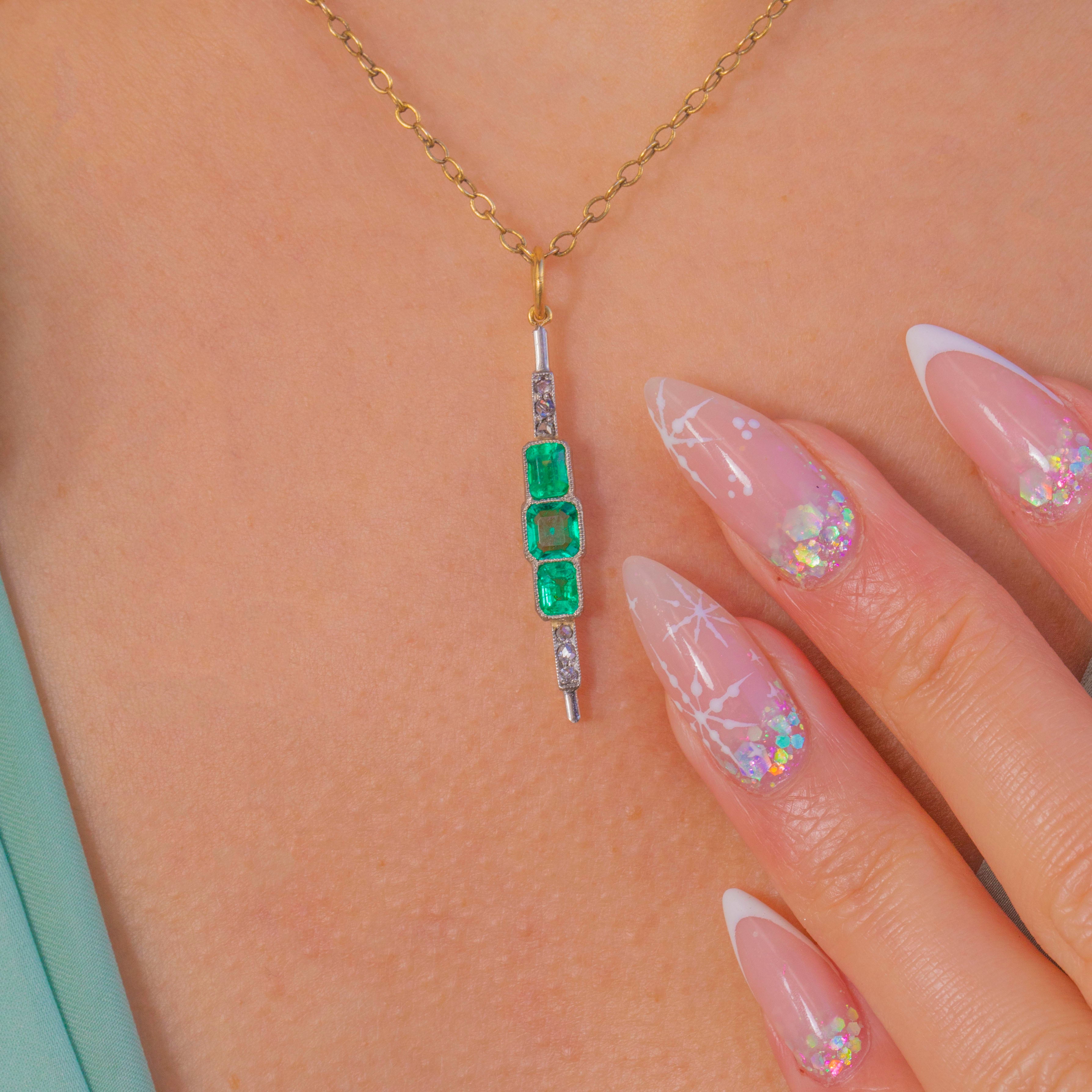 Sleek, elongated and gloriously Deco, this 1920s bar pendant marries crisp geometry with a refined two‑tone palette. Crafted in 18ct Yellow Gold with Platinum settings, the white‑toned, milgrained front is punctuated by three step‑cut Emeralds arranged in a vertical stack— a square Emerald at the centre flanked by two rectangular emerald‑cuts—while dainty rose‑cut Diamonds sparkle at the finials for a perfectly balanced finish.