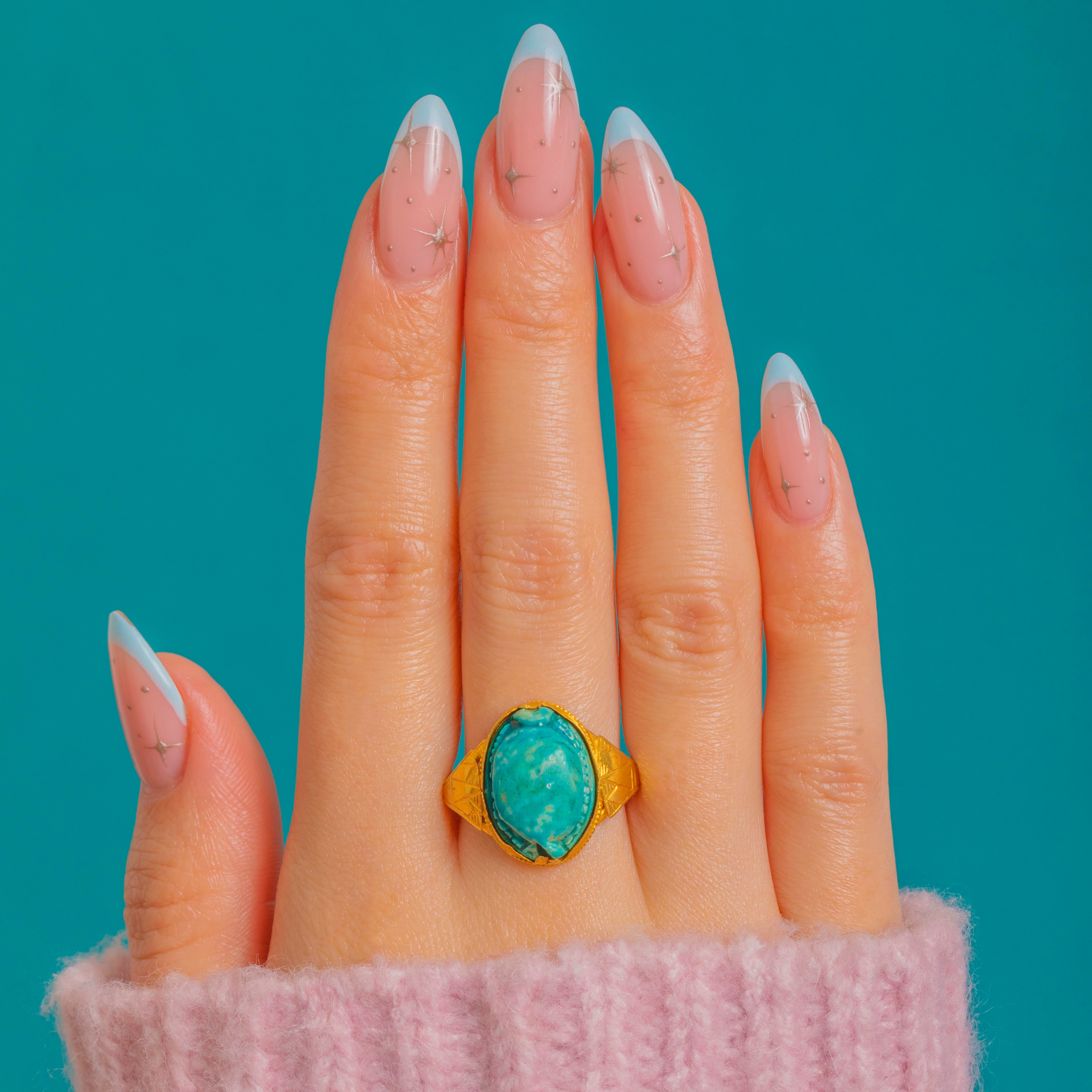The warm glow of 22ct Gold contrasts beautifully with the cool turquoise tones of the scarab, creating a piece that looks wonderfully sculptural on the hand. An evocative jewel for lovers of history, symbolism, and unapologetically bold design.
