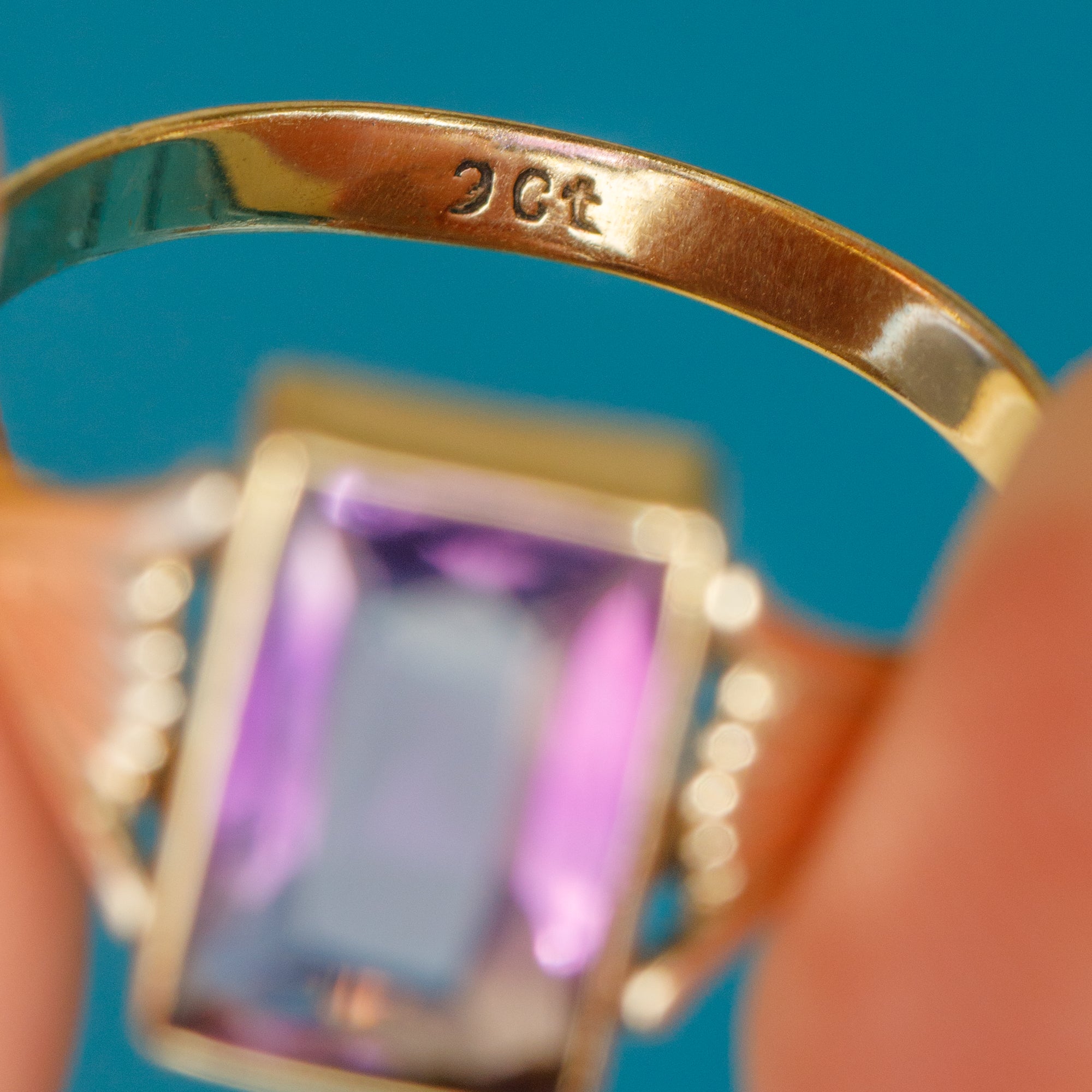 VERY GOOD: This Art Deco 9ct Gold Amethyst ring is in very good condition. The Amethyst is securely set and is free from any chips or damage to note. The shoulders are beautifully crisp, and the ring shank allows you to wear this piece comfortably. While there is a little bit of wear at the back of the band, this is of course not visible during wear. A striking piece of Art Deco jewellery ready to be enjoyed for many more years to come!