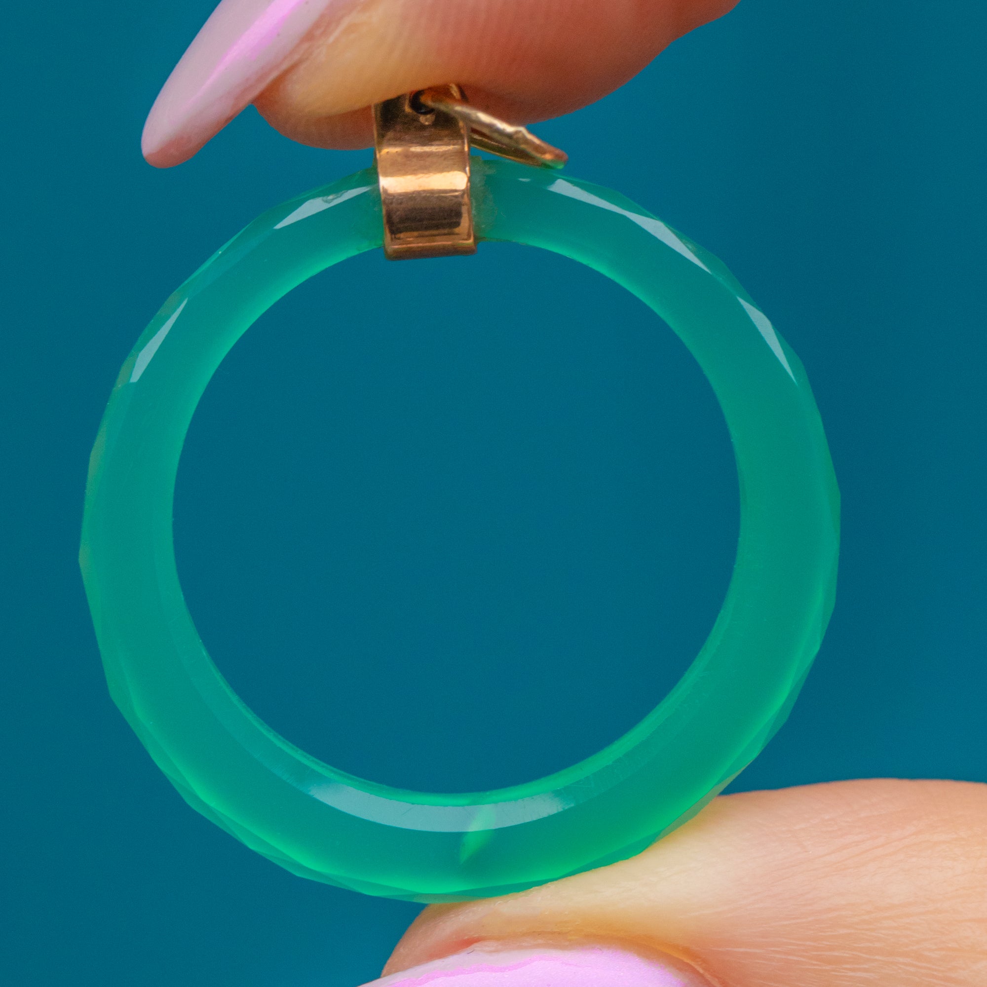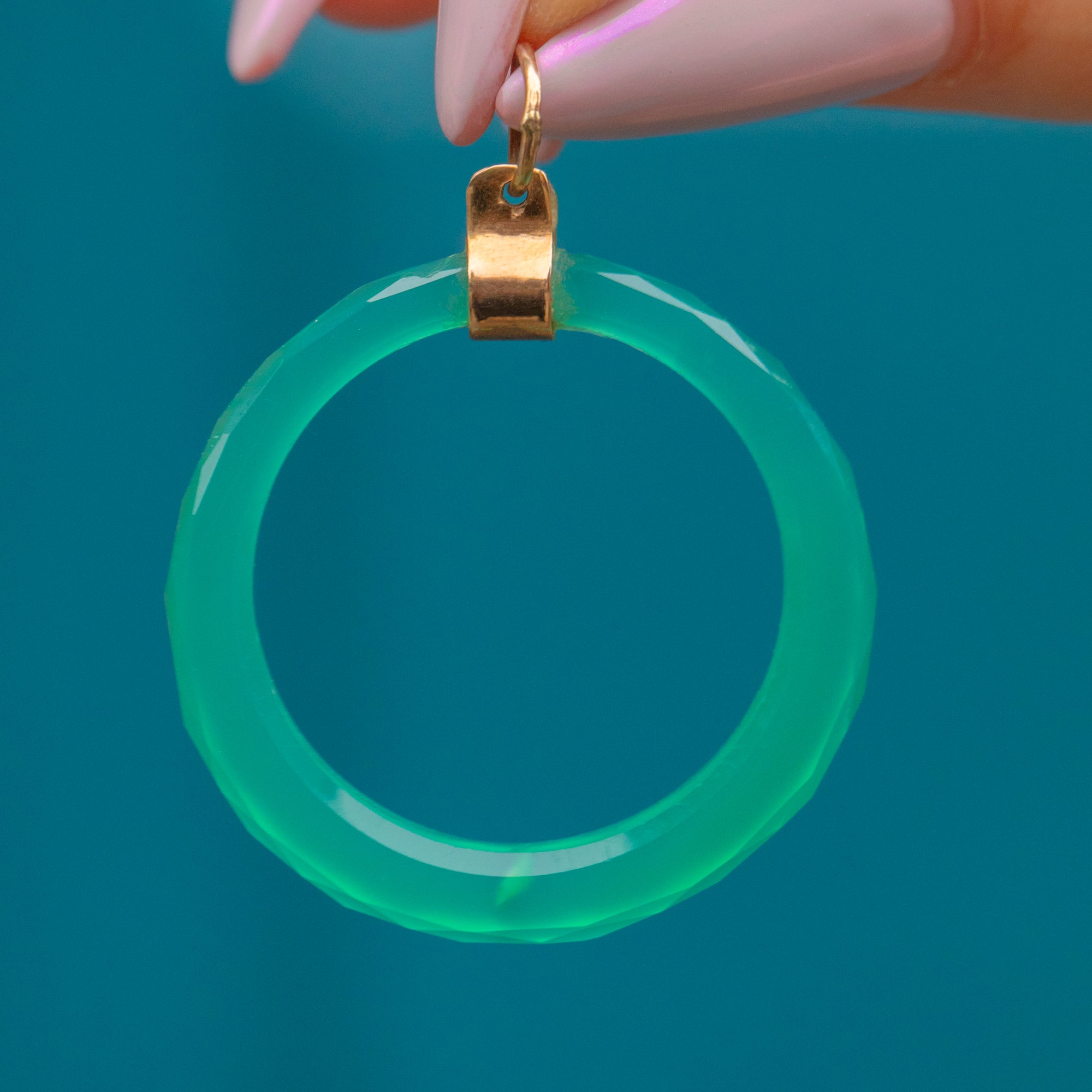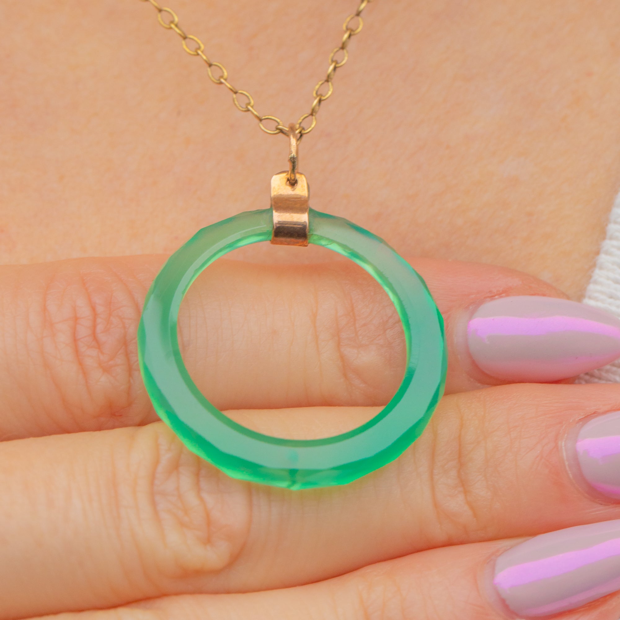 A sleek Art Deco pendant fashioned from vivid green glass, cut with crisp faceted edges for fabulous geometric sparkle. The clean circular form is finished with a polished 9ct Gold bale for a refined contrast of colour and texture.