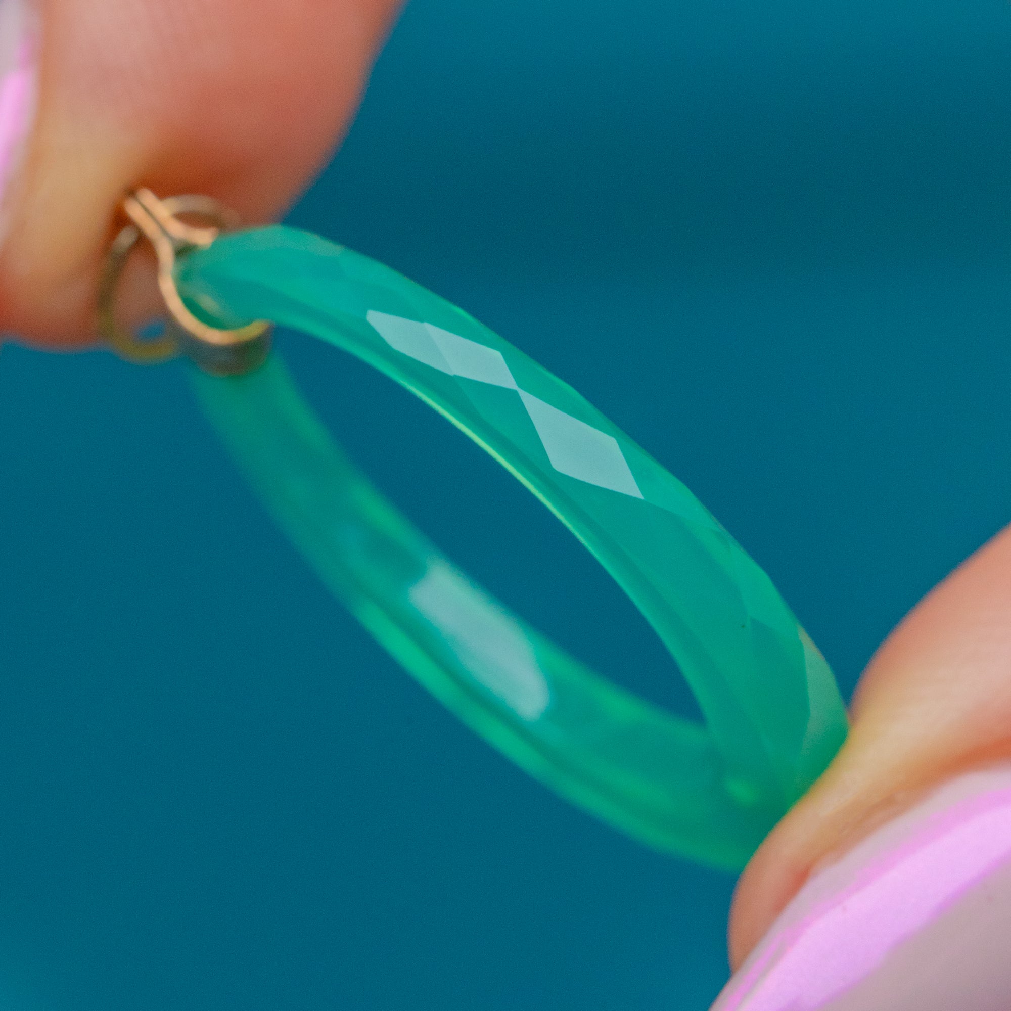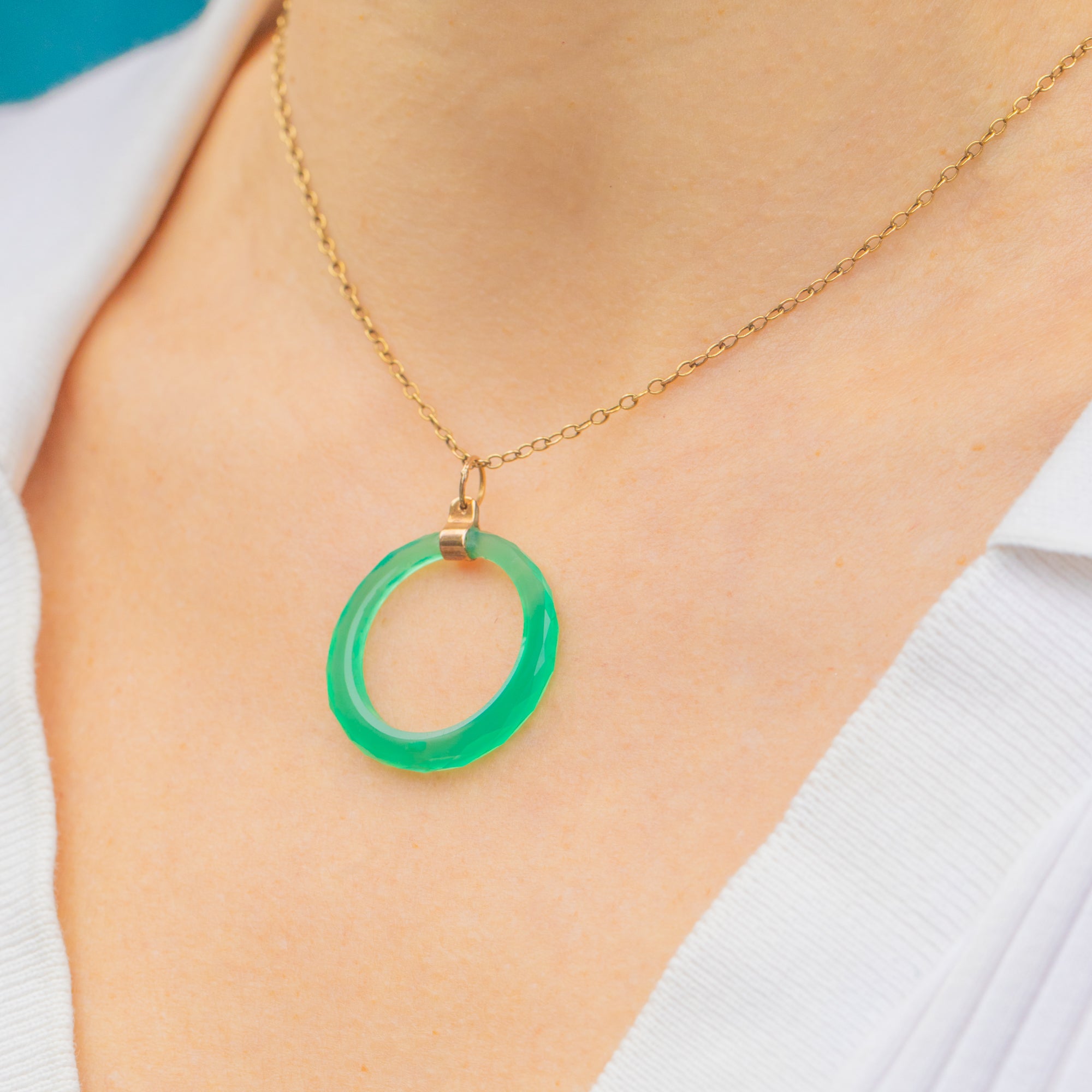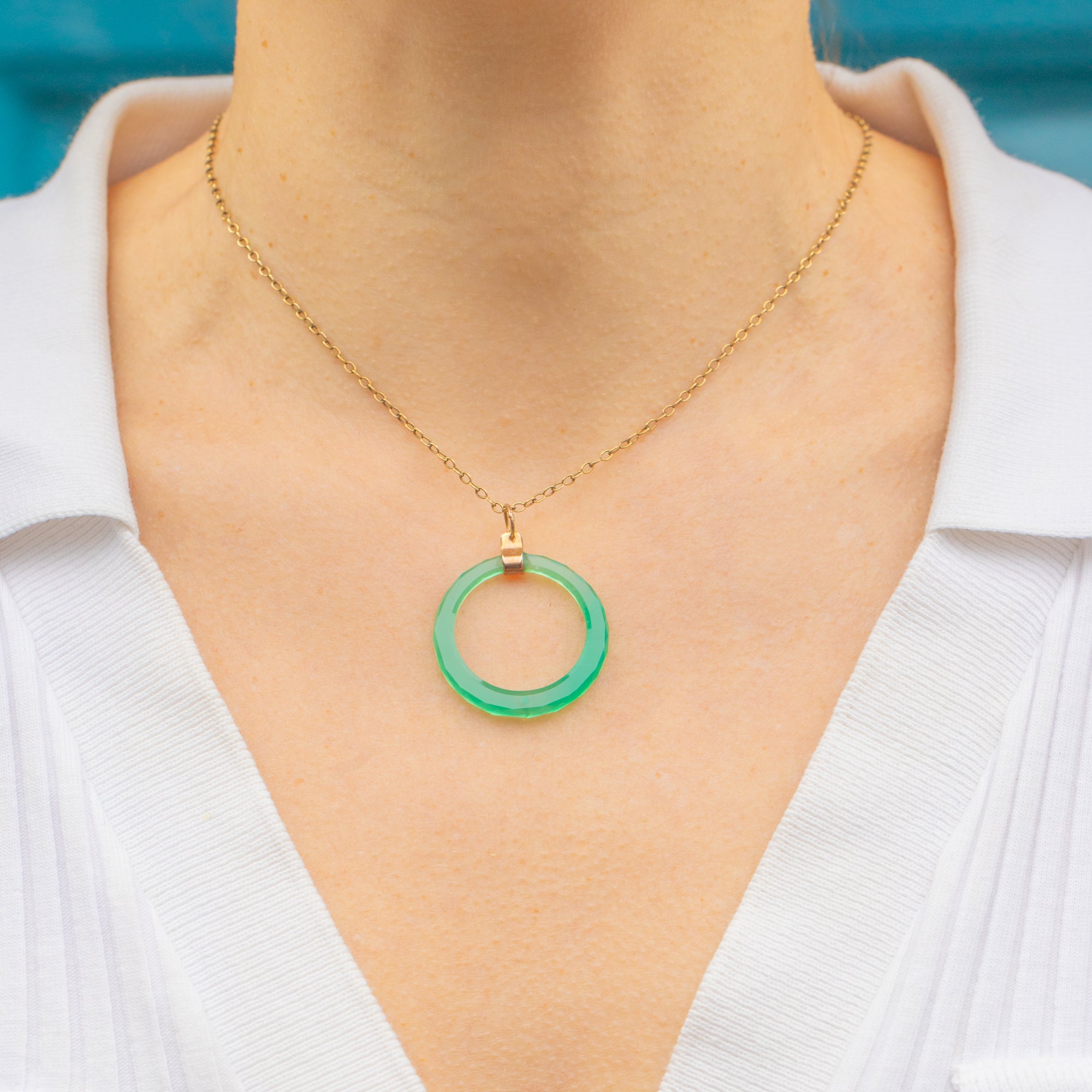 A sleek Art Deco pendant fashioned from vivid green glass, cut with crisp faceted edges for fabulous geometric sparkle. The clean circular form is finished with a polished 9ct Gold bale for a refined contrast of colour and texture.