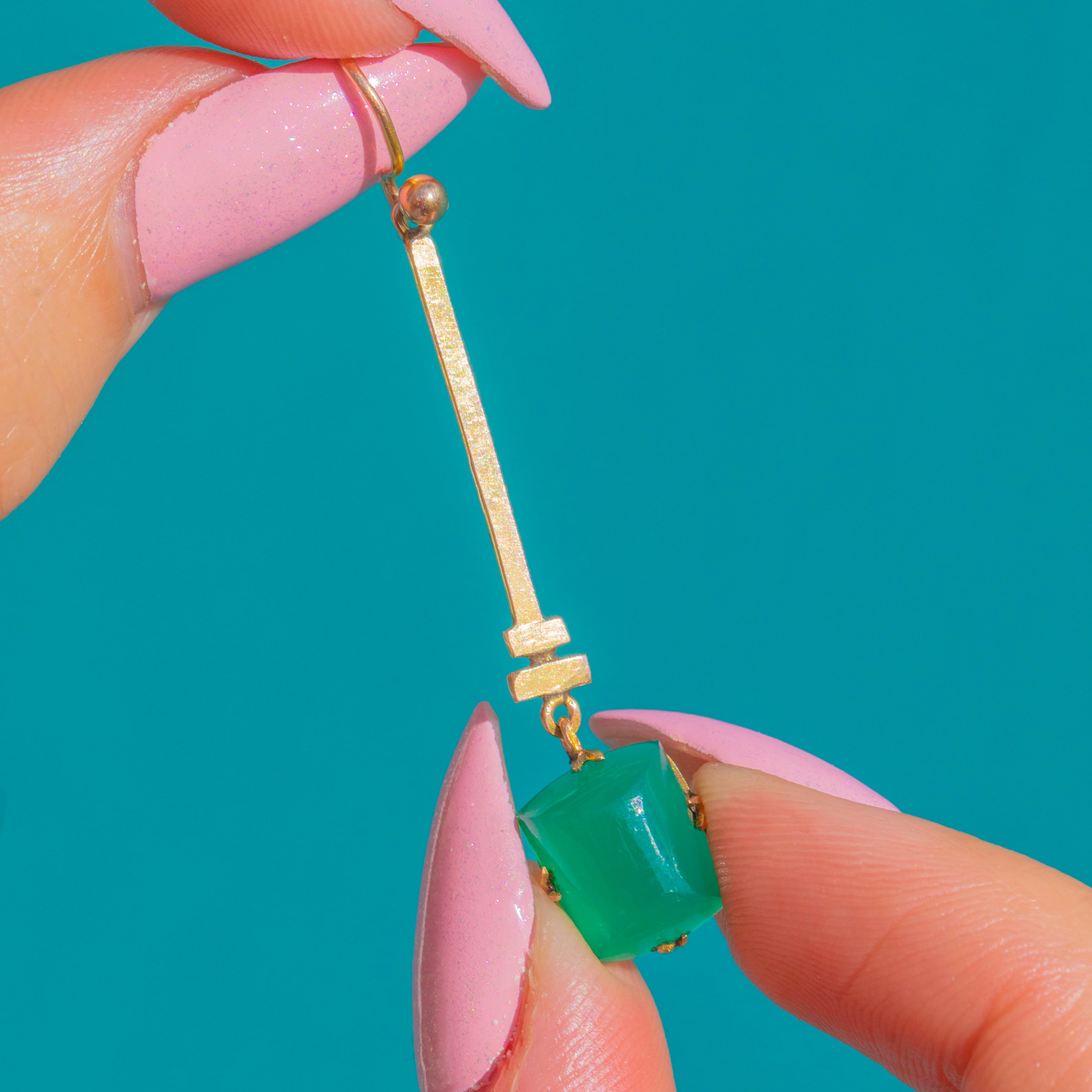 Sleek and sculptural, these Art Deco 9ct Gold drop earrings distil the era’s love of clean lines and vivid colour. A slender, textured bar leads the eye to a lush green Chalcedony drop, the saturated hue glowing beautifully against warm Gold.