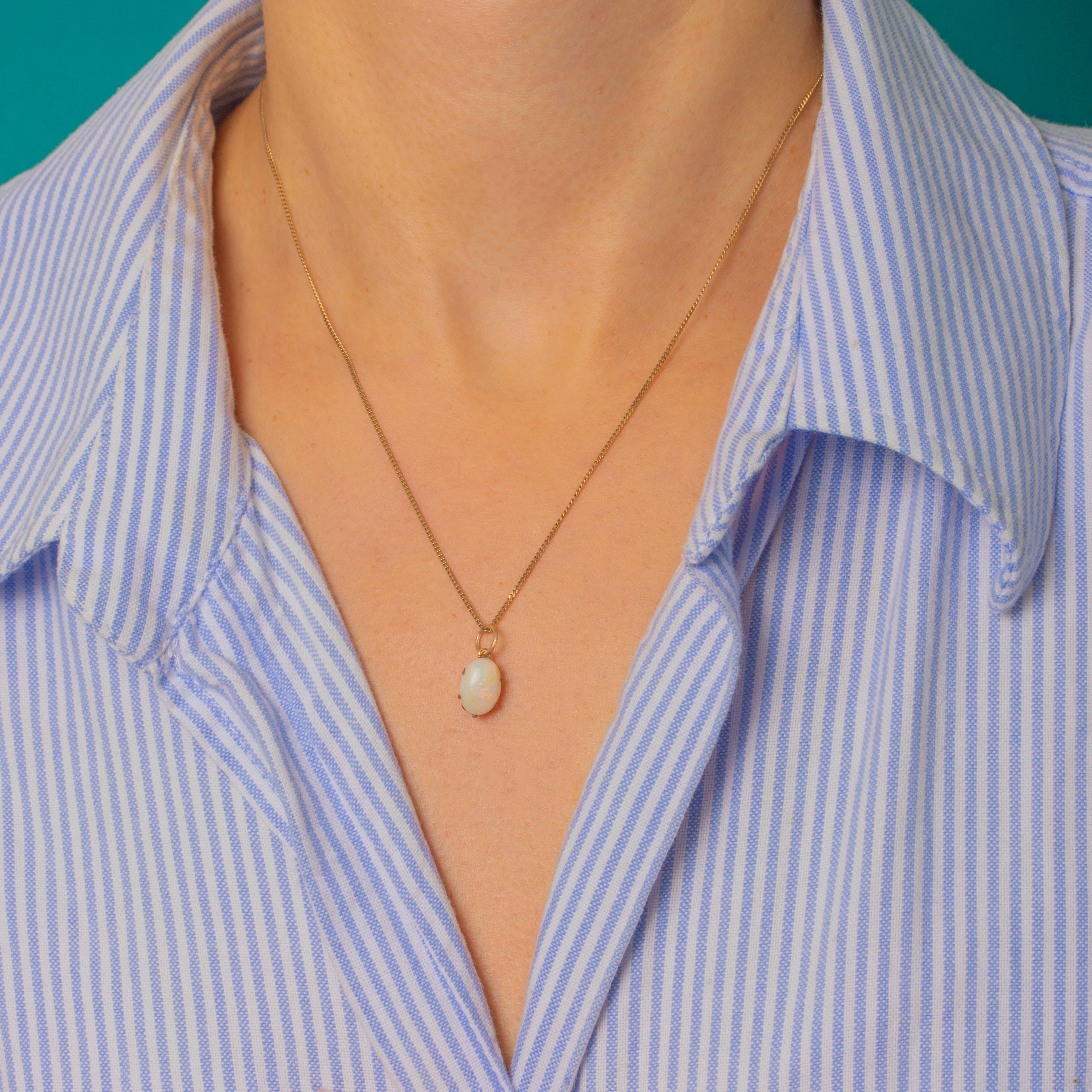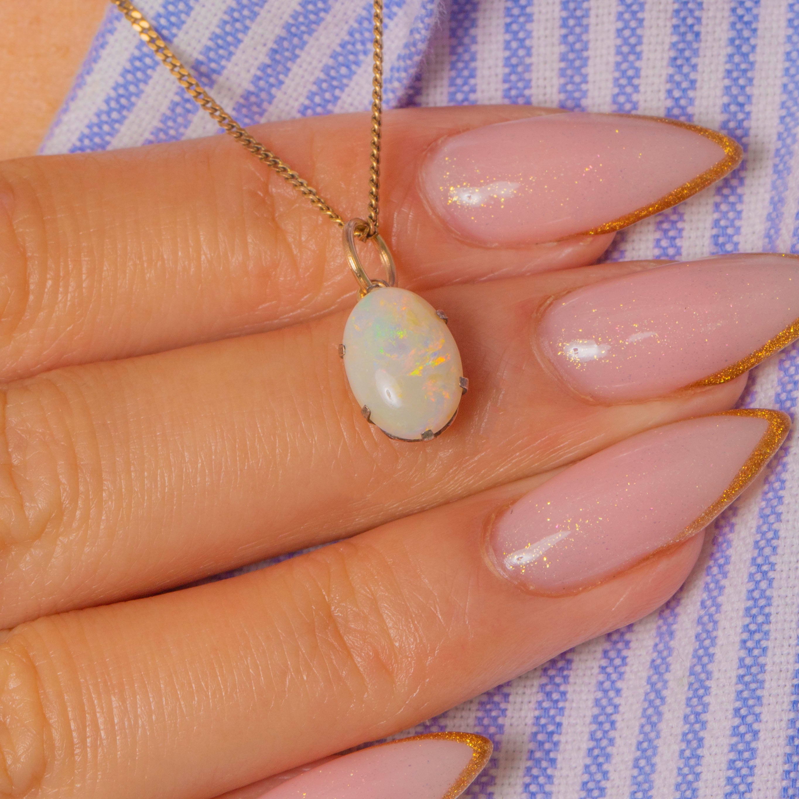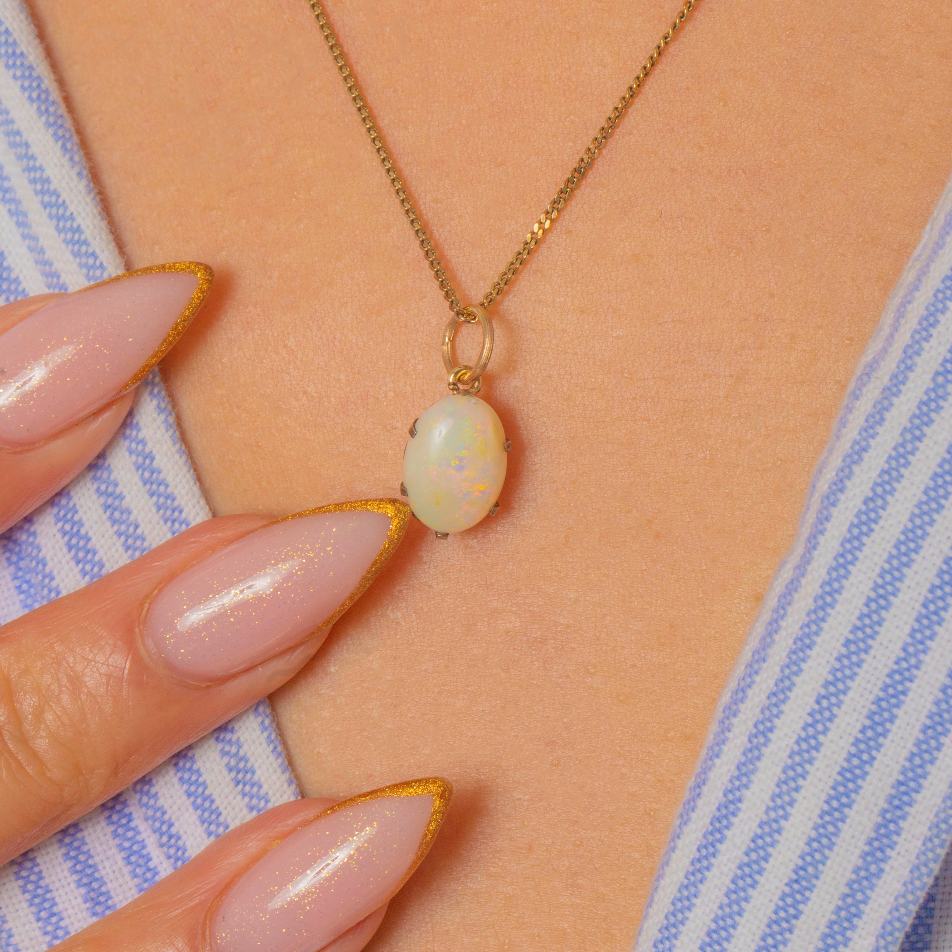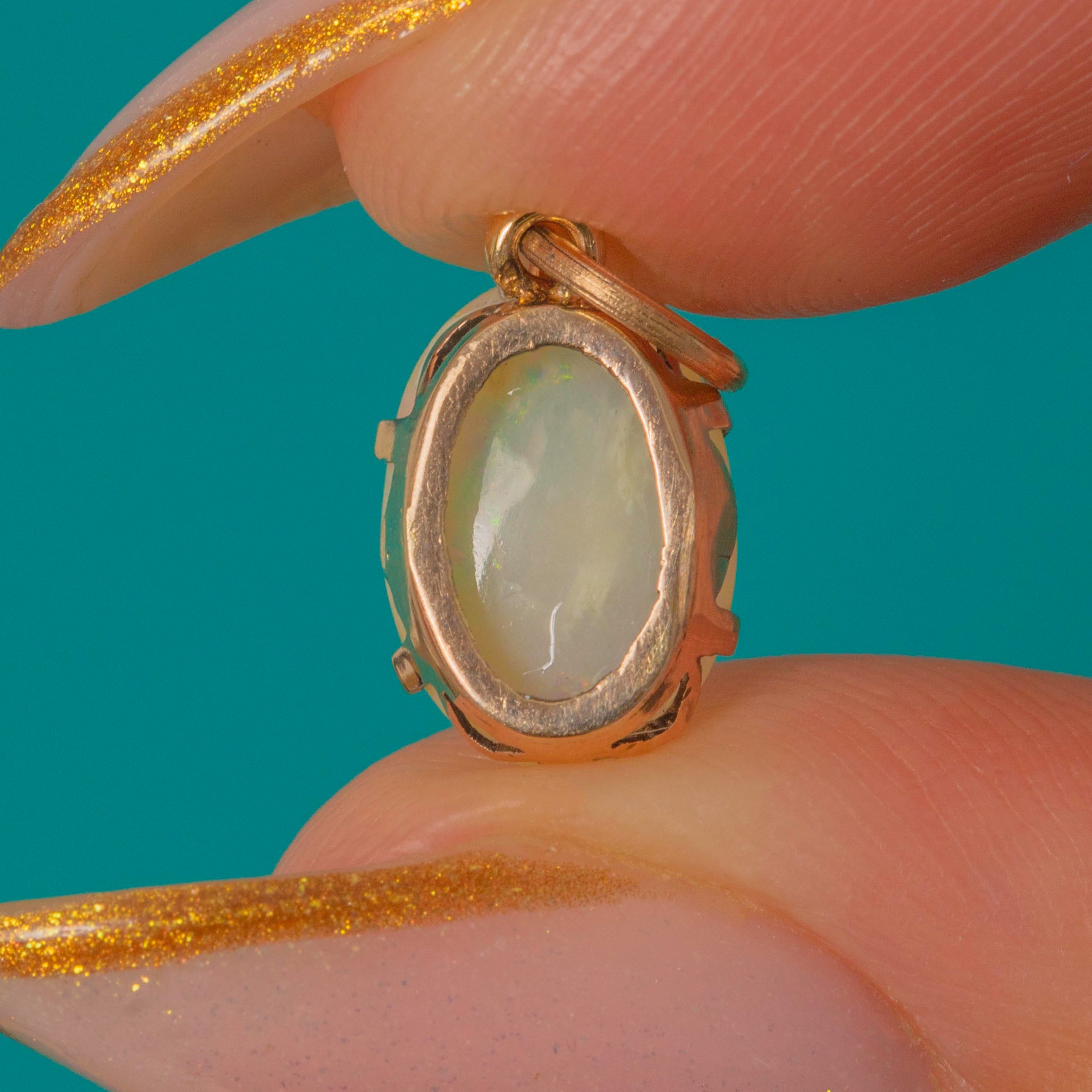 A dainty Art Deco Opal charm set in glowing 9ct Gold. The natural solid Opal, weighing approximately 0.92ct, shimmers with vibrant pastel flashes of green, pink and violet.