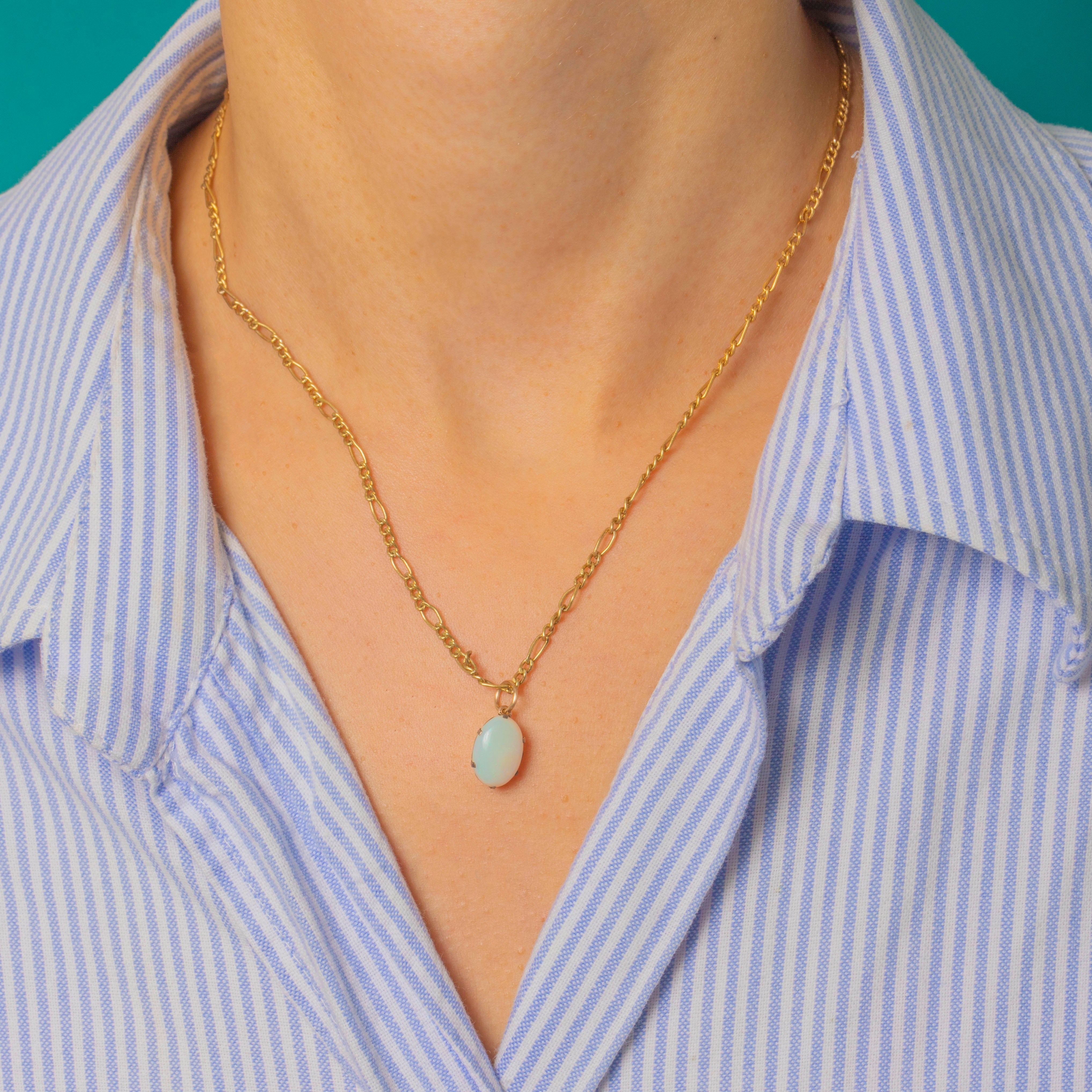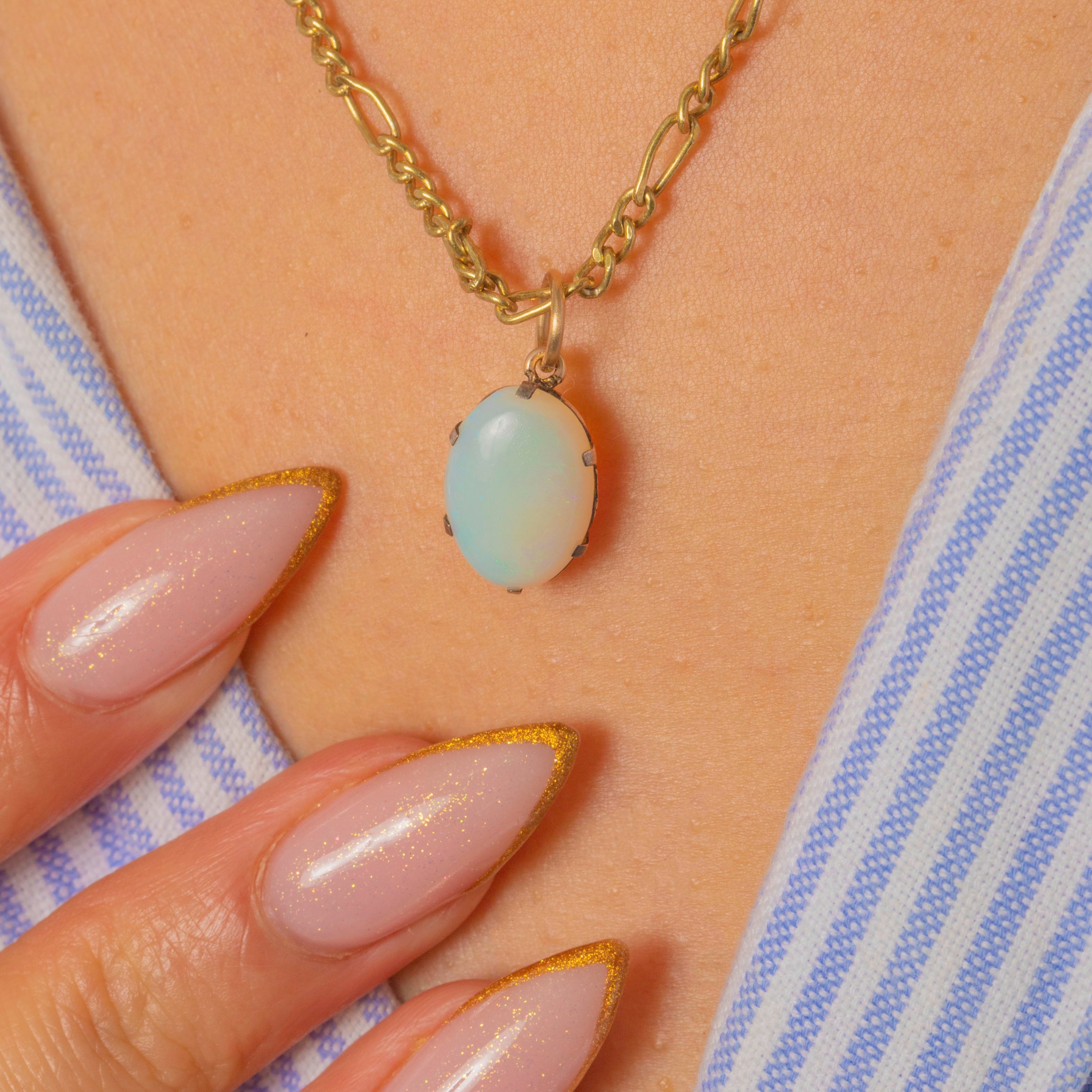 This dreamy Art Deco Opal charm is alive with colour and light. The natural solid 2.11ct Opal shimmers with enchanting hues of pink, green and turquoise, glowing softly in every movement.