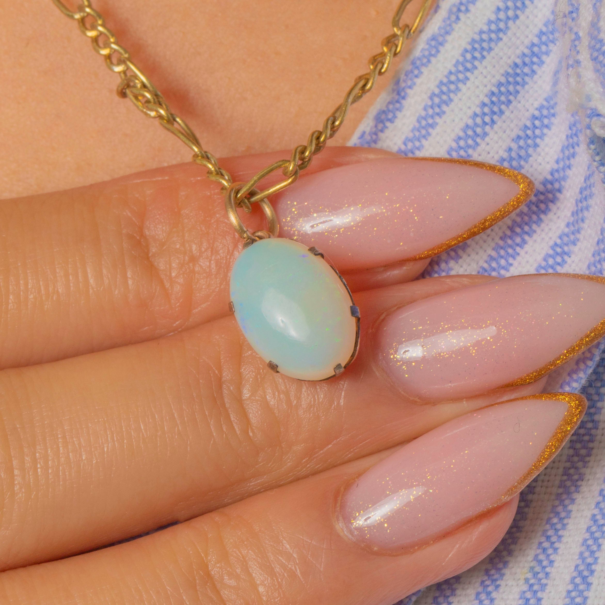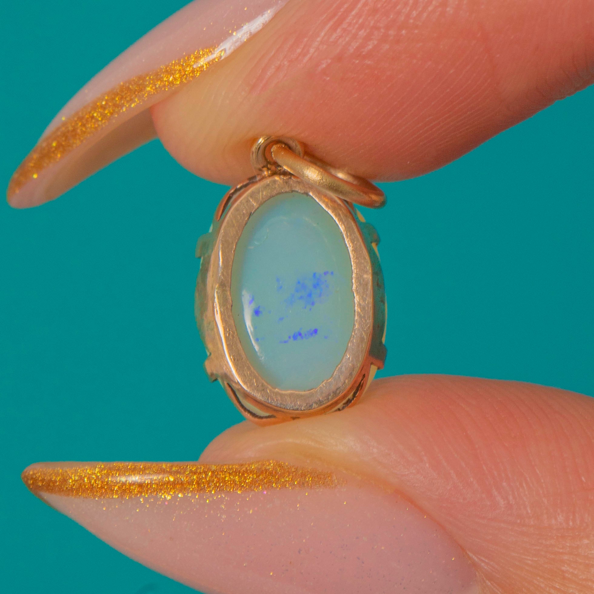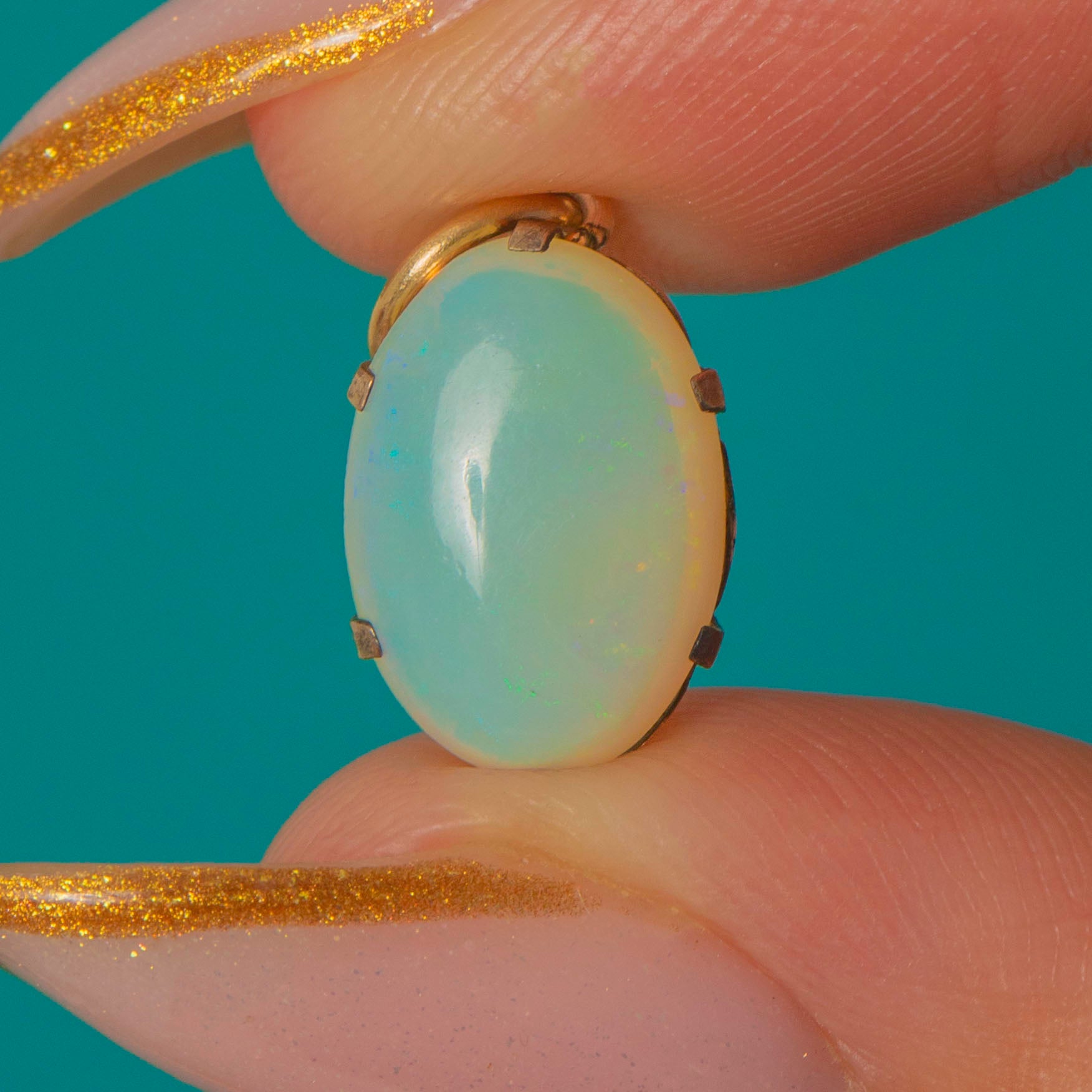 EXCELLENT: The Opal is smooth and glossy with strong play-of-colour and no chips or cracks. The Gold claws and jump ring are secure, bright and in lovely condition.
