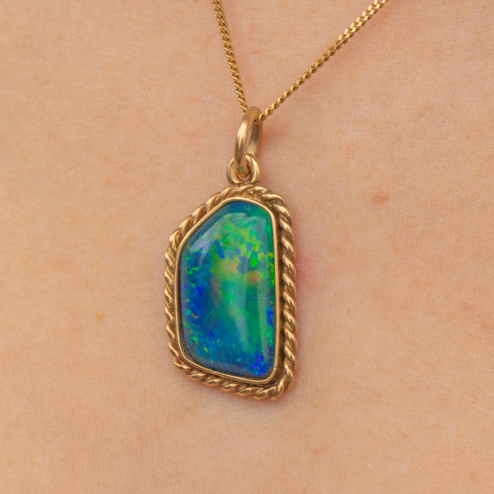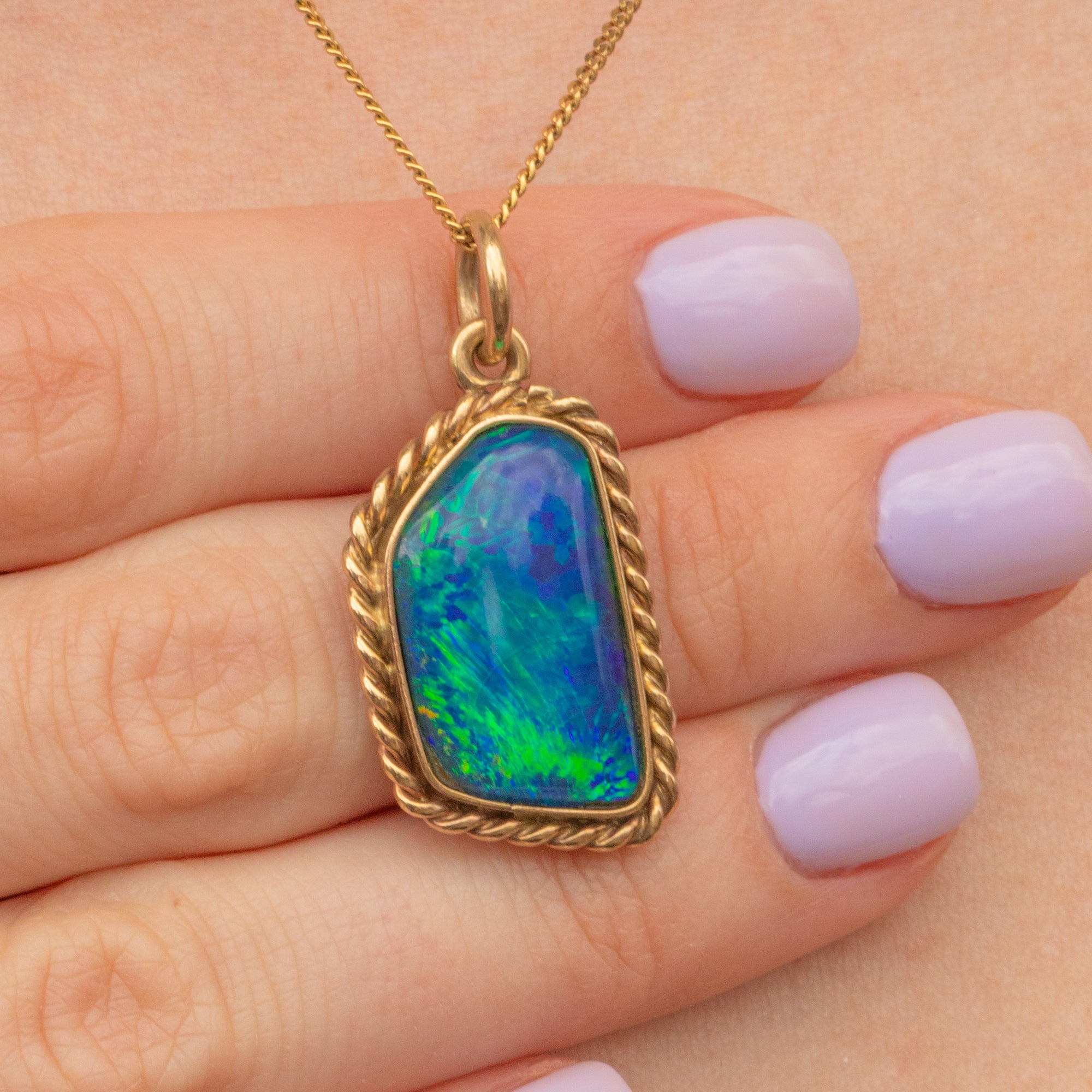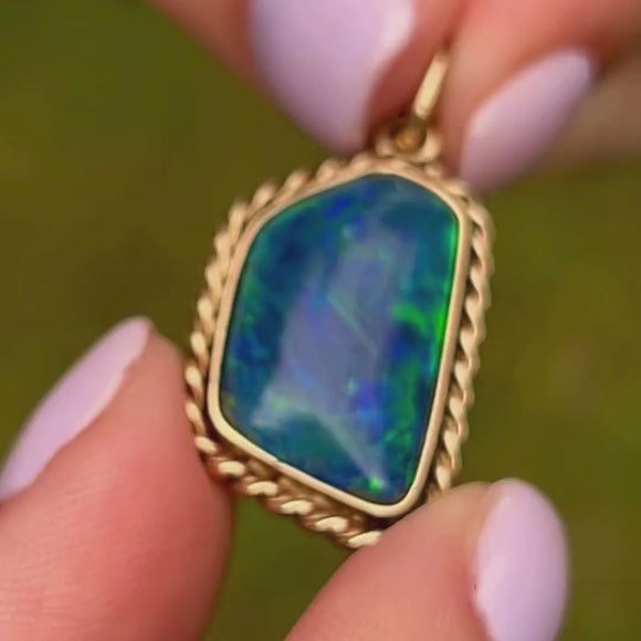 EXCELLENT. This Art Deco 9ct Gold black Opal doublet pendant is in excellent condition. The Opal is securely set, smooth to the touch, and has a divine display of colour! The 9ct Gold is buttery with the rope border securely soldered, and sitting flush against the skin.