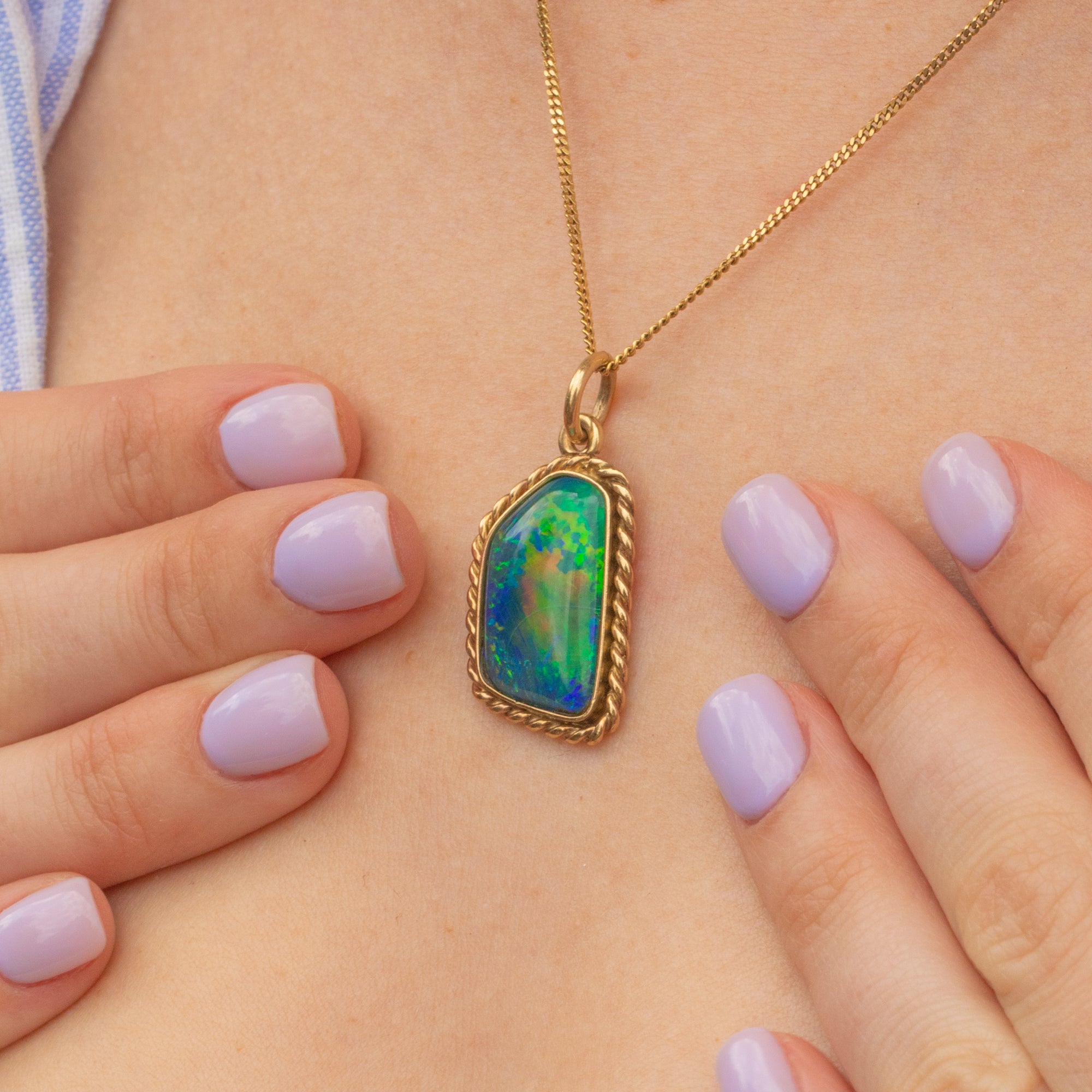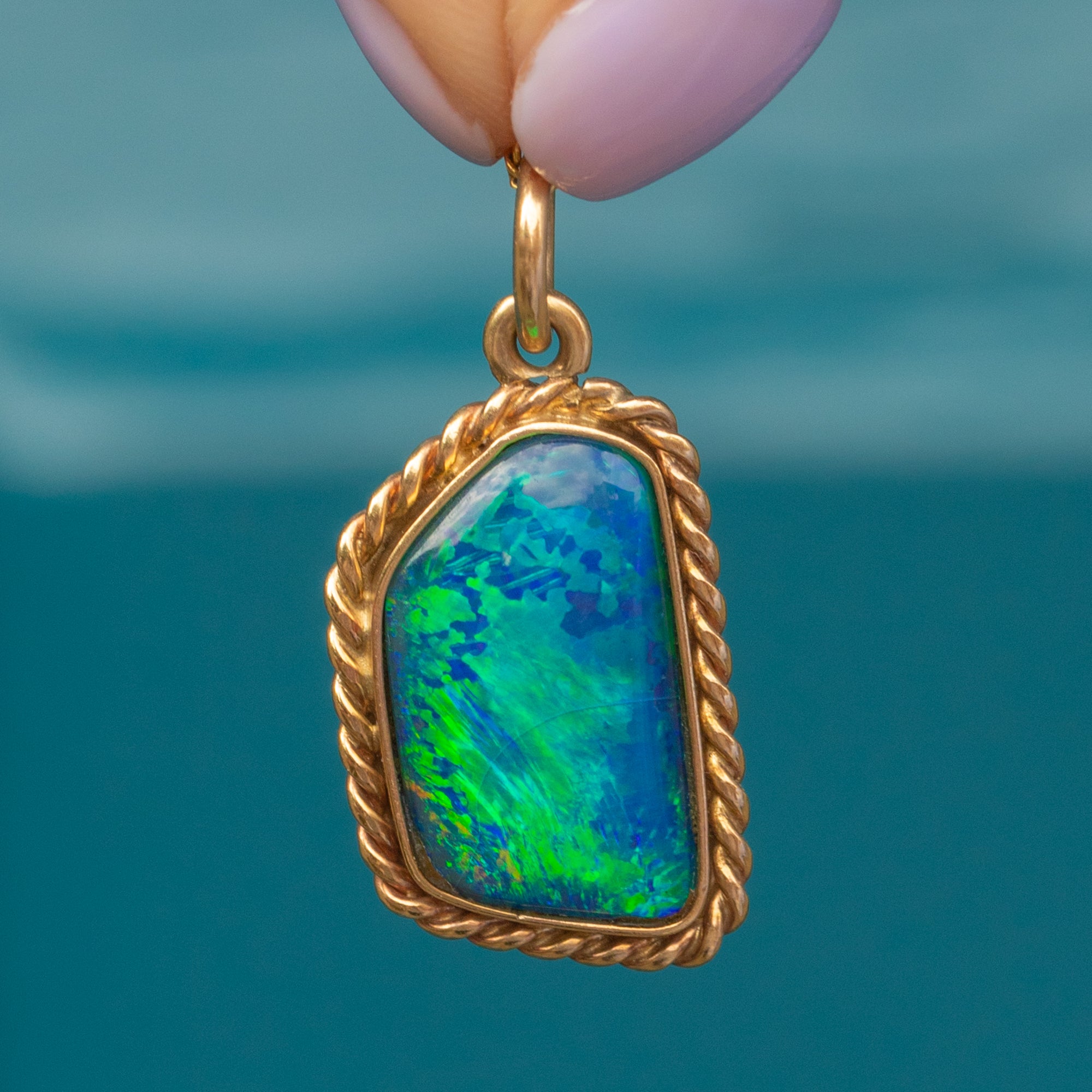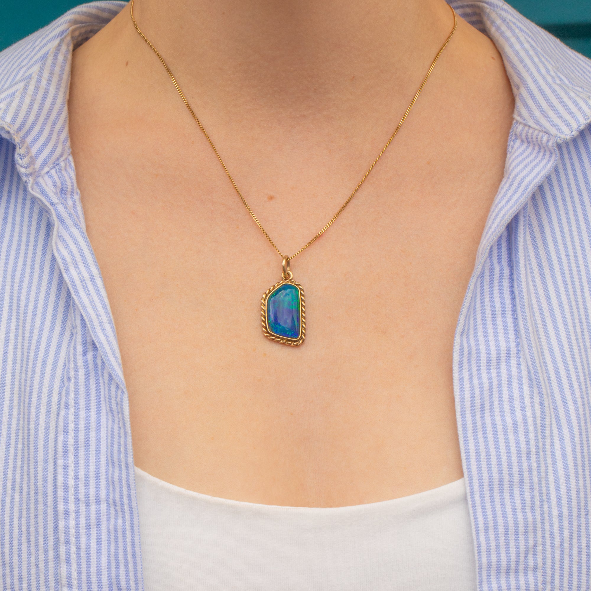 EXCELLENT. This Art Deco 9ct Gold black Opal doublet pendant is in excellent condition. The Opal is securely set, smooth to the touch, and has a divine display of colour! The 9ct Gold is buttery with the rope border securely soldered, and sitting flush against the skin.