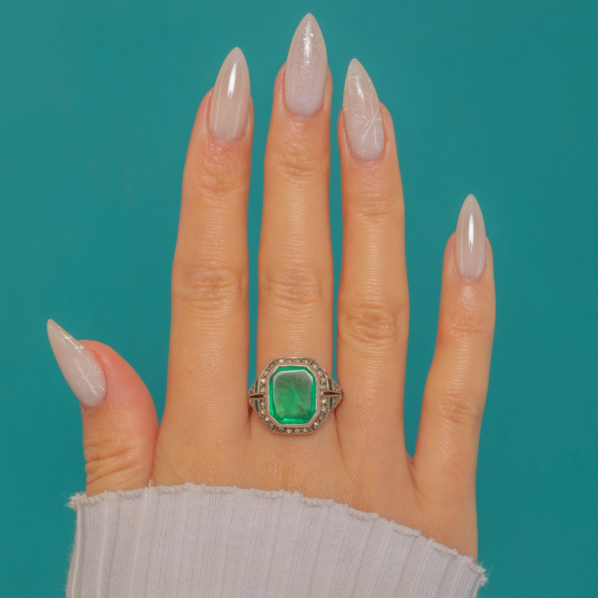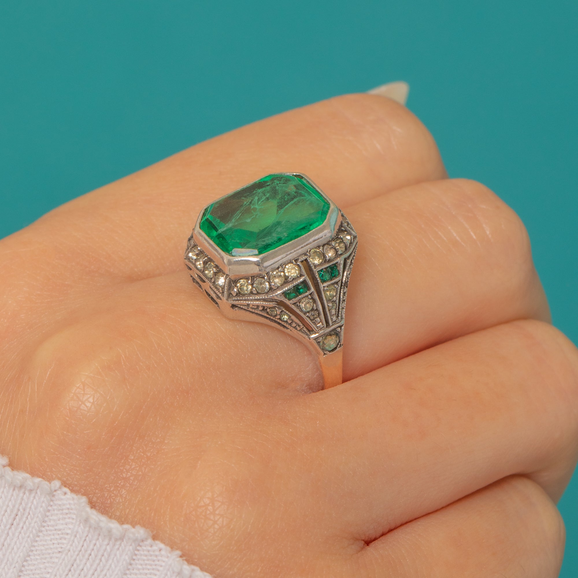The contrast of Silver to the 9ct Gold shank amplifies the piece’s bold, architectural feel, while green and white Paste accents at the shoulders nod to classic Deco symmetry. Elegant, graphic and glowing with colour, it’s a fabulous cocktail ring that makes an effortless statement.