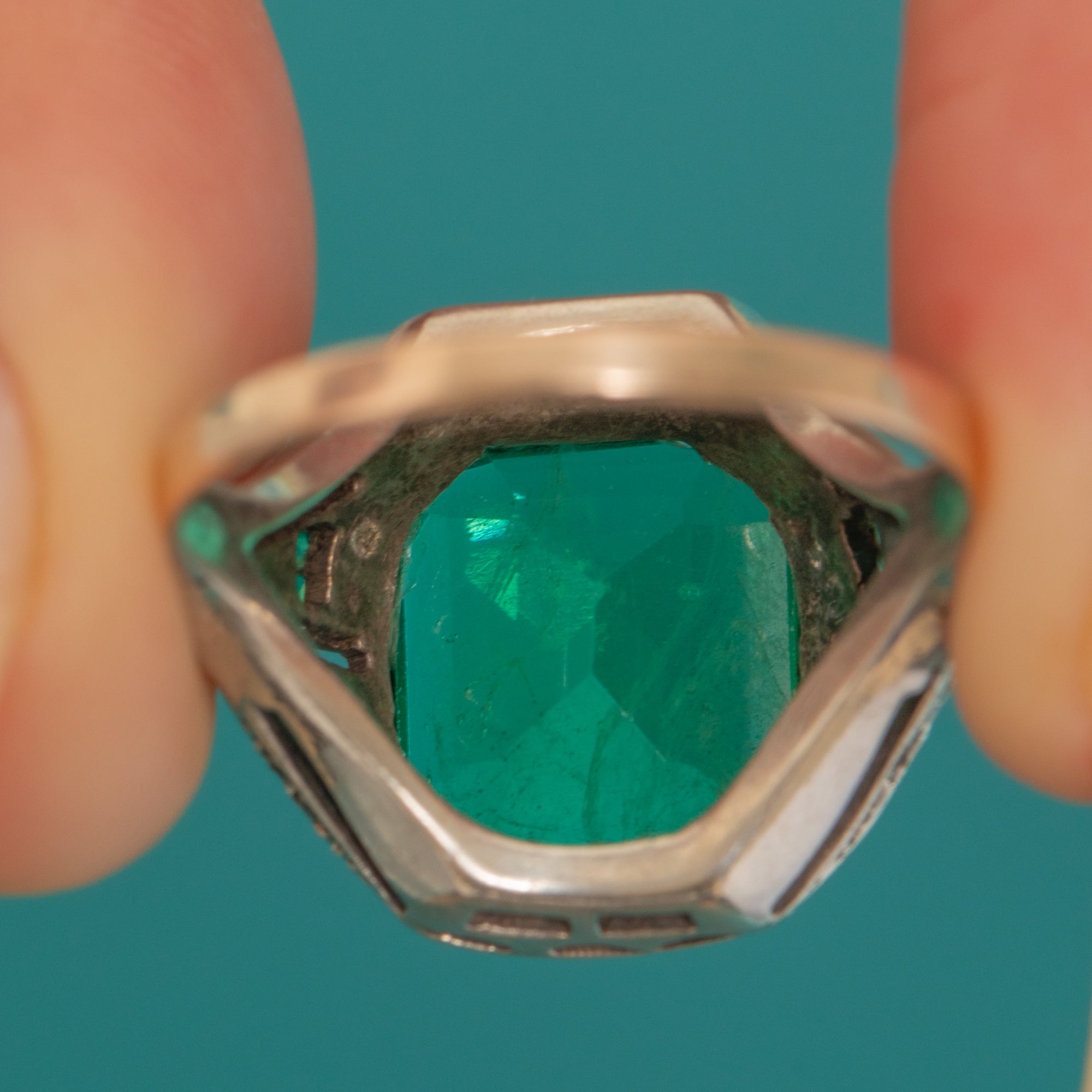 Sculptural and striking, this Art Deco two-tone ring showcases a vivid green Paste centre in a rub-over octagonal head. The Silver settings form an octagonal halo of dainty Diamond Paste with stepped, openwork shoulders that add wonderful depth and geometry.