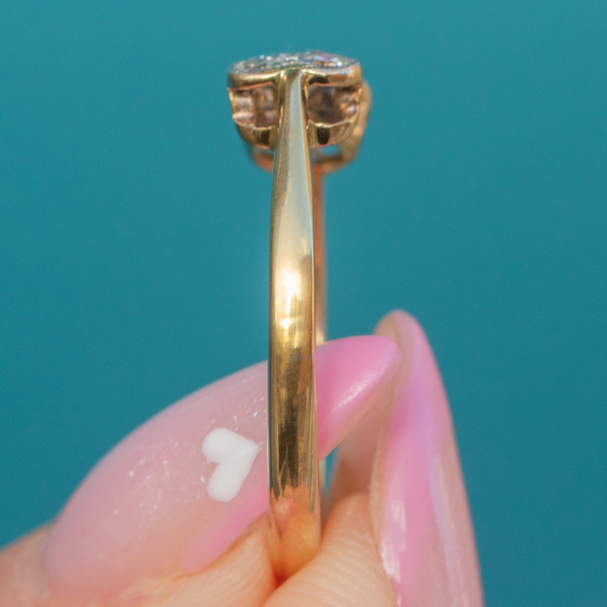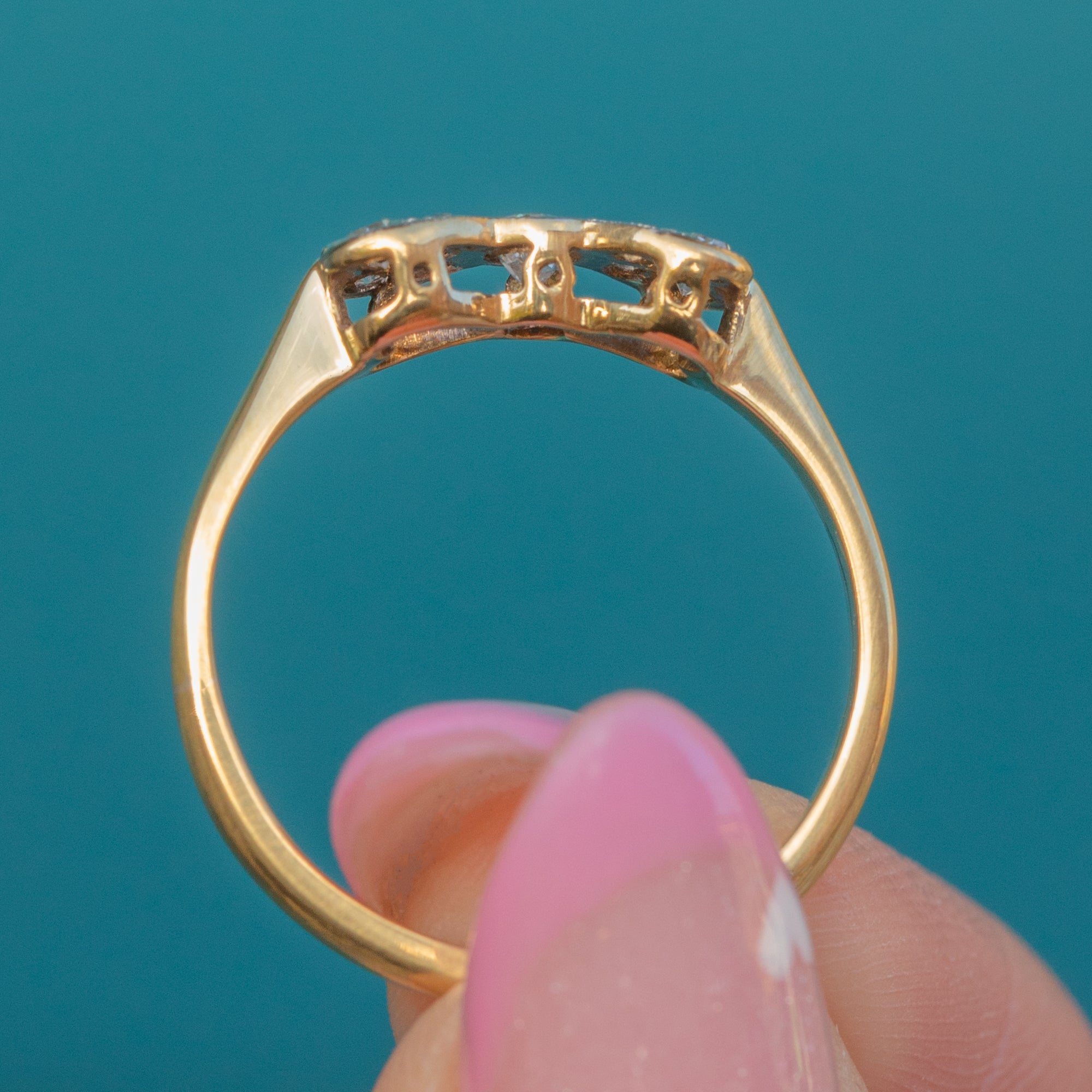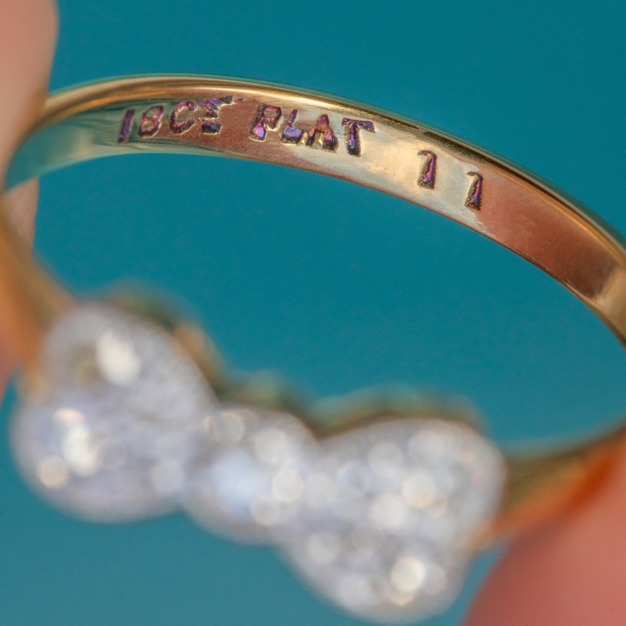 EXCELLENT: The Diamonds are bright and securely set, with no chips or abrasions. The Platinum bow and 18ct Gold band are in beautiful condition, showing minimal signs of wear consistent with age. The ring has been well cared for and remains crisp and full of vintage charm.