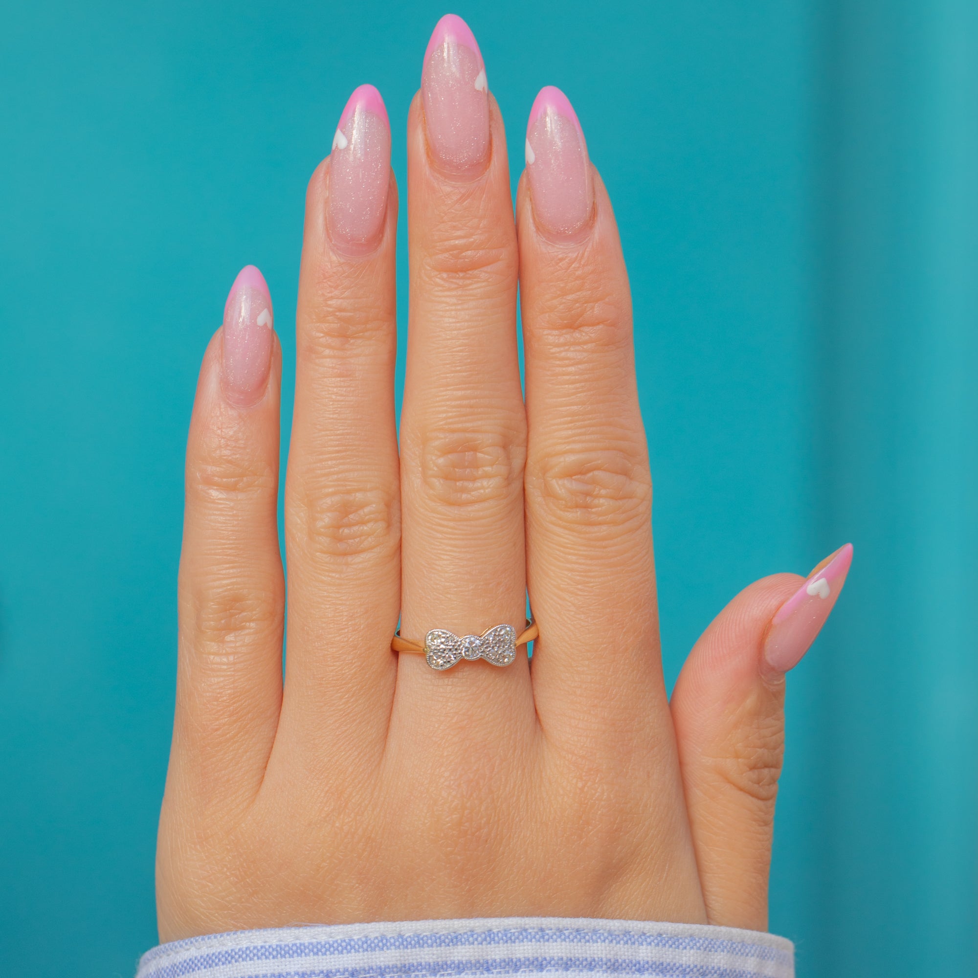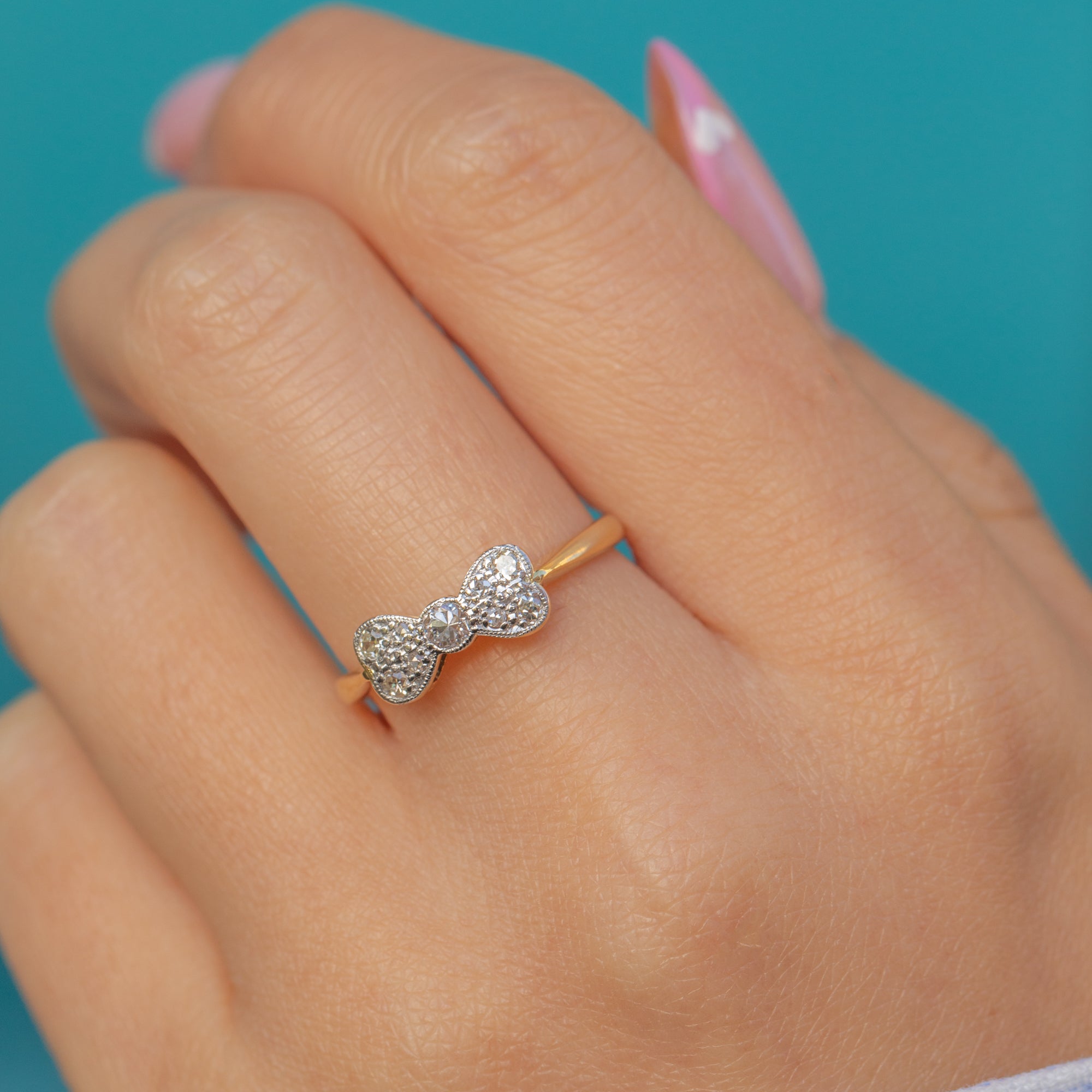 This charming Art Deco Diamond bow ring captures the refined glamour of the 1930s. The sculpted Platinum bow is set with twinkling Diamonds, perfectly poised atop a warm 18ct Gold band. The contrast between the icy sparkle of Platinum and the rich hue of Gold creates a timelessly elegant look.