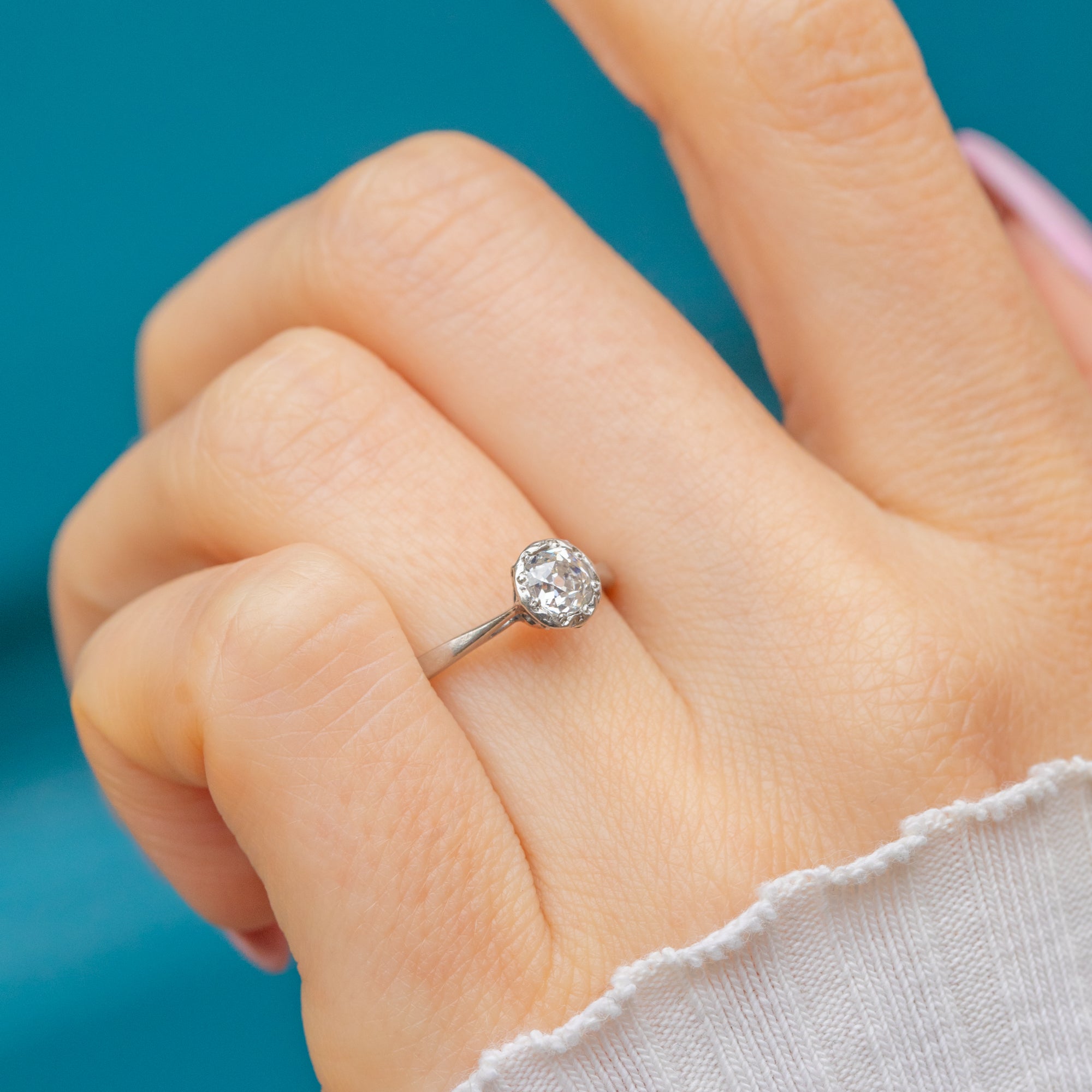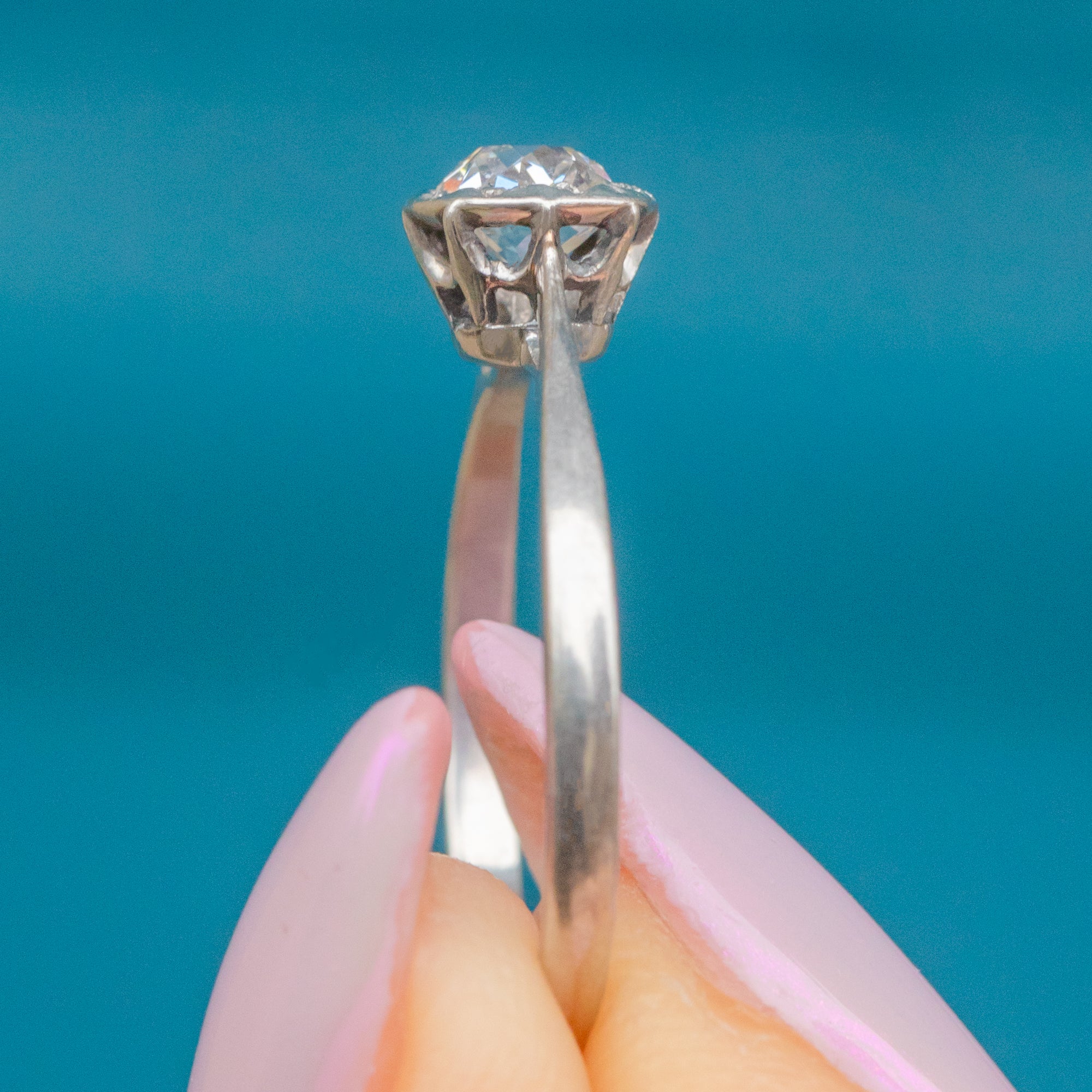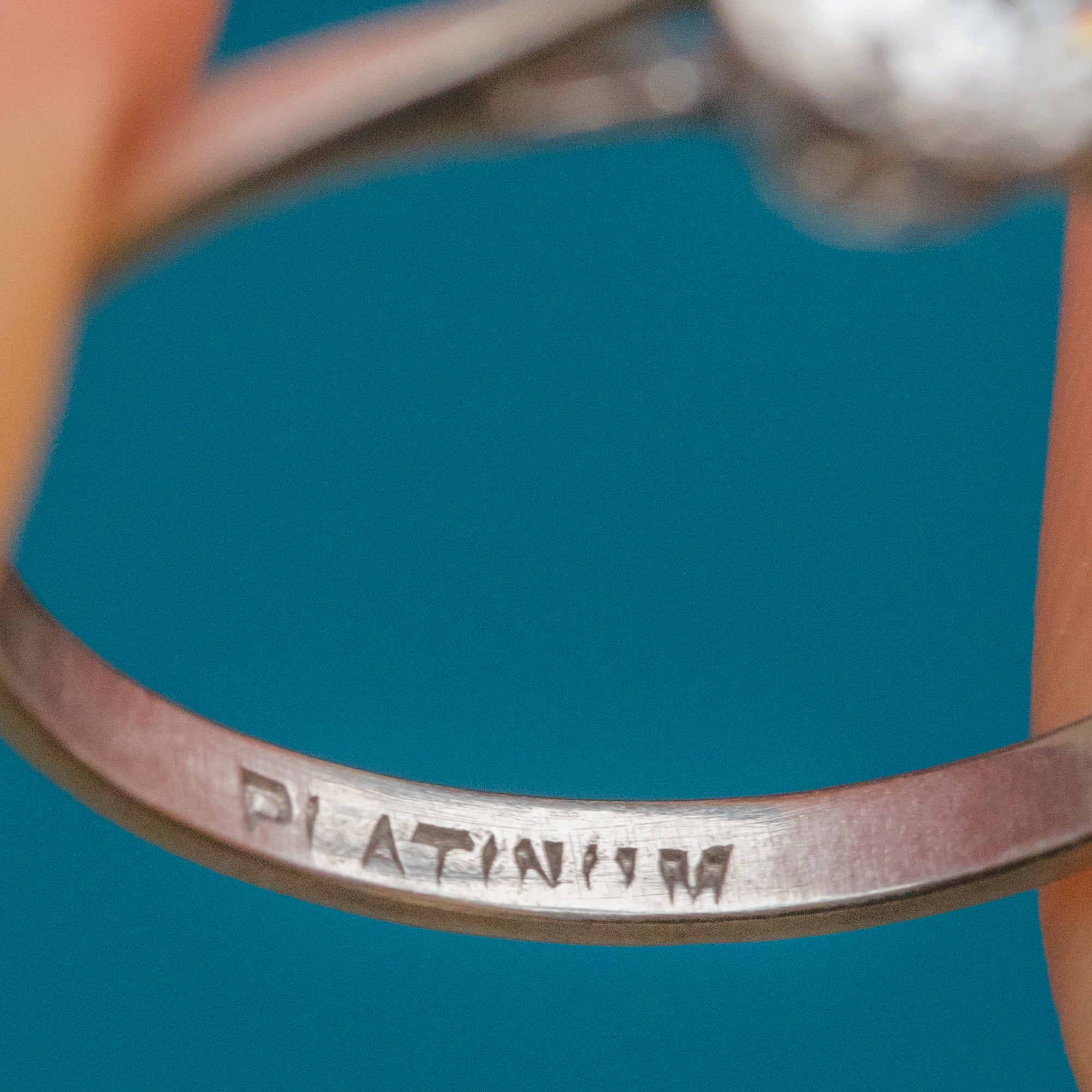 Stamped “PLATINUM” inside the band, this classic engagement ring exudes understated sophistication. Its cool, silvery tone and enduring design make it an ideal choice for those who appreciate vintage craftsmanship and everlasting style.
