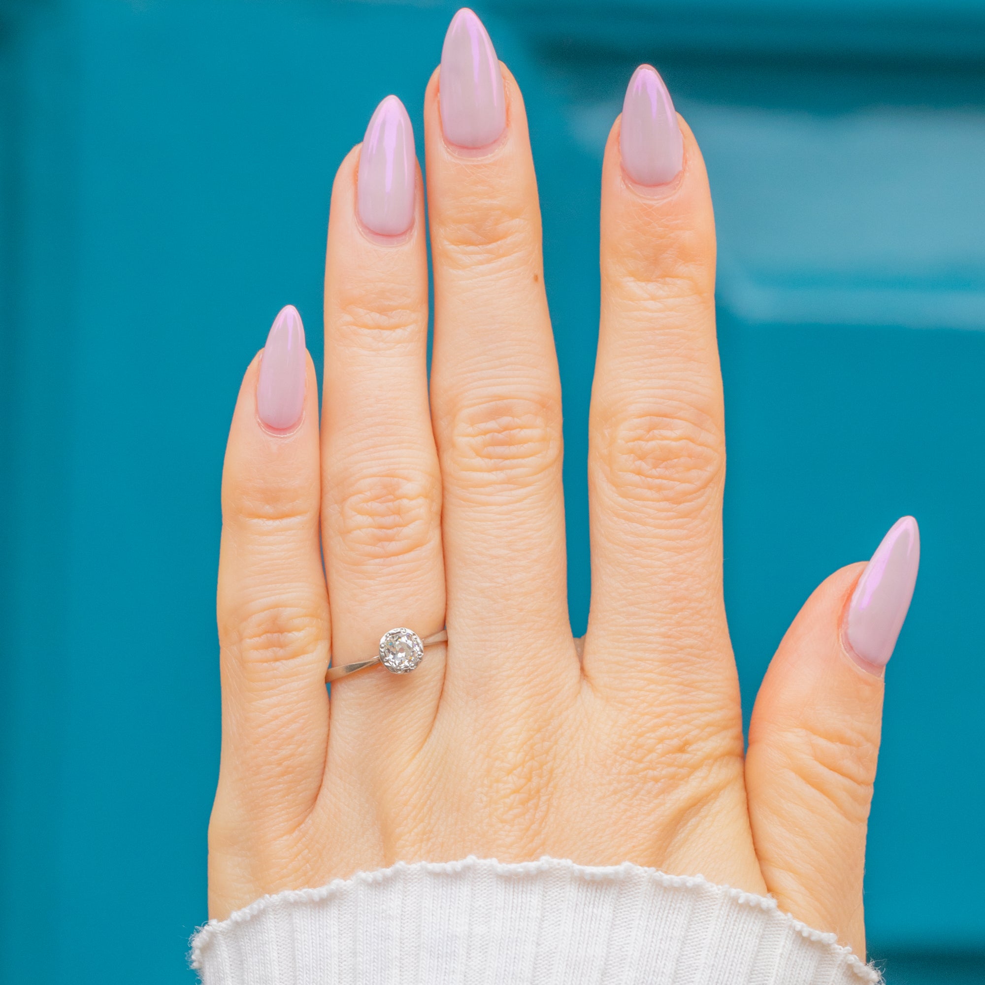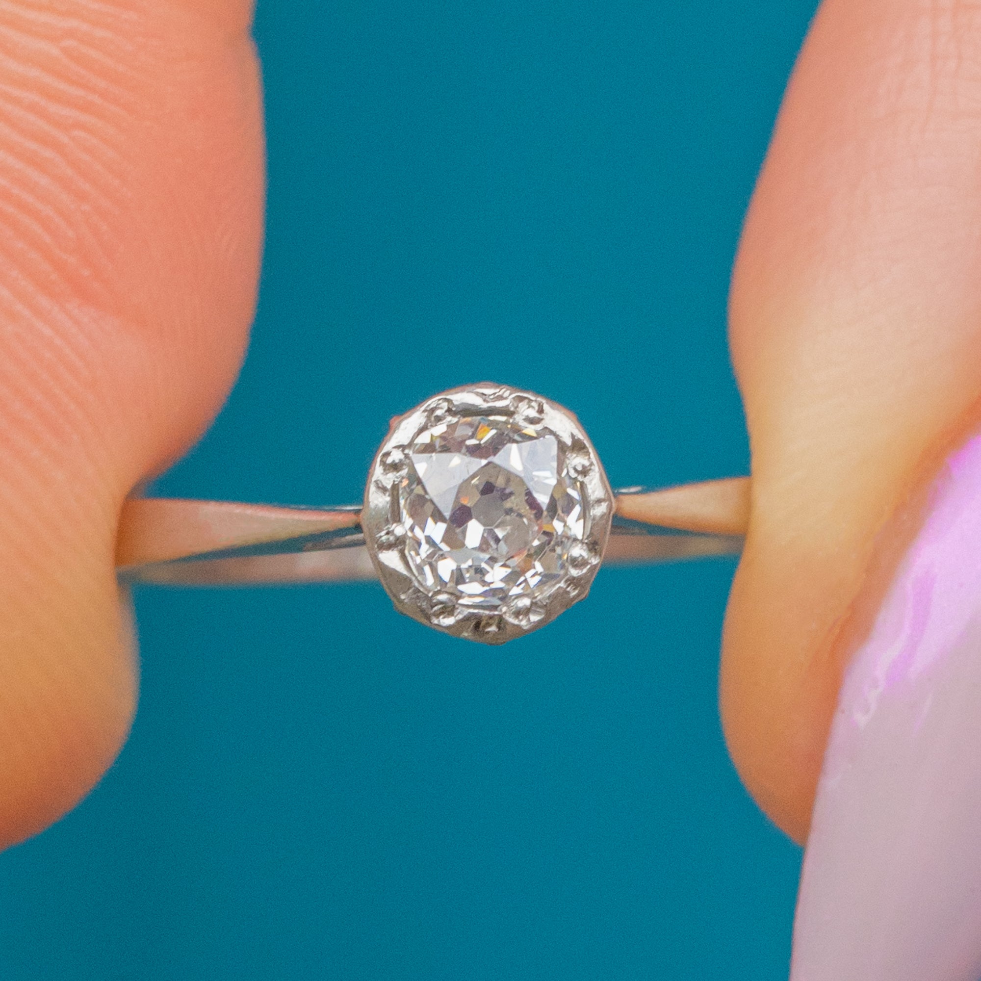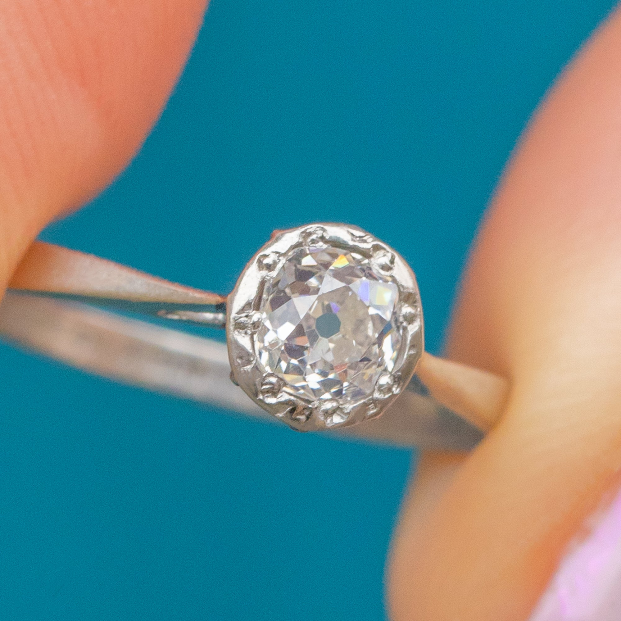 A timeless Art Deco Platinum solitaire ring set with a sparkling 0.40ct Diamond, full of life and fire. The clean, minimal lines and elegant proportions perfectly capture the refined simplicity of the 1920s, allowing the beautiful old-cut Diamond to take centre stage.