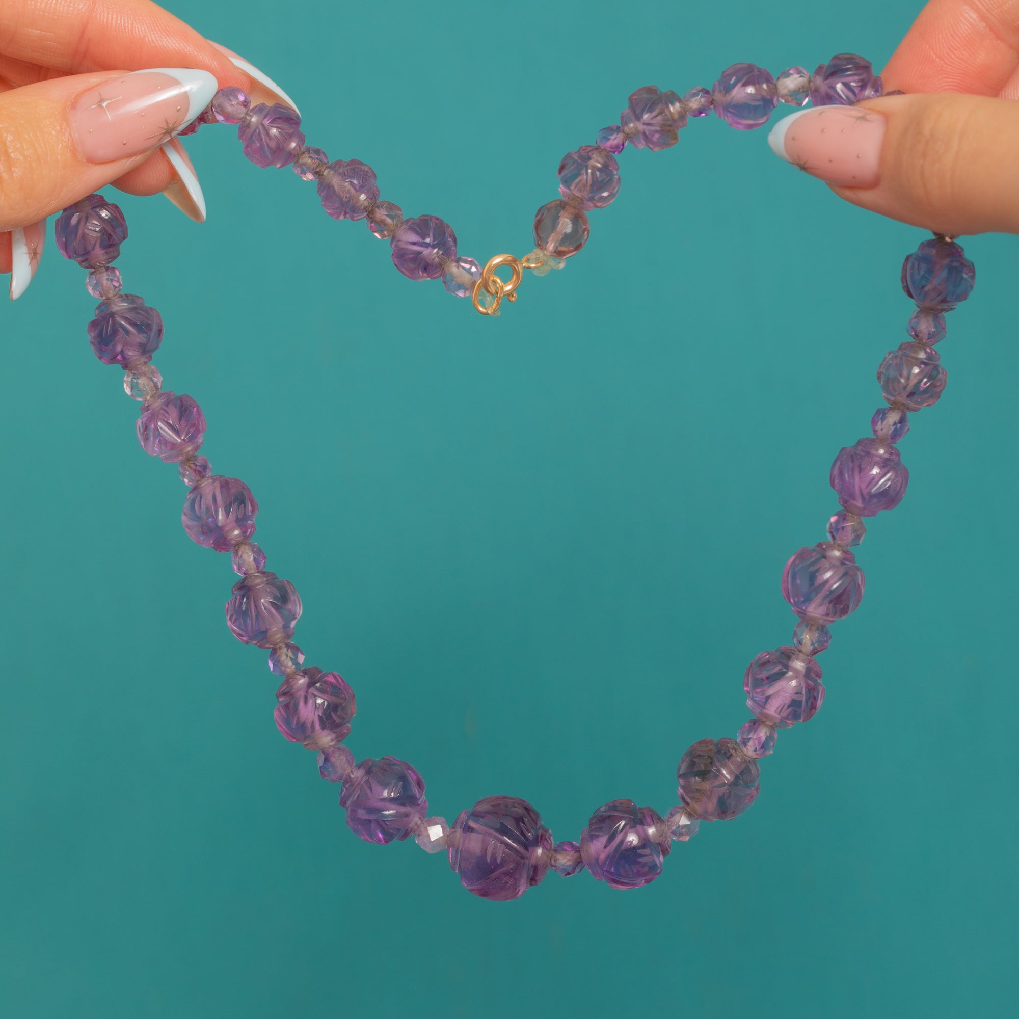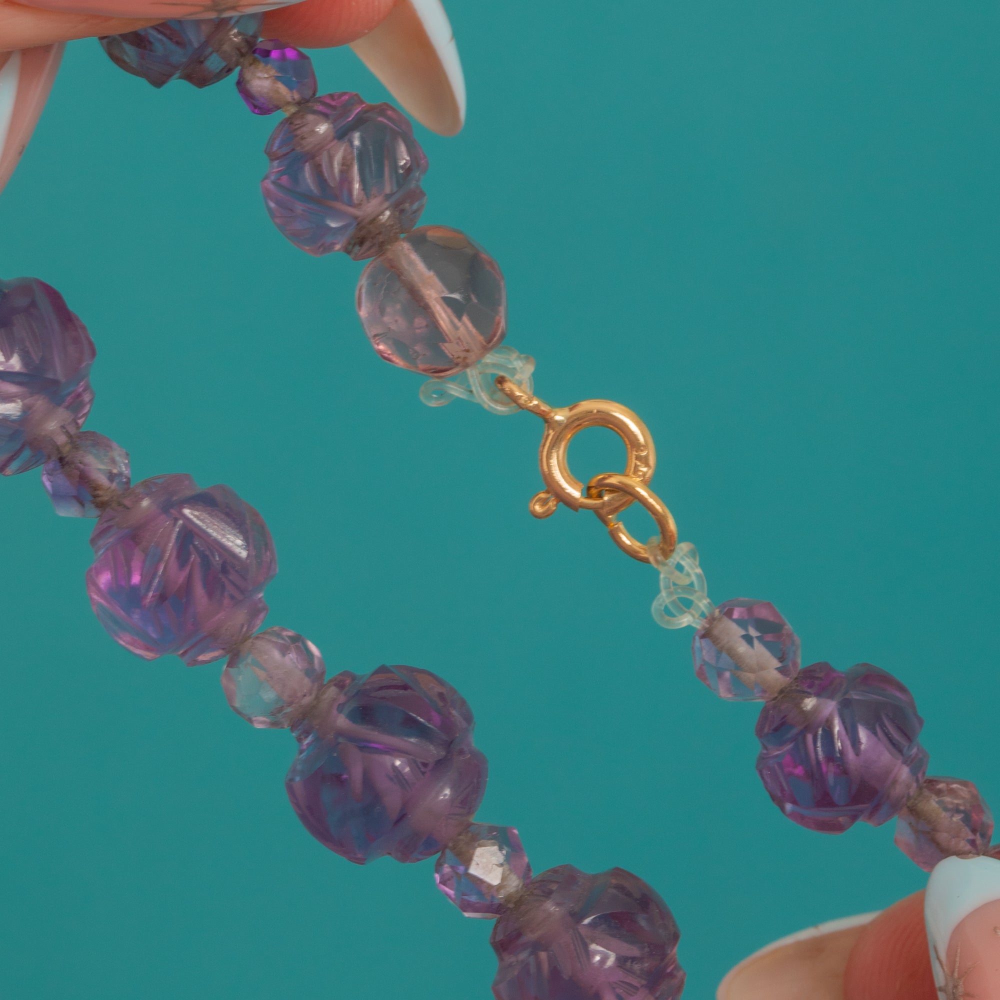 Short, chic, and effortlessly feminine, it’s finished with a 9ct Gold bolt-ring clasp stamped “375” — a later but tasteful addition that pairs perfectly with the vivid purple tones. A classic Deco strand with a fresh, elegant feel.