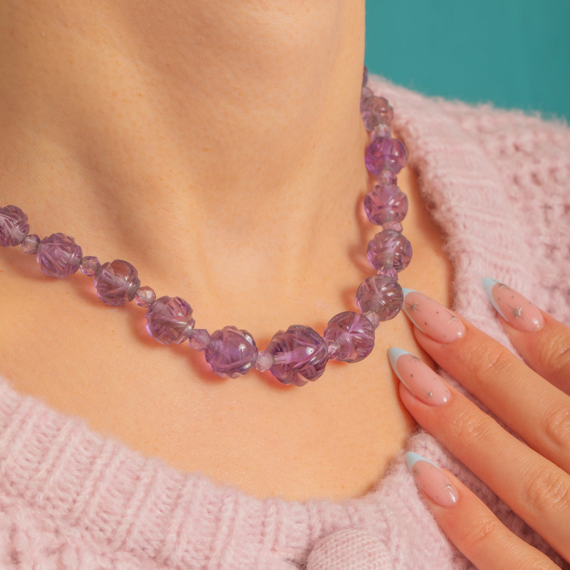 A sculptural Art Deco necklace composed of hand-carved Amethyst “melon” beads, gracefully graduated and punctuated by smaller faceted Amethyst spacers. The fluted carving reveals beautiful translucency and natural internal inclusions, and the alternating faceted beads lend a subtle sparkle that dances between each carved sphere.