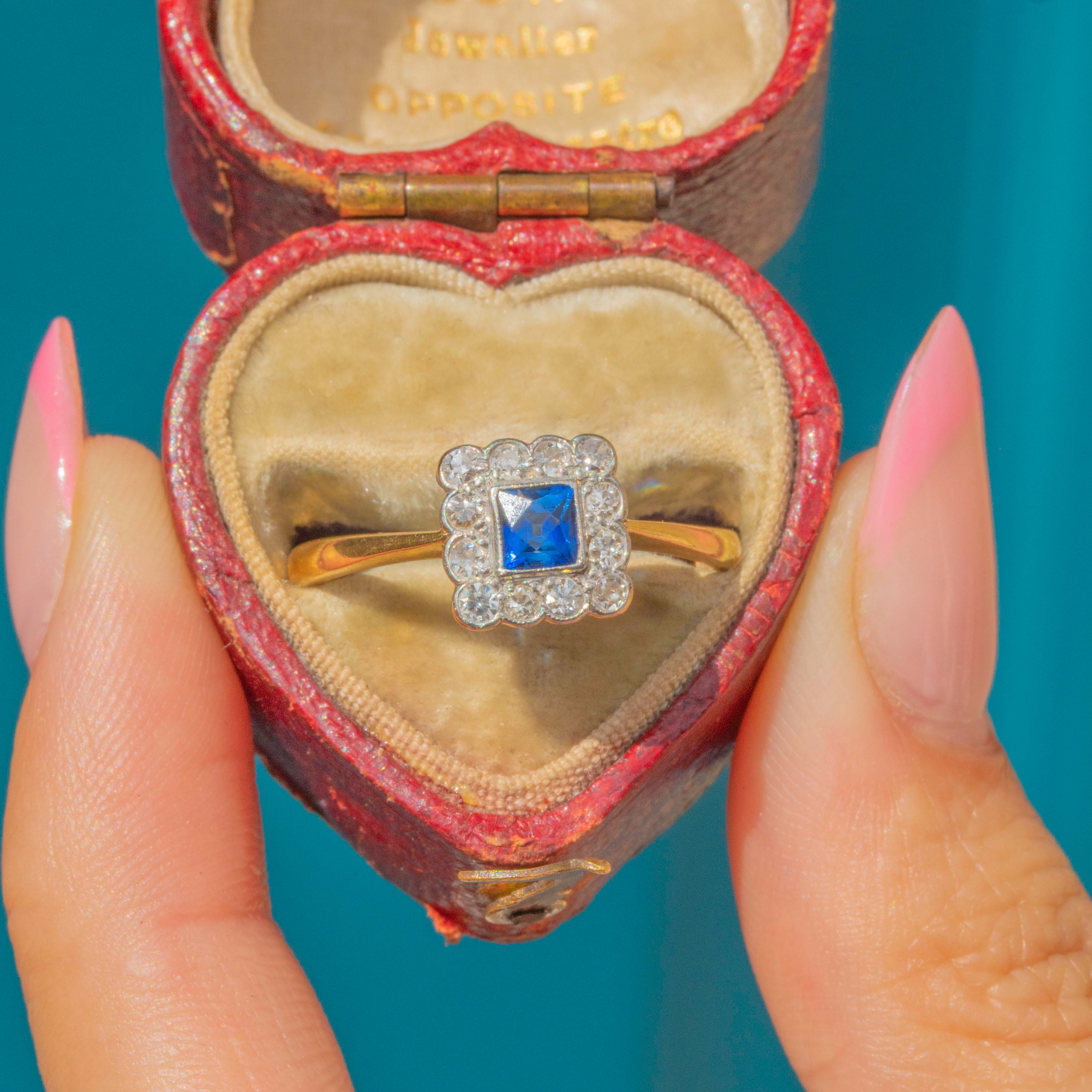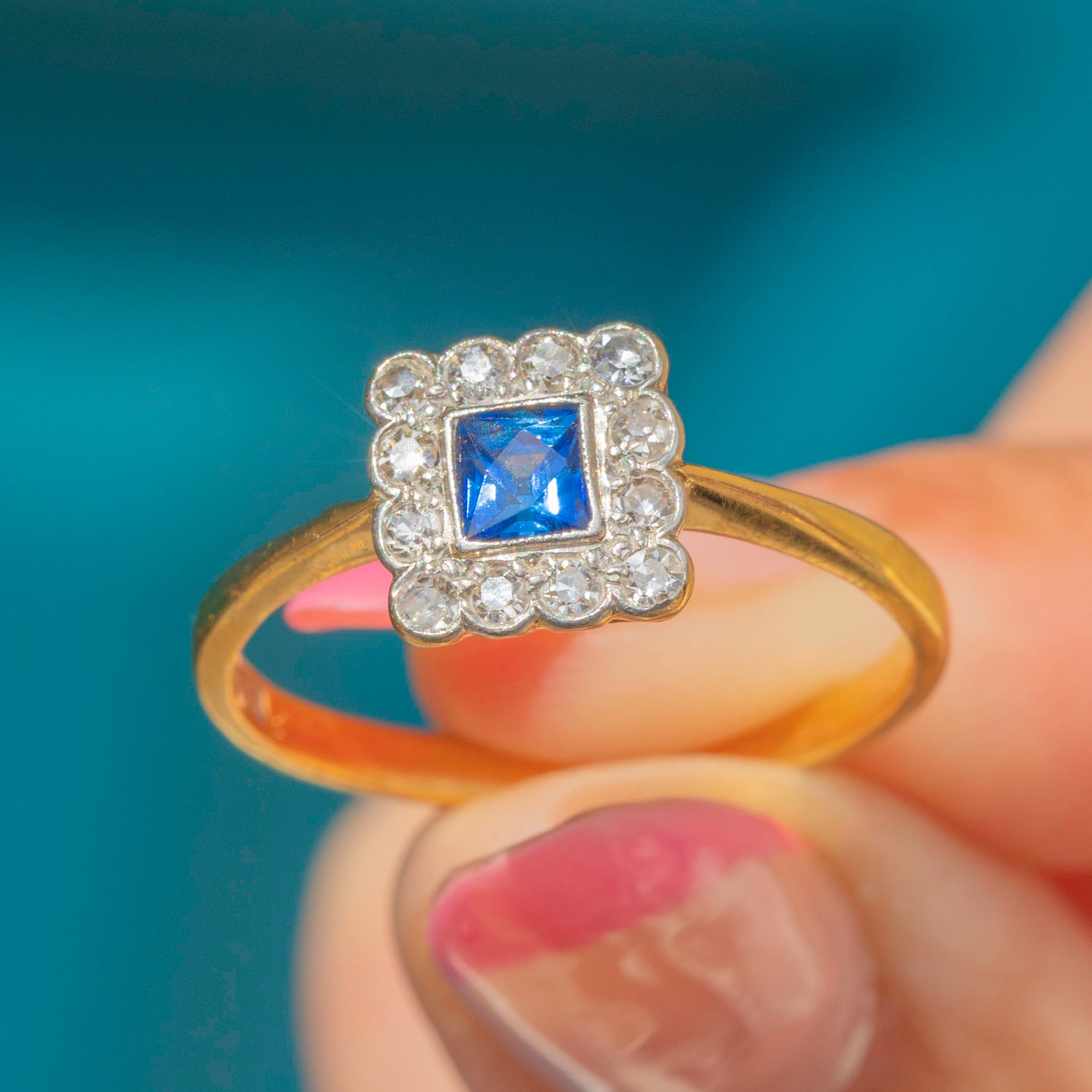 In her centre sits a gorgeous cerulean French-cut Sapphire, characterised by her cross-shaped facets. She is adorned by a cluster of scintillating Diamonds, beautifully arranged in a square formation in quintessential Art Deco style.