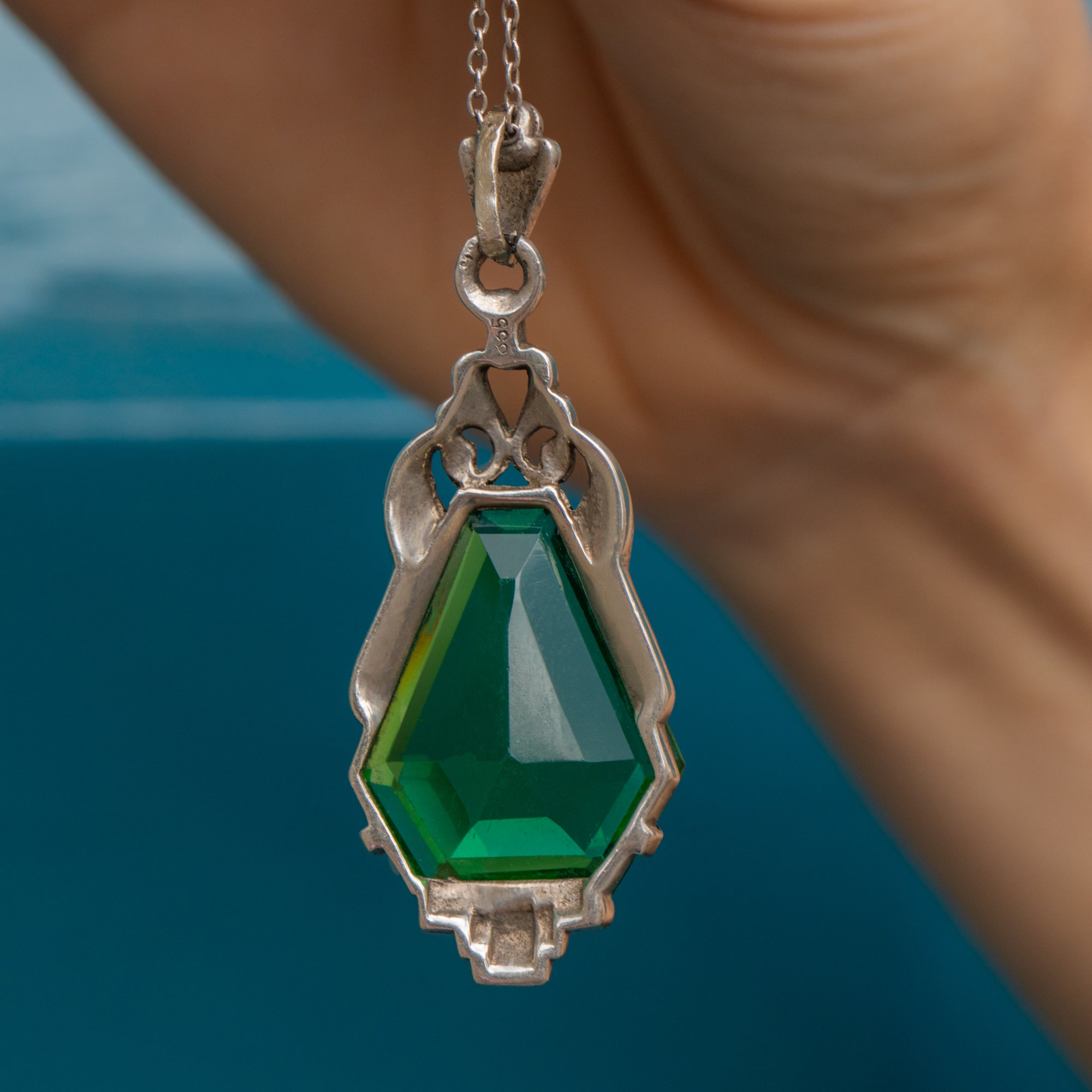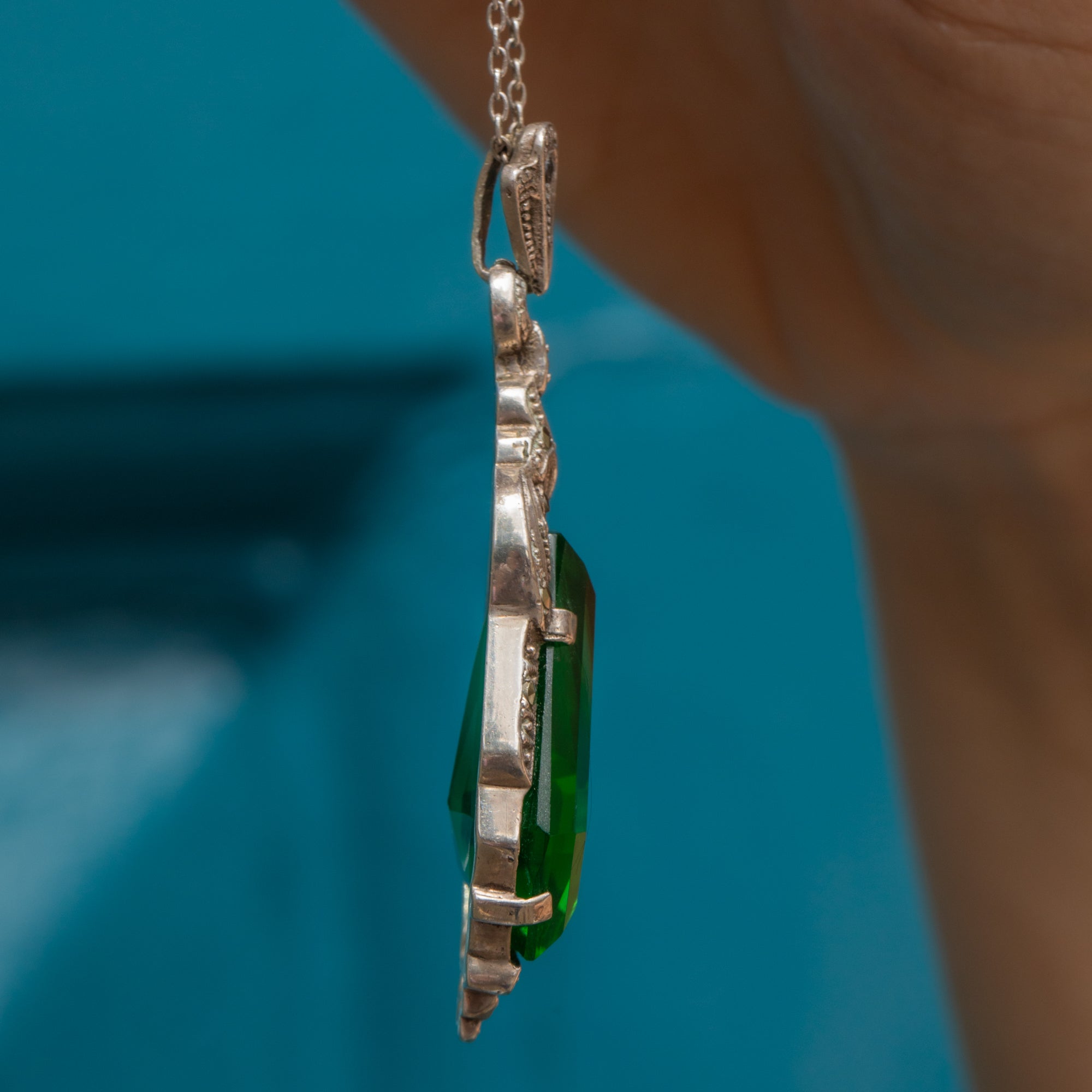 MATERIALS: 835 Silver pendant (likely European Silver), Sterling Silver chain, Green Paste, Marcasite.