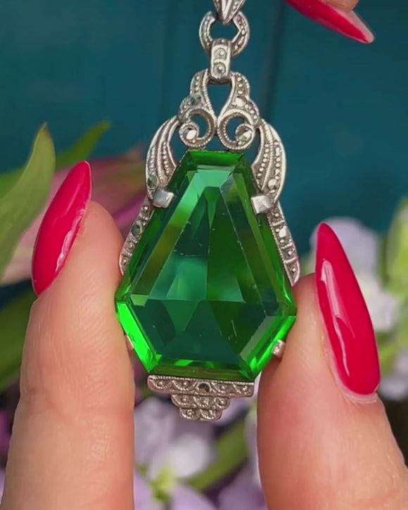 Art Deco Green Paste Marcasite Drop Pendant, with 18.5" Chain