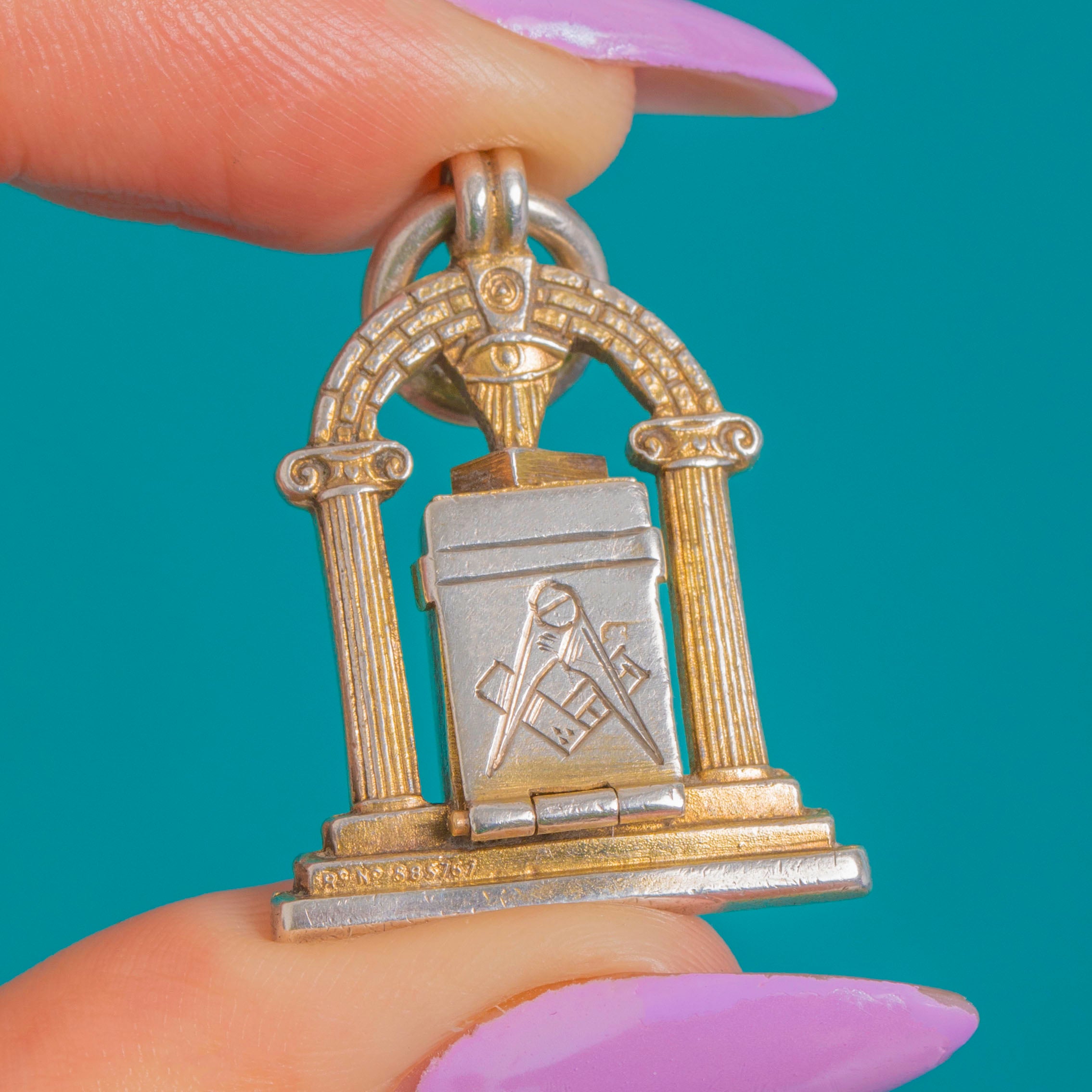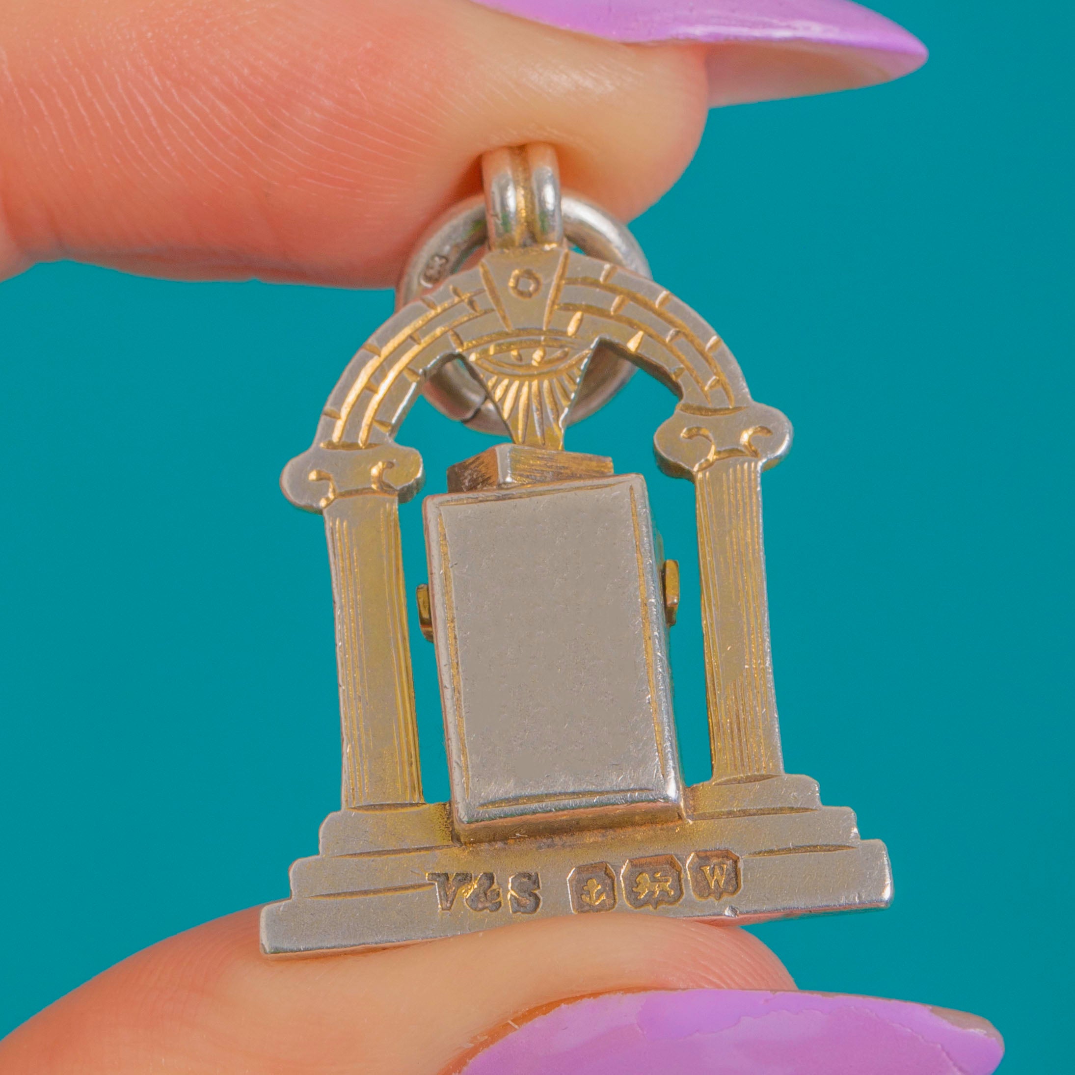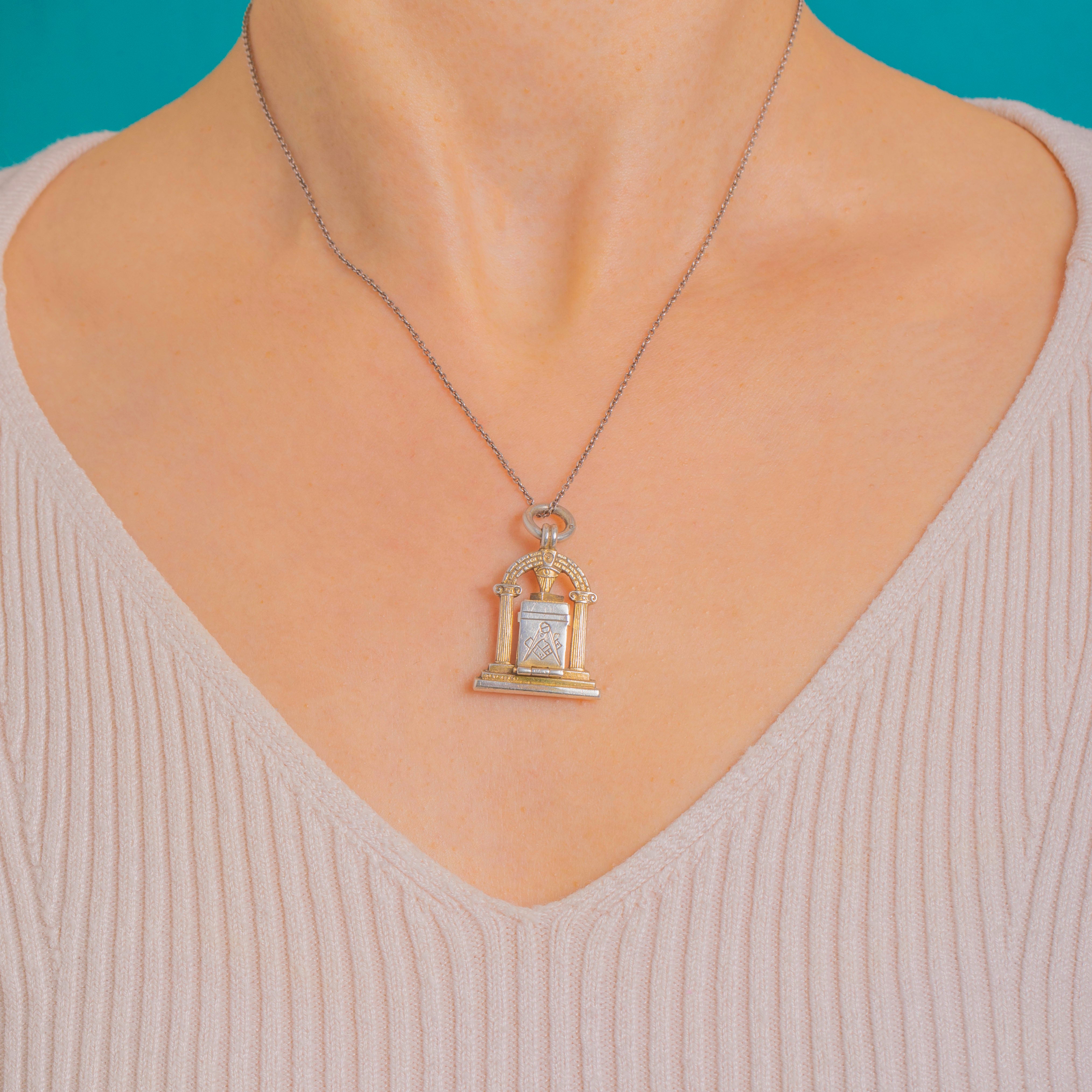 A beautifully detailed and authentic English Art Deco Masonic archway pendant, modelled as a miniature temple with fluted columns, a stepped plinth and an arched pediment crowned by an all‑seeing eye keystone. Fully hallmarked for Birmingham 1921 with maker’s mark V&S, it’s a characterful piece of fraternal history