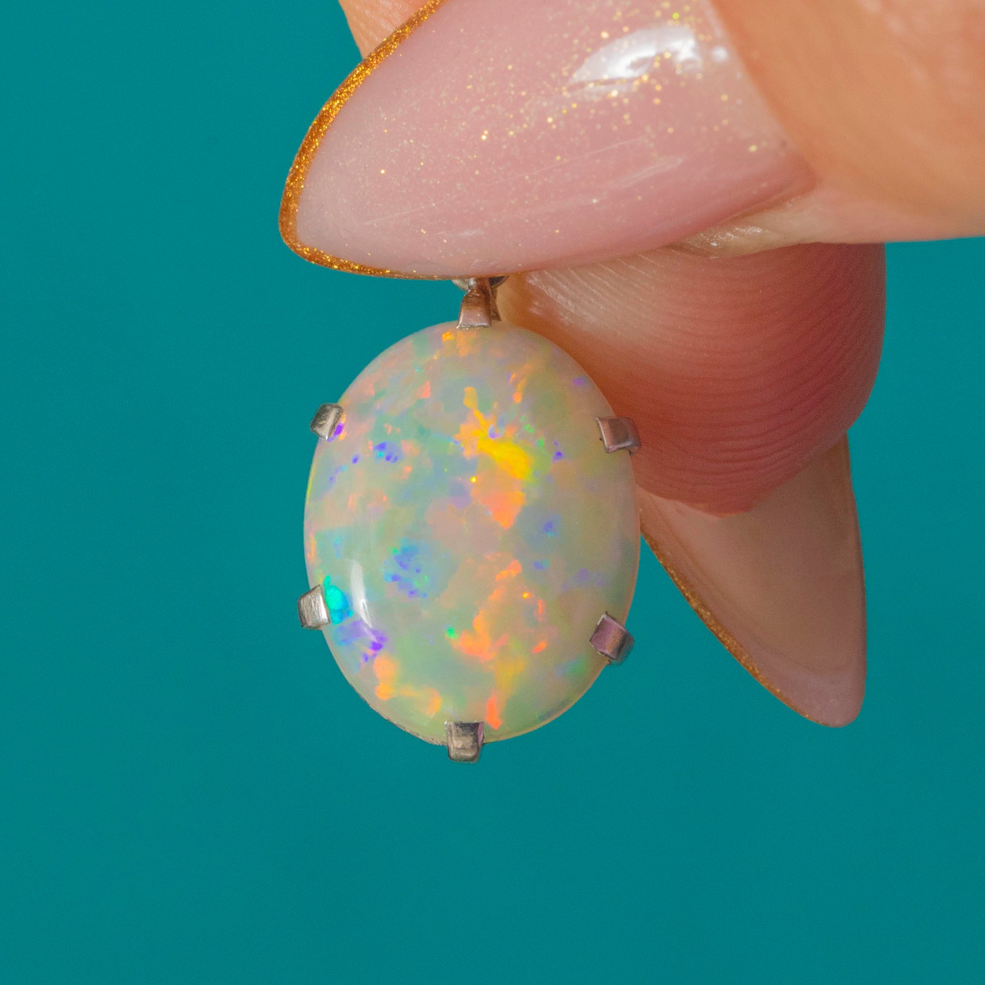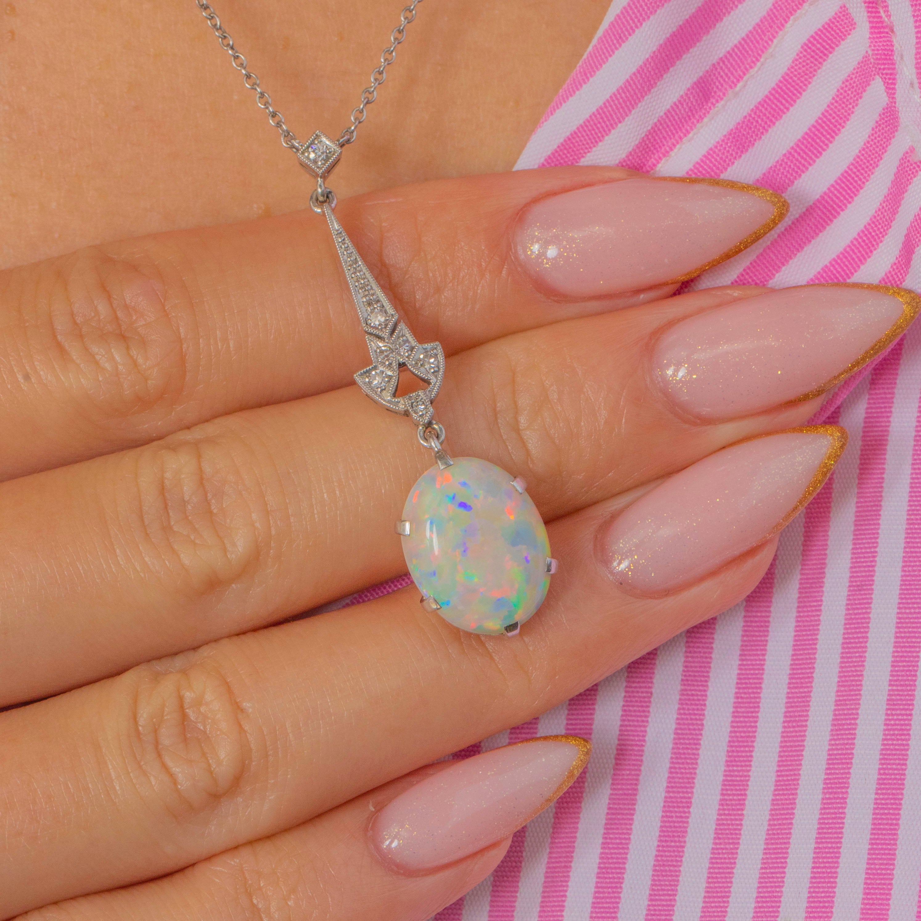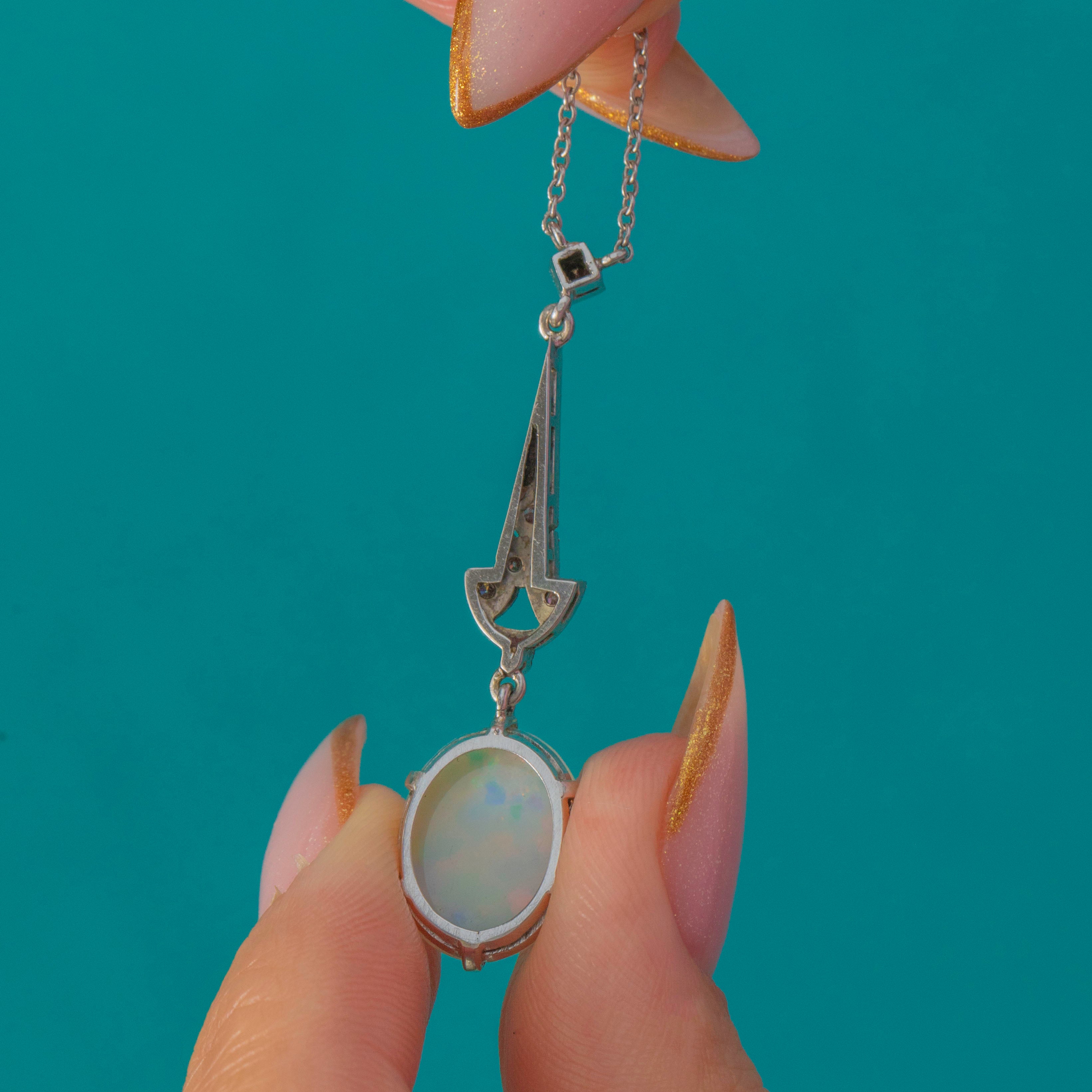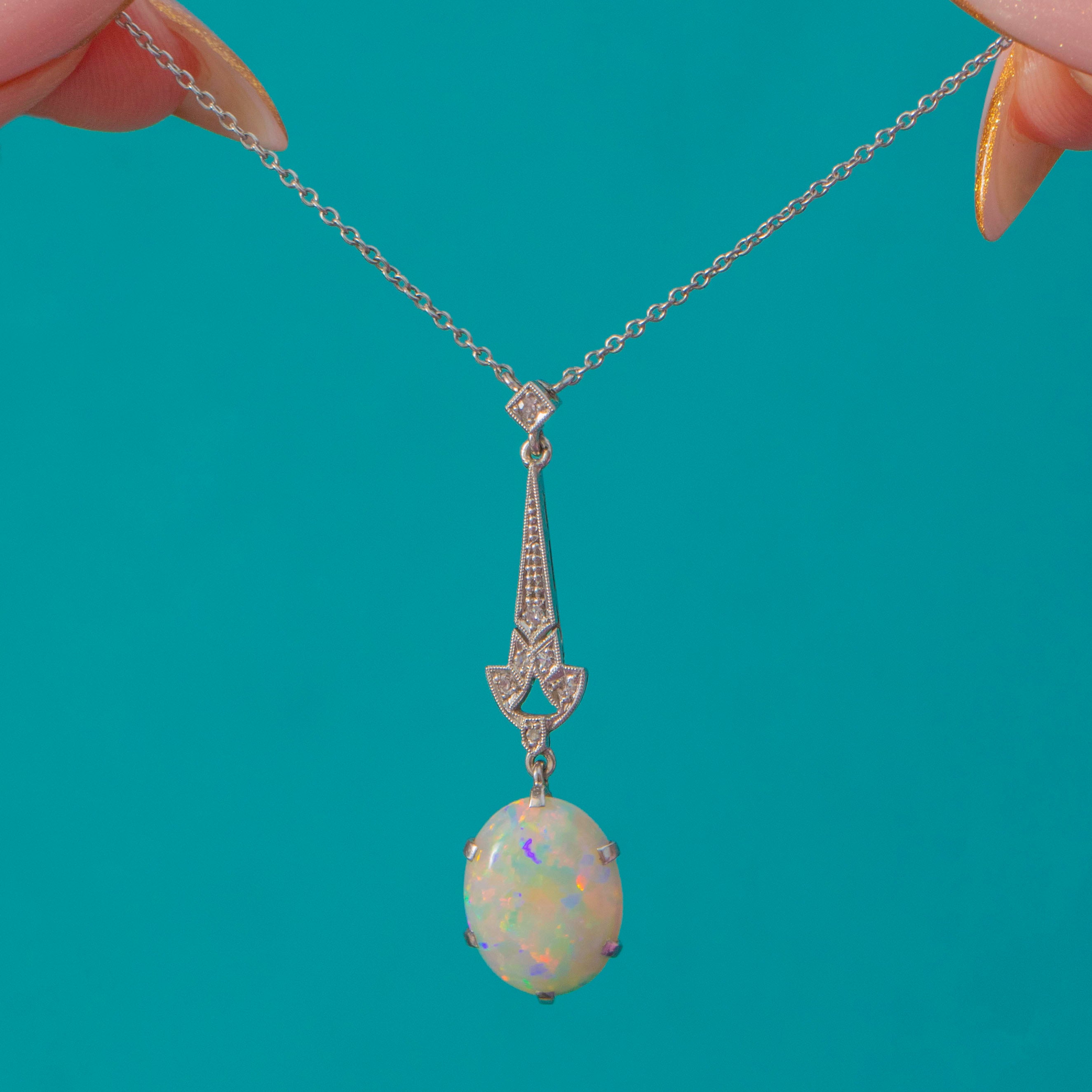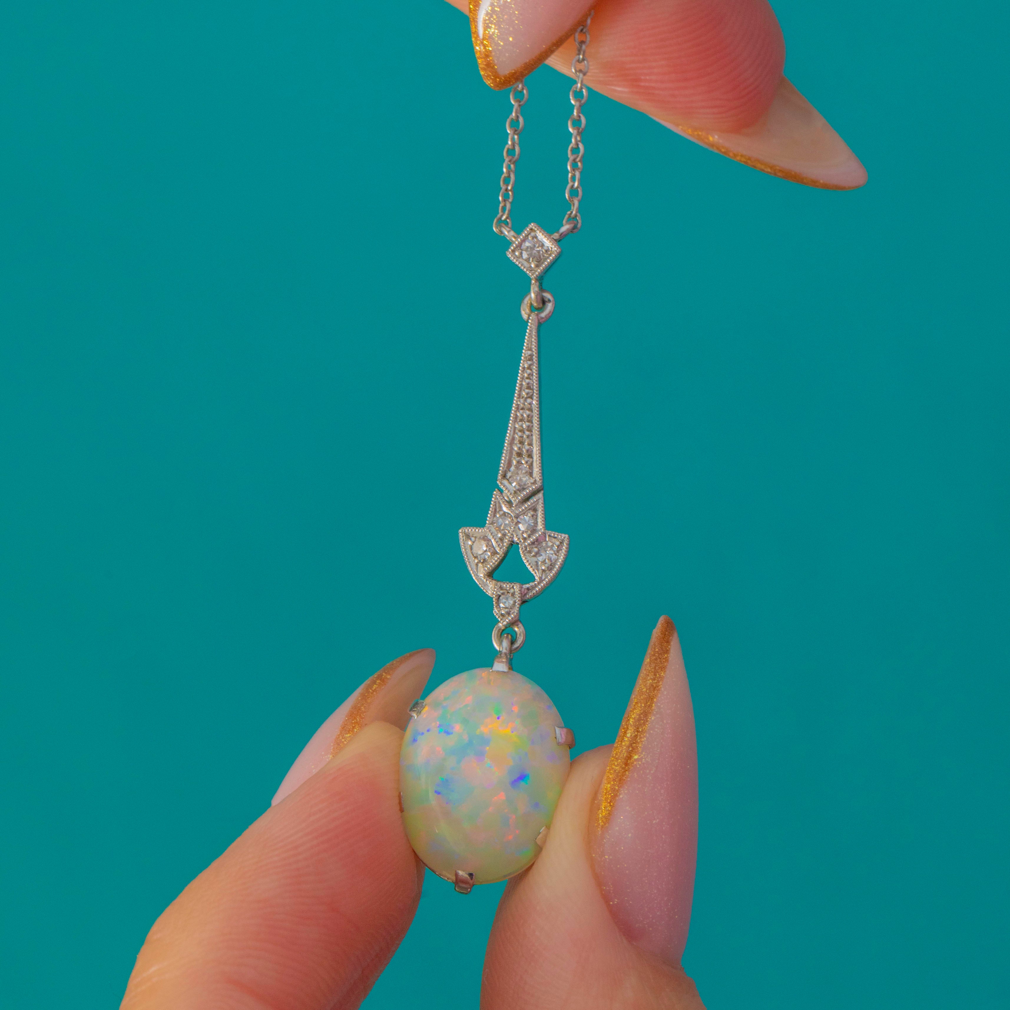 This stunning Art Deco Opal drop necklace is a perfect example of the elegance and refinement of the 1920s era. The shimmering Opal glows with soft pastel hues of blue, green and pink, beautifully complemented by sparkling antique Diamonds above.