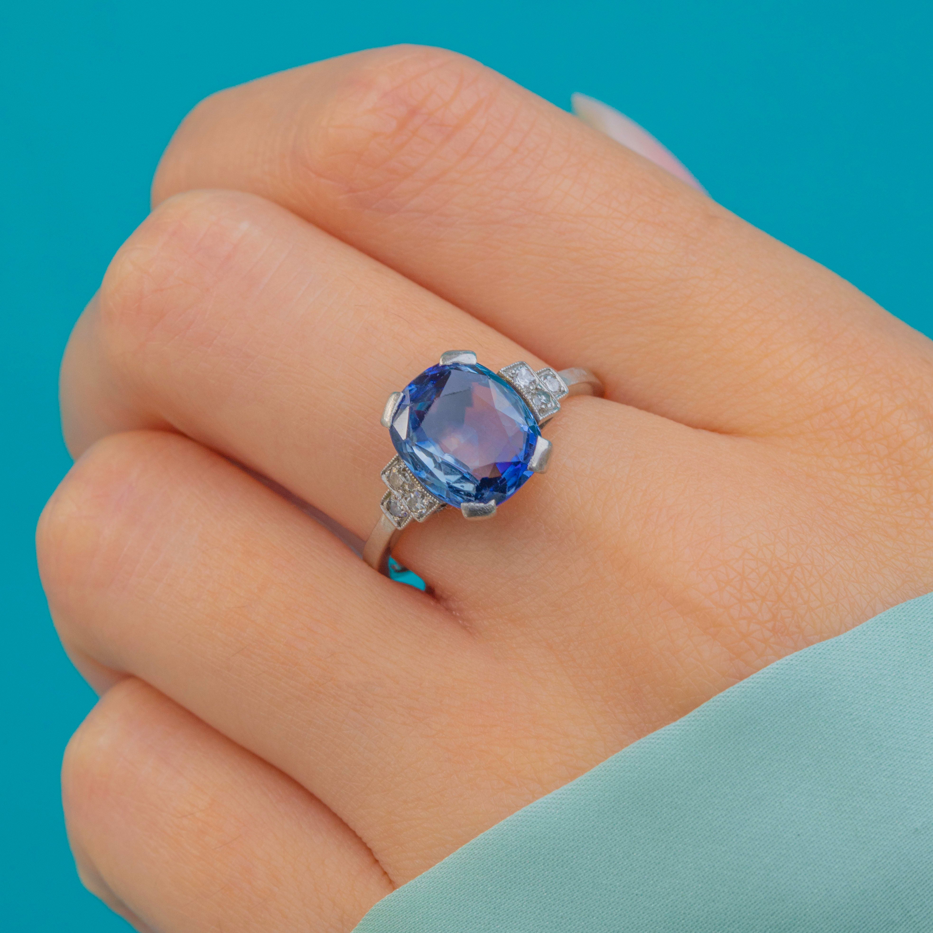 A striking Art Deco ring set in luxurious Platinum, starring a vivid blue natural Sapphire with beautiful, prominent colour zoning—so characteristic of fine natural stones. Framed by sparkling Diamond accents and elegant geometric shoulders, it’s a classic 1920s silhouette with wonderful presence on the hand.